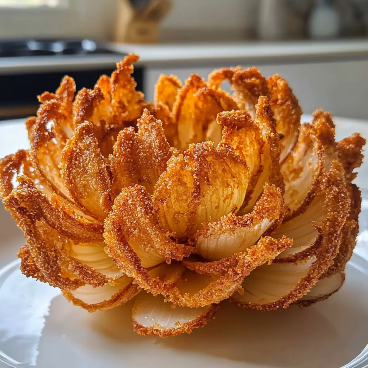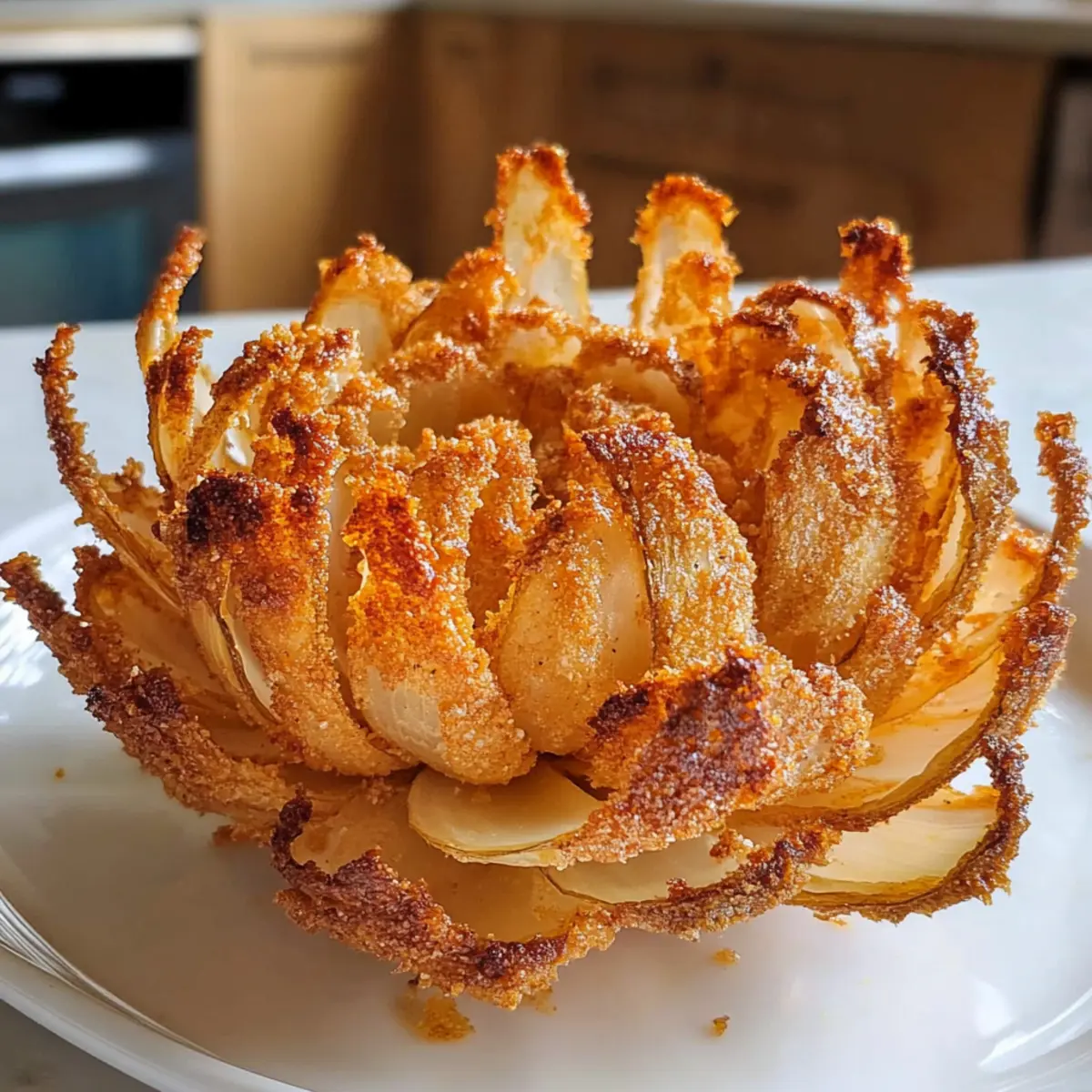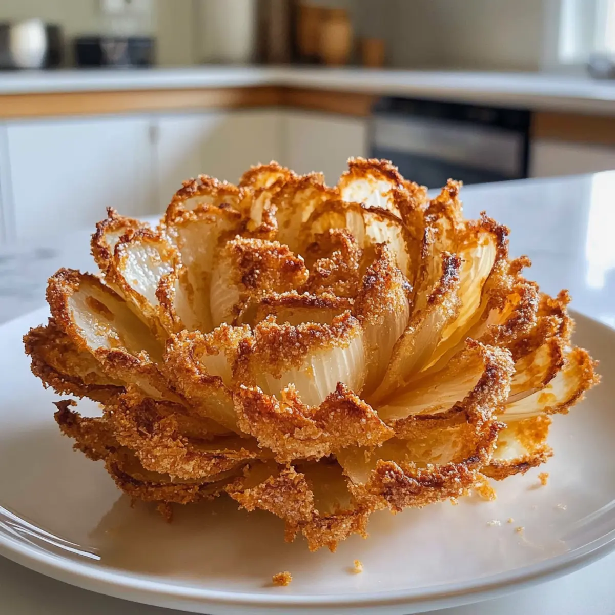 Es ist ein wundersamer Nachmittag, als ich zum ersten Mal die knusprige Heißluftfritteuse blühende Zwiebel aus dem Air Fryer zaubere. Die Vorfreude steigt, wenn sich die zarten Zwiebelblätter langsam trennen und die blumige Form zum Vorschein kommt. Diese köstliche Vorspeise ist nicht nur ein echter Hingucker, sondern auch bequem zuzubereiten. Dank der Heißluftfritteuse bleibt der gesamte Genuss ohne das überflüssige Öl einer Fritteuse erhalten, sodass wir uns ohne schlechtes Gewissen an diesem beliebten Snack erfreuen können. Egal, ob du sie als Appetizer bei deinem nächsten Dinner oder als schmackhaften Snack beim Filmabend servierst, die knusprige Textur und der vollmundige Geschmack werden deine Gäste überraschen. Neugierig auf die einfachen Schritte, um diese Delikatesse selbst zu kreieren? Warum wirst du diese Zwiebel lieben? Einfachheit: Die Zubereitung ist unkompliziert und benötigt nur grundlegende Kochfähigkeiten, perfekt für jeden in der Küche. Köstlicher Geschmack: Das Zusammenspiel von Gewürzen und Zwiebel sorgt für ein intensives Aroma, das deine Geschmacksnerven verführt. Gesunde Variante: Durch die Heißluftfritteuse genießt du den vollen Geschmack ohne das zusätzliche Fett einer traditionellen Fritteuse. Vielseitigkeit: Serviere sie als spektakuläre Vorspeise oder als knusprigen Snack zu deinem nächsten Filmabend – sie passt immer! Bei tollen Alternativen kannst du auch Knusprige Koreanische Teigtaschen ausprobieren. Einfache Variationen: Experimentiere mit verschiedenen Zwiebelarten oder Dips, um dein Geschmackserlebnis zu individuell zu gestalten! Knusprige Heißluftfritteuse Blühende Zwiebel Zutaten Für die Zwiebel Süße Zwiebel – sorgt für süßen Geschmack und schöne Karamellisierung. Am besten geeignet: Vidalia wegen des hohen Zuckergehalts. Für den Teig Allzweckmehl – sorgt für eine knusprige Kruste. Für eine glutenfreie Variante kann eine glutenfreie Mehlmischung verwendet werden. Eier – fungiert als Bindemittel für die Mehlbeschichtung. Kann durch ein Flachs-Ei (1 EL Leinsamenmehl + 2,5 EL Wasser) für eine vegane Option ersetzt werden. Für das Würzen Cayennepfeffer – verleiht eine warme Gewürznote. Optional, nach Geschmack anpassen. Gewürzsalz – hebt den Gesamtgeschmack hervor. Verwende eine beliebige Gewürzmischung nach Wahl. Für die Zubereitung Ölspray – sorgt dafür, dass die Zwiebel in der Heißluftfritteuse schön knusprig wird. Nicht sparen – Essentiell für die Knusprigkeit! Schritt-für-Schritt-Anleitung für die Knusprige Heißluftfritteuse Blühende Zwiebel Step 1: Zwiebel vorbereiten Schneide etwa 1,5 cm von der Oberseite der süßen Zwiebel ab. Mache mit einem scharfen Messer vertikale Schnitte rund um die Zwiebel, wobei du etwa 1,5 cm vom Wurzelende Abstand hältst, um die Blütenblätter zu formen. Achte darauf, dass die Zwiebel beim Schneiden stabil bleibt, um das perfekte Aussehen einer blühenden Zwiebel zu erhalten. Step 2: Zwiebelblätter trennen Trenne die Zwiebelblätter vorsichtig, um die Blühstruktur zu fördern. Halte die Zwiebel beim Trennen mit einer Hand fest und benutze die andere Hand, um die Blätter behutsam auseinanderzuziehen. Gehe dabei sanft vor, um die einzelnen Schichten nicht zu beschädigen, und lasse sie wie eine Blüte aufblühen. Step 3: In Mehl wälzen Lege die Zwiebel in eine Schüssel mit gewürztem Allzweckmehl. Rolle sie gründlich darin und achte darauf, dass das Mehl auch zwischen die Blätter gelangt. Dies sorgt für eine knusprige äußere Schicht. Kippe die Schüssel leicht zur Seite, um sicherzustellen, dass die Zwiebel gleichmäßig mit Mehl bedeckt ist und keine Stellen übersprungen werden. Step 4: In Ei-Wasch eintauchen Bereite eine Eimischung in einer separaten Schüssel vor, indem du die Eier gut verquirlst. Tauche die bemehlte Zwiebel in die Eimischung ein und lasse die überschüssige Flüssigkeit abtropfen. Diese Schicht sorgt dafür, dass das Mehl beim Frittieren gut haftet und eine köstliche Kruste entsteht. Step 5: Erneut in Mehl wälzen Nachdem du die Zwiebel in die Eimischung getaucht hast, rolle sie noch einmal in der Schüssel mit dem gewürzten Mehl. Diese doppelte Beschichtung ist der Schlüssel zur knusprigen Textur der Knusprigen Heißluftfritteuse Blühenden Zwiebel. Stelle sicher, dass die Zwiebel vollständig bedeckt ist, um ein optimales Ergebnis zu erzielen. Step 6: Heißluftfritteuse vorheizen Heize die Heißluftfritteuse auf 190 °C vor. Dies sorgt dafür, dass die Zwiebel beim Frittieren sofort knusprig wird. Nutze die Zeit, um die bemehlte und beschichtete Zwiebel leicht mit Ölspray einzusprühen, damit sie eine schöne goldene Farbe erhält und perfekt knusprig wird. Step 7: Frittieren Lege die vorbereitete Zwiebel vorsichtig in die Heißluftfritteuse und frittiere sie für 12 bis 15 Minuten. Überprüfe die Zwiebel nach der Hälfte der Garzeit, um sicherzustellen, dass die Blätter nicht aneinander kleben bleiben. Ein schönes goldbraunes Aussehen zeigt an, dass deine Knusprige Heißluftfritteuse Blühende Zwiebel fertig ist und bereit zum Servieren ist. Aufbewahrungstipps für Knusprige Heißluftfritteuse Blühende Zwiebel Raumtemperatur: Genießen Sie die Zwiebel frisch für den besten Geschmack; bei Raumtemperatur sollte sie nicht länger als 1 Stunde stehen bleiben. Kühlschrank: Lagern Sie die übrig gebliebene Knusprige Heißluftfritteuse Blühende Zwiebel in einem luftdichten Behälter im Kühlschrank für bis zu 2 Tage. Aufwärmen: Um die Knusprigkeit wiederherzustellen, heizen Sie den Air Fryer auf 180 °C vor und erwärmen Sie die Zwiebel 3-5 Minuten lang. Einfrieren: Es wird nicht empfohlen, die Zwiebel einzufrieren, da die Textur und der Geschmack beeinträchtigt werden können. Genießen Sie sie lieber frisch! Meal Prep für die Knusprige Heißluftfritteuse Blühende Zwiebel Die knusprige Heißluftfritteuse blühende Zwiebel ist eine hervorragende Wahl für alle, die ihre Mahlzeiten im Voraus planen möchten