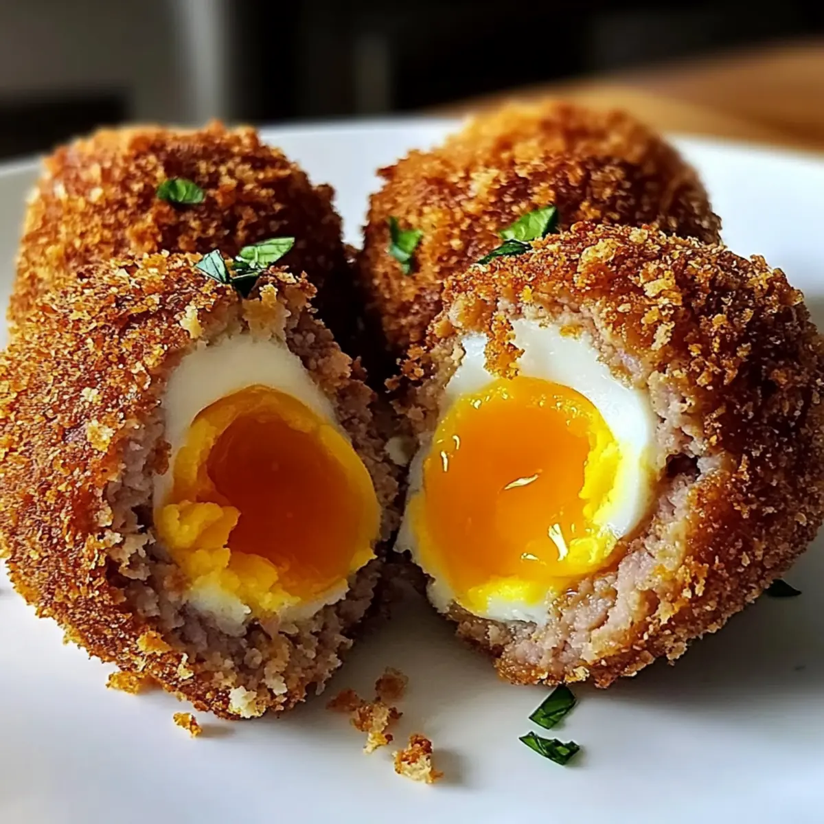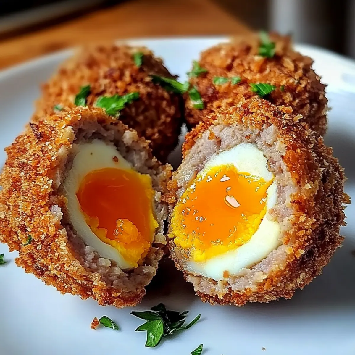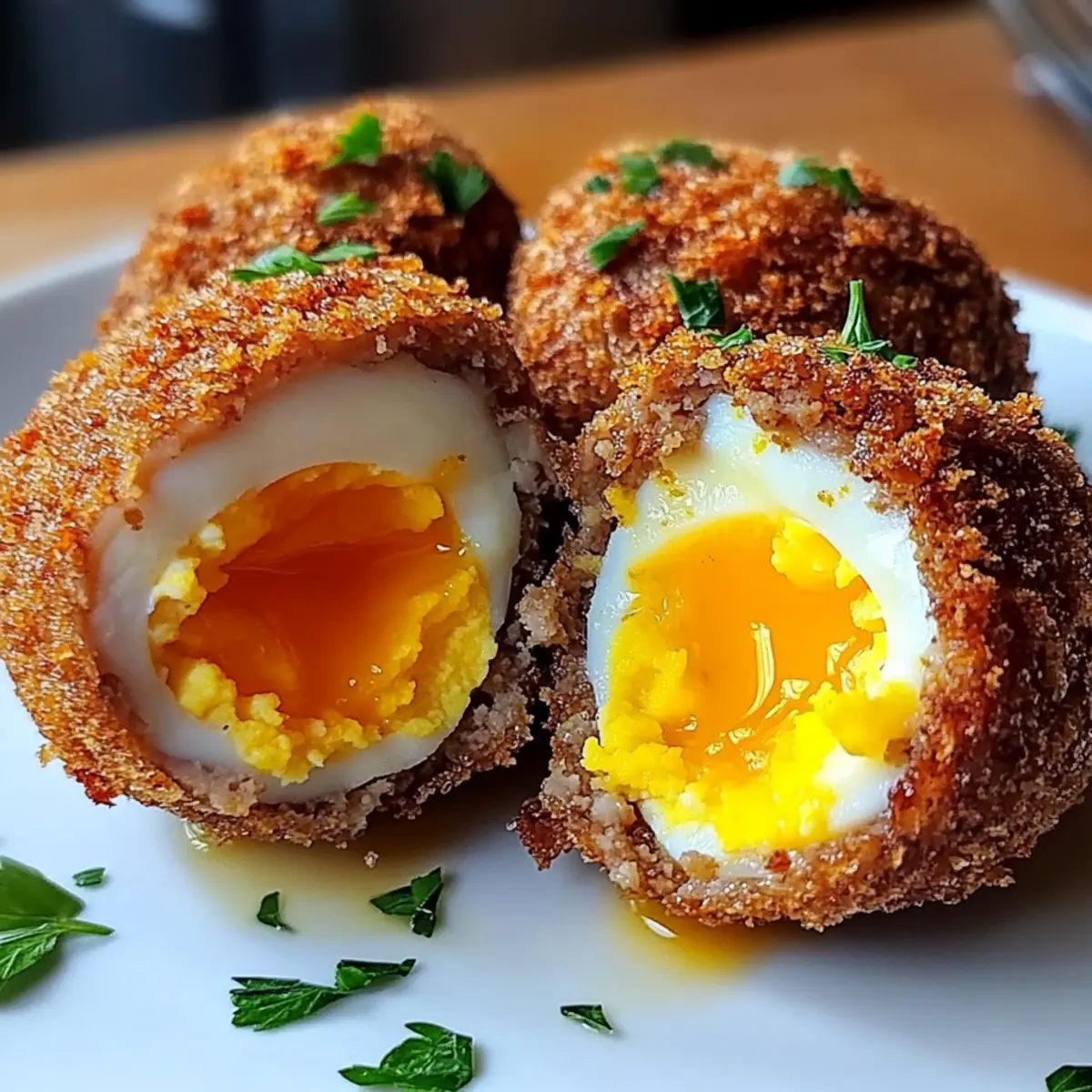 In einem kleinen britischen Pub, umgeben von fröhlichem Gelächter und dem Duft von frisch zubereiteten Speisen, erblickte ich zum ersten Mal die knusprigen Heißluftfritteuse Schottischen Eier. Diese köstlichen Bällchen, gefüllt mit angenehmem Wurstgeschmack und einem perfekt weichgekochten Ei, haben sofort mein Herz erobert. So einfach sie auch zuzubereiten sind, sie kombinieren köstliche Aromen mit einem wunderbaren Crunch – ideal für jede Zusammenkunft oder als köstlicher Snack zu Hause. Die luftige Zubereitung im Air Fryer macht sie nicht nur zum Star deiner nächsten Feier, sondern spart auch Zeit und Mühe in der Küche. Hast du dich schon gefragt, wie du diese britische Spezialität in deiner eigenen Küche verwirklichen kannst? Warum sind diese Schottischen Eier so besonders? Einfachheit: Die Zubereitung ist unkompliziert und erfordert nur grundlegende Kochfähigkeiten, perfekt für jeden, der köstliche Snacks liebt. Knuspriger Genuss: Die Heißluftfritteuse zaubert eine wunderbare Knusprigkeit, ohne dass viel Öl benötigt wird, was sie zur gesünderen Option macht. Vielseitigkeit: Experimentiere mit verschiedenen Würstchen und Zutaten, um deinen eigenen Geschmack zu kreieren. Du kannst sogar mit Shredded Cheese oder frischen Kräutern verfeinern! Zufriedenheit: Diese Appetithäppchen sind ein Hit auf jeder Party und sorgen für bewundernde Blicke und leere Teller. Tradition trifft Moderne: Die Kombination aus klassischer britischer Küche und moderner Zubereitung macht sie zu einem einzigartigen Erlebnis in deiner Küche. Knusprige Heißluftfritteuse Schottische Eier Zutaten • Um diese köstlichen Knusprigen Heißluftfritteuse Schottischen Eier selbst zu zaubern, benötigst du folgende Zutaten: Für die Eier Große Eier – Weichgekocht für das perfekte, cremige Eigelb; vollständig abkühlen, um das Schälen zu erleichtern. Für die Wurstfüllung Wurstfleisch – Die Geschmacksbasis; wähle deine Lieblingssorte und füge Gewürze oder Kräuter für mehr Aroma hinzu. Salz – Betont den Geschmack der Füllung. Schwarzer Pfeffer – Fügt eine milde Schärfe hinzu. Knoblauchpulver – Bringt eine aromatische Note in die Mischung. Zwiebelpulver – Fügt eine süßliche Komponente hinzu. Für die Panade Semmelbrösel – Entscheidend für die knusprige Hülle; Panko ist ideal für zusätzliche Knusprigkeit. Olivenöl-Spray – Garantiert eine gleichmäßige Bräunung und Knusprigkeit in der Heißluftfritteuse. Mit diesen Zutaten bist du bereit, deine eigenen knusprigen Schottischen Eier zuzubereiten! Schritt-für-Schritt-Anleitung für Knusprige Heißluftfritteuse Schottische Eier Step 1: Eier kochen Lasse 4 große Eier in kochendem Wasser für 6-7 Minuten weichkochen, bis das Eigelb schön cremig ist. Nach dem Kochen die Eier sofort in ein Eisbad legen, um den Kochprozess zu stoppen. Nach dem Abkühlen die Eier vorsichtig schälen, um Brüche zu vermeiden und eine gleichmäßige Oberfläche zu erhalten. Step 2: Wurstfüllung vorbereiten In einer Schüssel das Wurstfleisch mit Salz, Pfeffer, Knoblauch- und Zwiebelpulver gründlich vermengen. Achte darauf, dass alle Gewürze gleichmäßig verteilt sind, um den Geschmack der Füllung zu intensifizieren. Dies ist der Schlüssel zu köstlichen Knusprigen Heißluftfritteuse Schottischen Eiern, die bei jedem Biss überraschen. Step 3: Eier umwickeln Nehme eine Portion der Wurstmasse und drücke sie flach in deiner Handfläche. Wickele die Wurst gleichmäßig um ein Ei, sodass es vollständig bedeckt ist. Achte darauf, eine gleichmäßige Schicht zu formen, um Risse während des Kochens zu vermeiden. Wiederhole den Vorgang für alle Eier. Step 4: Mit Semmelbröseln panieren Rolle die umwickelten Eier in den Semmelbröseln, sodass sie rundherum gut bedeckt sind. Für zusätzlichen Crunch kannst du die Eier zuvor in verquirltem Ei tauchen, bevor du sie in die Semmelbrösel legst. Die Nutzung von Panko sorgt für eine besonders knusprige Schicht. Step 5: In der Heißluftfritteuse garen Heize die Heißluftfritteuse auf 200°C vor. Besprühe die Schottischen Eier leicht mit Olivenöl, um eine goldene Bräunung zu fördern. Gare die Eier für 12-15 Minuten, bis sie außen knusprig und goldbraun sind. Überprüfe zwischendurch, um sicherzustellen, dass sie perfekt gegart sind. Step 6: Servieren Lasse die Knusprigen Heißluftfritteuse Schottischen Eier kurz abkühlen, bevor du sie servierst. Sie sind ideal als Snack oder Vorspeise und passen hervorragend zu deiner Lieblingsdipsauce. Genieße jeden Biss und erfreue dich an den verschiedenen Texturen! Was passt zu Knusprigen Heißluftfritteuse Schottischen Eiern? Erlebe, wie die Kombination aus knusprigen und herzhaften Elementen deine Geschmacksknospen verzaubert und ein unvergessliches Geschmackserlebnis schafft. Tangy Senf: Dieser klassische Begleiter bringt eine erfrischende Schärfe, die perfekt mit dem herzhaften Wurstgeschmack harmoniert. Zesty Dip: Ein würziger Dip aus Joghurt, Zitrone und Kräutern ergänzt die Aromen wunderbar und sorgt für einen angenehmen Kontrast. Frischer Salat: Ein knackiger grüner Salat mit einem leichten Vinaigrette bietet eine erfrischende Balance zu den schweren, knusprigen Eiern. Süßkartoffel-Pommes: Die natürliche Süße dieser Pommes bildet einen perfekten Ausgleich zu den würzigen Aromen der Schottischen Eier und ist ein wahrer Genuss. Craft-Bier: Ein leichtes, hopfiges Bier sorgt für eine erfrischende Note und rundet das Erlebnis ab – ideal für gesellige Abende. Hausgemachte BBQ-Sauce: Die rauchigen und süßen Noten dieser Sauce ergänzen die Herzhaftigkeit der Eier und bieten eine köstliche Geschmacksdimension. Käseplatte: Serviere die Eier mit einer Auswahl an würzigem Käse, um einen gehobenen Genuss zu kreieren, der die Feierlichkeiten perfektioniert. Hummus: Diese cremige Köstlichkeit passt hervorragend als vegane Option dazu und bringt eine neue Geschmacksebene in dein Menü. Expertentipps für Knusprige Heißluftfritte