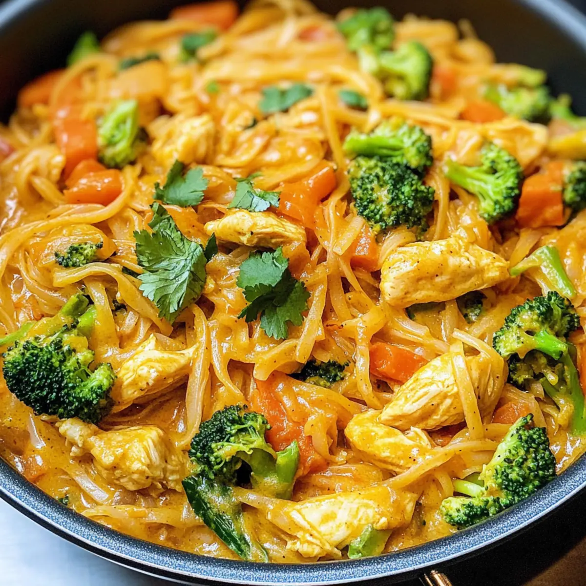 Kokosnuss-Curry-Hühnchen und Reisnudeln vereint zartes Hühnchen mit Brokkoli und aromatischem Koriander für ein schnelles, geschmackvolles Abendessen.