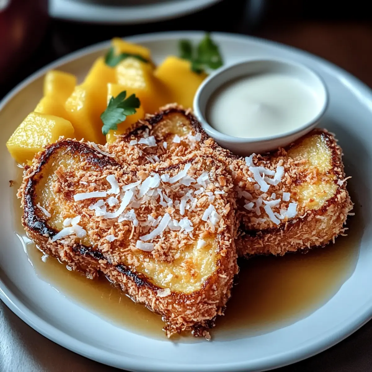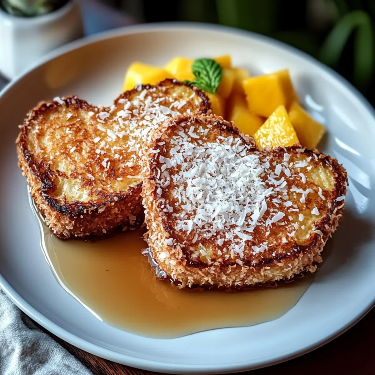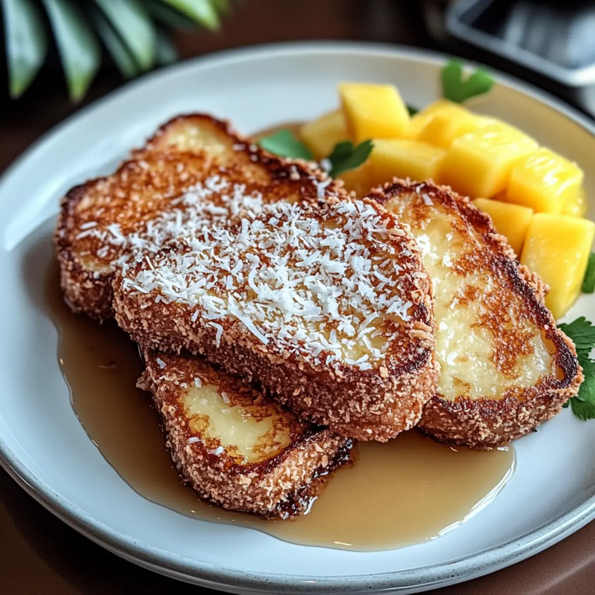 Der frühmorgendliche Duft von leicht geröstetem Kokosnuss und süßem Brot zieht mich in die Küche, wo ich eine köstliche Versuchung zubereiten möchte: Kokosnusskruste Französischer Toast. Diese tropische Version des klassischen Frühstücks kombiniert die knusprige Textur der Kokosnuss mit dem weichen, fluffigen Brot, sodass jedes Stück ein wahres Geschmackserlebnis bietet. Die Zubereitung ist nicht nur schnell und einfach, sondern auch perfekt, um den Tag mit einem Hauch von Luxus und Urlaubsflair zu beginnen. Egal, ob für einen besonderen Anlass oder einfach nur, um sich selbst zu verwöhnen, diese Delikatesse wird garantiert die Herzen (und Mägen) deiner Liebsten erobern. Bist du bereit, dein Frühstück in eine tropische Oase zu verwandeln? Warum ist dieser Toast einzigartig? Einzigartiger Genuss: Dieser Kokosnusskruste Französischer Toast bietet eine köstliche Kombination aus knuspriger Kokosnuss und weichfluffigem Brot – ein himmlisches Frühstückserlebnis! Einfache Zubereitung: Die Schritte sind unkompliziert, sodass du auch mit minimaler Erfahrung ein tolles Ergebnis erzielst. Ideal, um das Wochenende zu versüßen! Tropisches Flair: Verleihe deinem Frühstück einen Hauch von Urlaub – perfekt für einen entspannten Morgen oder eine brunchgerechte Feier. Vielseitige Variationen: Du kannst diesen Toast mit frischen tropischen Früchten oder einem Hauch von Kokosnuss-Schlagsahne anrichten. Entdecke zahlreiche Variation Ideen. Zeitersparnis: In nur wenigen Minuten zubereitet, eignet sich dieses Rezept bestens für vielbeschäftigte Tage. Crowd-Pleaser: Ob Familie oder Freunde – dieser Toast wird alle begeistern und schnell zum Liebling auf dem Frühstückstisch! Kokosnusskruste Französischer Toast Zutaten • Ein köstliches Zusammenspiel von Aromen macht diesen Toast unwiderstehlich! Für das Brot Dick geschnittenes Brot – dient als herzhafter Grundbaustein, der die Eimischung gut aufsaugt. Für Variationen kannst du auch Brioche oder glutenfreies Brot verwenden. Eier – sorgen für eine reichhaltige Masse, die das Brot geschmacklich und texturmäßig bereichert. Milch – trägt zur Cremigkeit der Eimischung bei und macht das Innere zart. Für die Kokosnusskruste Geraspelte Kokosnuss – umhüllt den Französischen Toast und wiedergibt eine knusprige Textur sowie ein tropisches Aroma. Verwende ungesüßte Kokosnuss für eine ausgewogene Süße. Allzweckmehl – bindet die Kokosnuss am Toast und trägt zur Knusprigkeit bei. Zimt – verleiht dem Gericht wärmende, aromatische Noten, die den Geschmack noch intensiver machen. Salz – gleicht die Süße aus und hebt die Gesamtgeschmackserfahrung. Für den feinen Geschmack Zucker – sorgt für die benötigte Süße, die die Kokosnuss ergänzt. Vanilleextrakt – gibt ein florales Aroma und verstärkt den Geschmack. Butter – wird zum Braten verwendet, um eine goldene, knusprige Außenschicht zu erzeugen und den Toast reichhaltig zu machen. Für das Topping Ahornsirup – der klassische Belag, der Süße hinzufügt und perfekt mit dem Kokosgeschmack harmoniert. Entdecke, wie dieser Kokosnusskruste Französischer Toast dein Frühstück auf ein neues Level hebt! Schritt-für-Schritt-Anleitung für Kokosnusskruste Französischer Toast Schritt 1: Zutaten vorbereiten Sammle zunächst alle Zutaten für den Kokosnusskruste Französischer Toast. Stelle sicher, dass das Brot dick geschnitten ist, damit es die Eimischung gut aufnehmen kann. Du kannst auch Brioche oder glutenfreies Brot verwenden, falls gewünscht. Schritt 2: Brot schneiden Schneide das Brot in gleichmäßige 2,5 cm dicke Scheiben, um eine optimale Textur zu gewährleisten. Achte darauf, das Brot gleichmäßig zu schneiden, damit jede Scheibe gleichmäßig durchtränkt wird und im Anschluss gleichmäßig bräunt. Schritt 3: Kokosnusskruste vorbereiten Mische in einer flachen Schale die geraspelte Kokosnuss, das Allzweckmehl, den Zimt und das Salz gut zusammen. Diese Mischung dient als knusprige Außenschicht für deinen Koksnusskruste Französischer Toast. Stelle die Mischung beiseite, während du die Eimischung vorbereitest. Schritt 4: Eimischung zubereiten In einer anderen großen Schüssel verquirlst du die Eier, Milch, Zucker und Vanilleextrakt zu einer homogenen Masse. Stelle sicher, dass alle Zutaten gut vermischt sind, um die besten Aromen im Kokosnusskruste Französischer Toast zu erzielen. Schritt 5: Pfanne erhitzen Erhitze eine große Pfanne bei mittlerer Hitze. Füge die Butter hinzu und lasse sie schmelzen, bis sie leicht schäumt und die Pfanne gut beschichtet ist. Achte darauf, dass die Butter nicht verbrennt, um den perfekten, goldbraunen Toast zu erreichen. Schritt 6: Brot tauchen Nehme die geschnittenen Brotscheiben und tauche jede Seite in die Eimischung, sodass sie gleichmäßig getränkt sind. Lasse überschüssige Eimischung abtropfen, damit der Toast nicht zu soggy wird. Schritt 7: Brot mit Kokosnuss bestreichen Drücke jedes Brotstück in die vorbereitete Kokosnussmischung und stelle sicher, dass es auf beiden Seiten gut beschichtet ist. Die Kokosnuss sorgt für die charakteristische Kruste des Kokosnusskruste Französischer Toast und verleiht ihm sein tropisches Aroma. Schritt 8: Toast braten Lege die beschichteten Brotscheiben vorsichtig in die heiße Pfanne. Brate sie für etwa 3-4 Minuten pro Seite, bis sie goldbraun und knusprig sind. Beobachte den Toast genau, um eine gleichmäßige Bräunung zu erreichen und einen perfekten Crunch zu gewährleisten. Schritt 9: Toast servieren Wenn alle Brotscheiben fertig sind, nimm sie aus der Pfanne und lege sie auf einen Teller. Du kannst sie warm servieren, damit die Knusprigkeit erhalten bleibt. Wiederhole den Vorgang mit den restlichen Brotscheiben, um eine köstliche Portion Kokosnusskruste Französischer Toast zuzubereiten. Schritt 10: Mit Sirup verfeinern Vor dem Servieren kannst du eine großzügige Menge Ahornsirup über die warmen Toastscheiben träufeln. Genieß deinen Kokosnussk