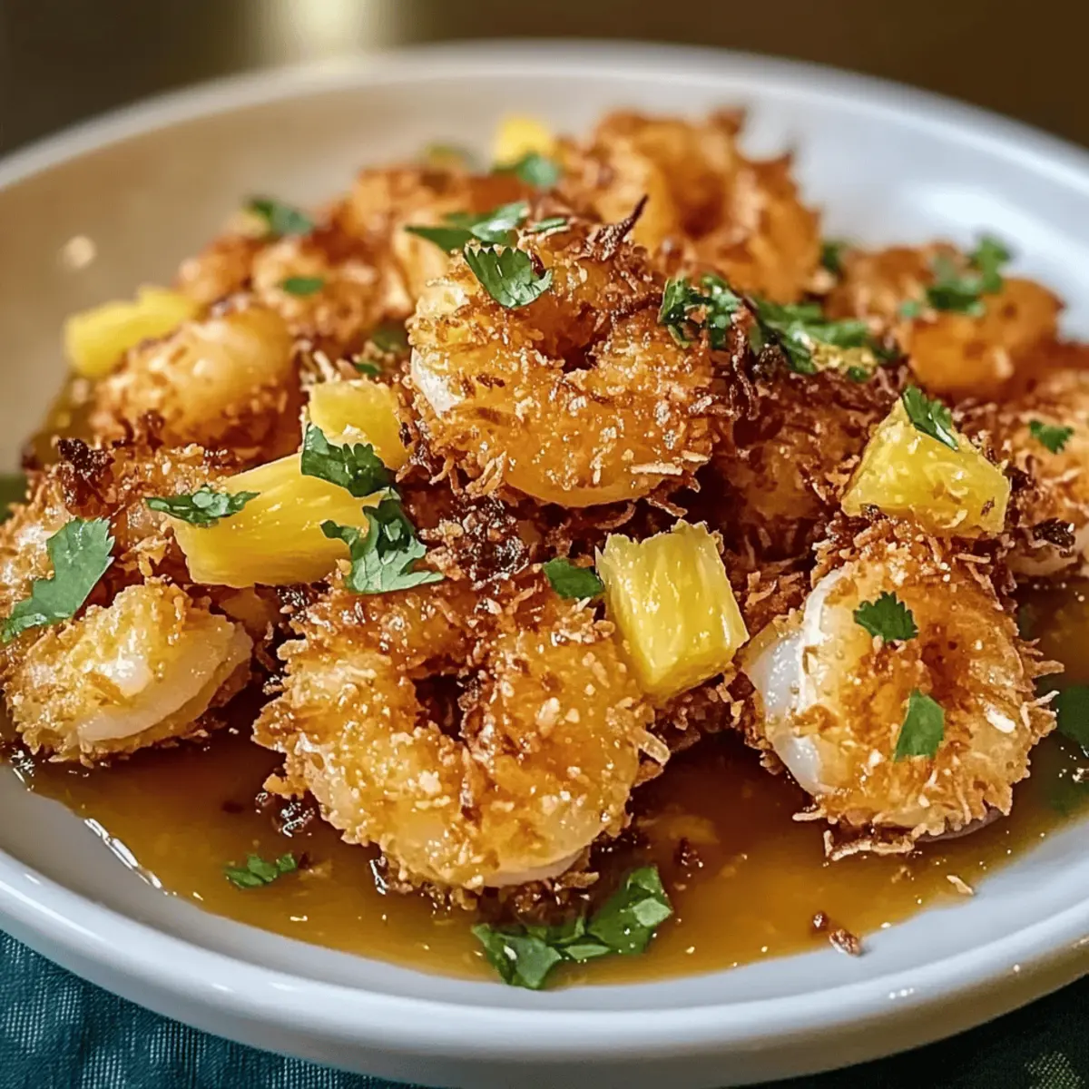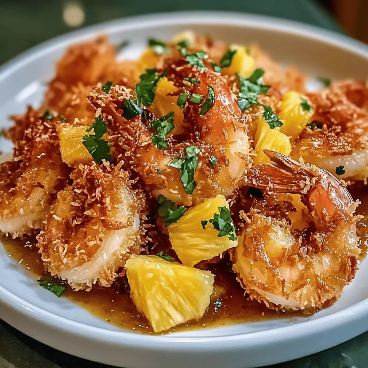 Serviere die krossen Kokosnuss-Garnelen auf einem großen Teller oder einer Platte. Gieße die frisch zubereitete Ananassauce gleichmäßig über die Garnelen, um die Aromen zu vereinen. Garniere das Gericht nach Belieben mit frischem Koriander oder gehackten Frühlingszwiebeln für einen zusätzlichen Farbtupfer und aromatischen Kick.