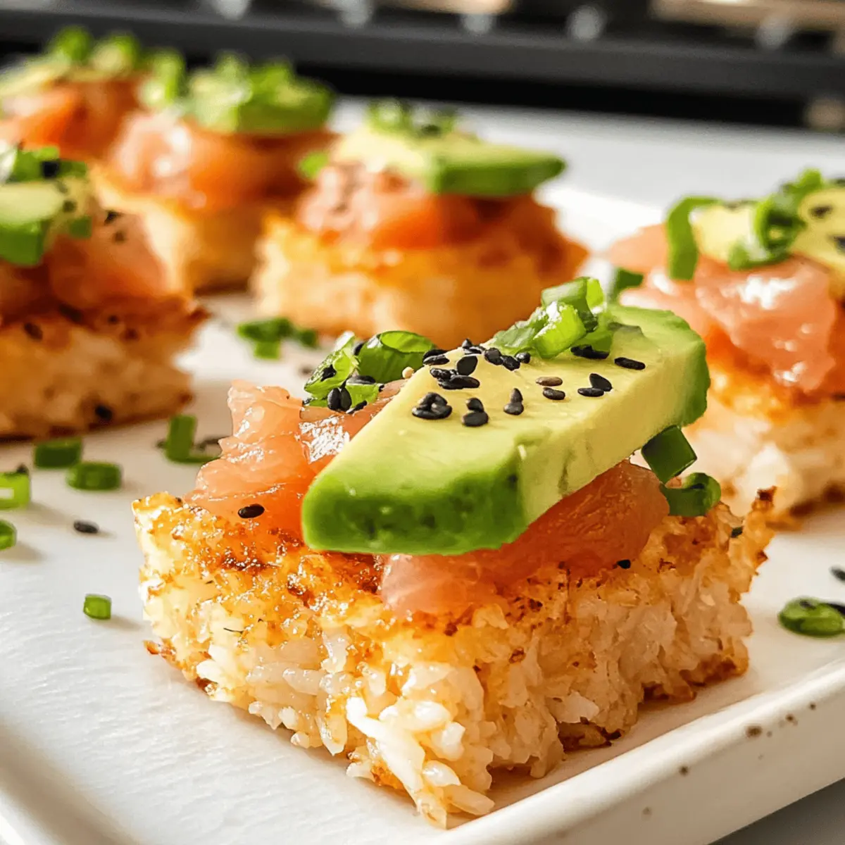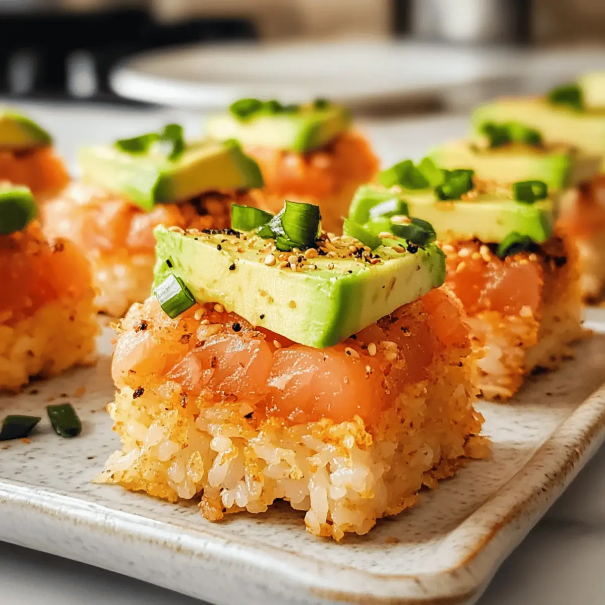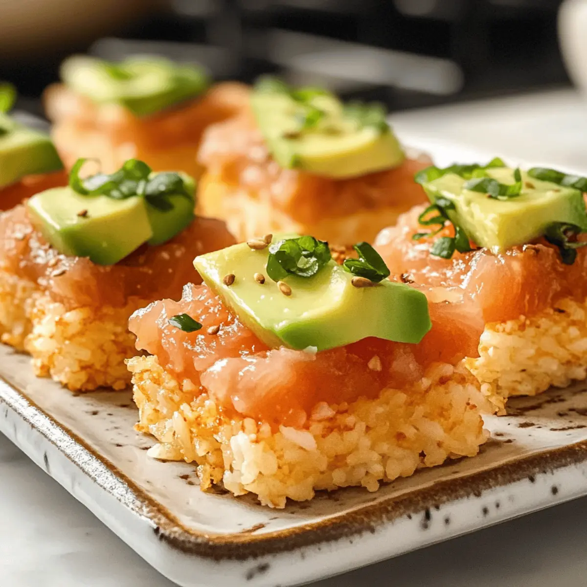 Gerade als ich in meinem kleinen Kochparadies stand, um ein neues Rezept zu kreieren, fiel mein Blick auf die herrlichen Zutaten, die für meine nachgemachte Version von Spicy Tuna Crispy Rice bereitlagen. Diese Spezialität, inspiriert von Nobu, kombiniert knusprige Reisstücke mit einer cremigen, würzigen Ahi-Thunfisch-Mischung und frischer Avocado, und ist mehr als nur ein einfaches Appetizer. Die Zubereitung ist schnell und gelingt auch Kochanfängern, während der aufregende Geschmack garantiert selbst die anspruchsvollsten Gäste begeistert. Egal, ob du eine entspannte Dinnerparty planst oder einfach nur Lust auf etwas Besonderes hast, dieses Gericht wird dein neuer Favorit werden. Wie klingt das für deinen nächsten Kochabend? Warum wirst du dieses Rezept lieben? Einfachheit: Die Zubereitung ist unkompliziert und ermöglicht es selbst Anfängern, ein Gericht zu meistern, das aussieht und schmeckt wie aus einem Restaurant. Gourmet-Erlebnis: Die Kombination aus krossem Reis und cremigem, würzigem Thunfisch sorgt für ein unvergessliches Geschmackserlebnis. Vielseitig: Variiere die Hauptzutaten, indem du zum Beispiel anstelle von Ahi-Thunfisch Lachs oder Garnelen verwendest; die Möglichkeiten sind endlos! Party-Hit: Ideal als Appetizer für kleine Zusammenkünfte oder Dinnerpartys, es wird garantiert deine Gäste beeindrucken. Hol dir noch mehr tolle Ideen mit Cremige Scharfe Rezept oder Pan Honig Bbq. Schnell zubereitet: Das Gericht lässt sich problemlos im Voraus vorbereiten, was dir Zeit an besonderen Anlässen spart. Zutaten für Krosse Reis mit scharfem Thunfisch Für den Reis • Sushi-Reis – Der Grundzutaten für Struktur und Textur; kurz-körniger Reis liefert die besten Ergebnisse. • Wasser – Notwendig zum Kochen des Sushi-Reis. • Salz – Verstärkt den Geschmack des Reises. • Reisessig – Fügt Säure und Süße hinzu; Apfelessig ist als Ersatz geeignet. • Zucker – Balanciert die Säure des Reisessigs. • Sesamöl – Verleiht einen nussigen Geschmack; ideal zum Würzen des Reises. Für den scharfen Thunfisch • Ahi-Thunfisch – Der Hauptbestandteil; achte auf Sushi-Qualität für Sicherheit und Geschmack; probiere Lachs als Variante. • Kewpie-Mayonnaise – Sorgt für Cremigkeit und verstärkt den Umamigeschmack in der Mischung. • Sriracha – Bietet Schärfe; passe die Menge je nach Vorliebe an. • Sojasauce – Fügt eine herzhafte Tiefe hinzu; nutze Sushi oder Sashimi-Qualität für beste Ergebnisse. • Limettensaft – Bringt Frische in die Gesamtgeschmackskombination. Für die Garnitur • Avocado – Frische Beilage, die Cremigkeit hinzufügt und gut mit dem knusprigen Reis harmoniert. • Geröstete Sesamsamen – Sorgen für einen zusätzlichen Crunch und visuelle Anziehungskraft. • Schnittlauch oder Frühlingszwiebeln – Für Frische und Farbe; kann durch gehackte grüne Zwiebeln ersetzt werden. • Jalapeño oder Serrano-Pfeffer – Ergänzt den Geschmack mit zusätzlichem Kick; kann für weniger Schärfe weggelassen werden. Dieses Rezept für krosse Reis mit scharfem Thunfisch ist eine wunderbare Möglichkeit, zu Hause ein schmackhaftes und beeindruckendes Gericht zuzubereiten! Schritt-für-Schritt-Anleitung für Krosse Reis mit scharfem Thunfisch Step 1: Reis vorbereiten Wasche den Sushi-Reis mehrmals, bis das Wasser klar ist, um überschüssige Stärke zu entfernen. Koche den Reis in einem Reiskocher mit Wasser und einer Prise Salz nach den Anweisungen auf der Verpackung, bis er weich und klebrig ist. Dies dauert etwa 20 Minuten. Step 2: Reis würzen Vermenge den gekochten Reis in einer großen Schüssel mit Reisessig, Zucker und einem Schuss Sesamöl. Mische alles gut, bis die Flüssigkeiten vollständig in den Reis eingezogen sind. Achte darauf, den Reis vorsichtig zu behandeln, um die Körner nicht zu zerdrücken. Step 3: Reis formen und kühlen Lege den gewürzten Reis in eine mit Frischhaltefolie ausgelegte rechteckige Backform und forme ihn zu einer etwa 1,5 cm dicken Schicht. Glätte die Oberfläche mit einem Spatel oder einer Gabel. Decke die Form ab und stelle sie für mindestens 1 Stunde in den Kühlschrank, damit der Reis fest werden kann. Step 4: Reis schneiden Nehme die gekühlte Reisform aus dem Kühlschrank und schneide den festen Reis mit einem scharfen Messer in gleichmäßige, mundgerechte Rechtecke. Achte darauf, dass die Schnitte sauber sind, damit die Stücke später gut braten können. Step 5: Reis braten Erhitze eine großzügige Menge Pflanzenöl in einer erhitzten Pfanne bei mittlerer bis hoher Temperatur. Fritiere die Reisteile für etwa 3 Minuten auf jeder Seite, bis sie goldbraun und knusprig sind. Lasse sie anschließend auf einem Drahtgestell abtropfen, um überschüssiges Öl zu entfernen. Step 6: Scharfen Thunfisch mischen In einer Schüssel kombinierst du die gewürfelten Thunfischstücke mit Kewpie-Mayonnaise, Sriracha, Sojasauce, Sesamöl und Limettensaft. Rühre gut um, bis alles gleichmäßig vermischt ist und eine cremige Konsistenz erreicht ist. Step 7: Anrichten Platziere die knusprigen Reisstücke auf einem Servierteller. Belege sie mit einer Scheibe Avocado und der würzigen Thunfischmischung. Garniere die Stücke mit gerösteten Sesamsamen, gehacktem Schnittlauch und optionalen Scheiben von Jalapeño oder Serrano-Pfeffer für zusätzlichen Geschmack. Variationen & Alternativen Egal, ob du deinem Gericht eine persönliche Note verleihen oder spezielle diätetische Bedürfnisse erfüllen möchtest, hier sind einige spannende Anpassungen! Fisch-Alternative: Tausche Ahi-Thunfisch gegen wildgefangenen Lachs für eine andere, köstliche Geschmacksrichtung. Dies verleiht dem Gericht eine neue Dimension! Weniger Scharf: Ersetze die Sriracha durch milde Chili-Sauce wie sambal oelek, um die Schärfe zu reduzieren. So können auch die weniger gewürzliebenden Gäste genießen! Vegetarische Option: Verwende marinierte Tofu-Stücke anstelle von Thunfisch für eine schmackhafte vegetarische Variante