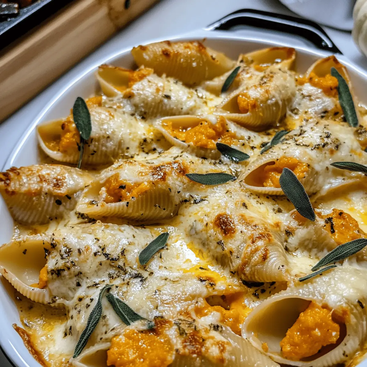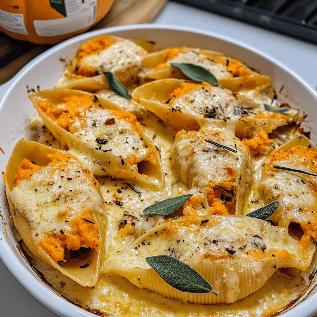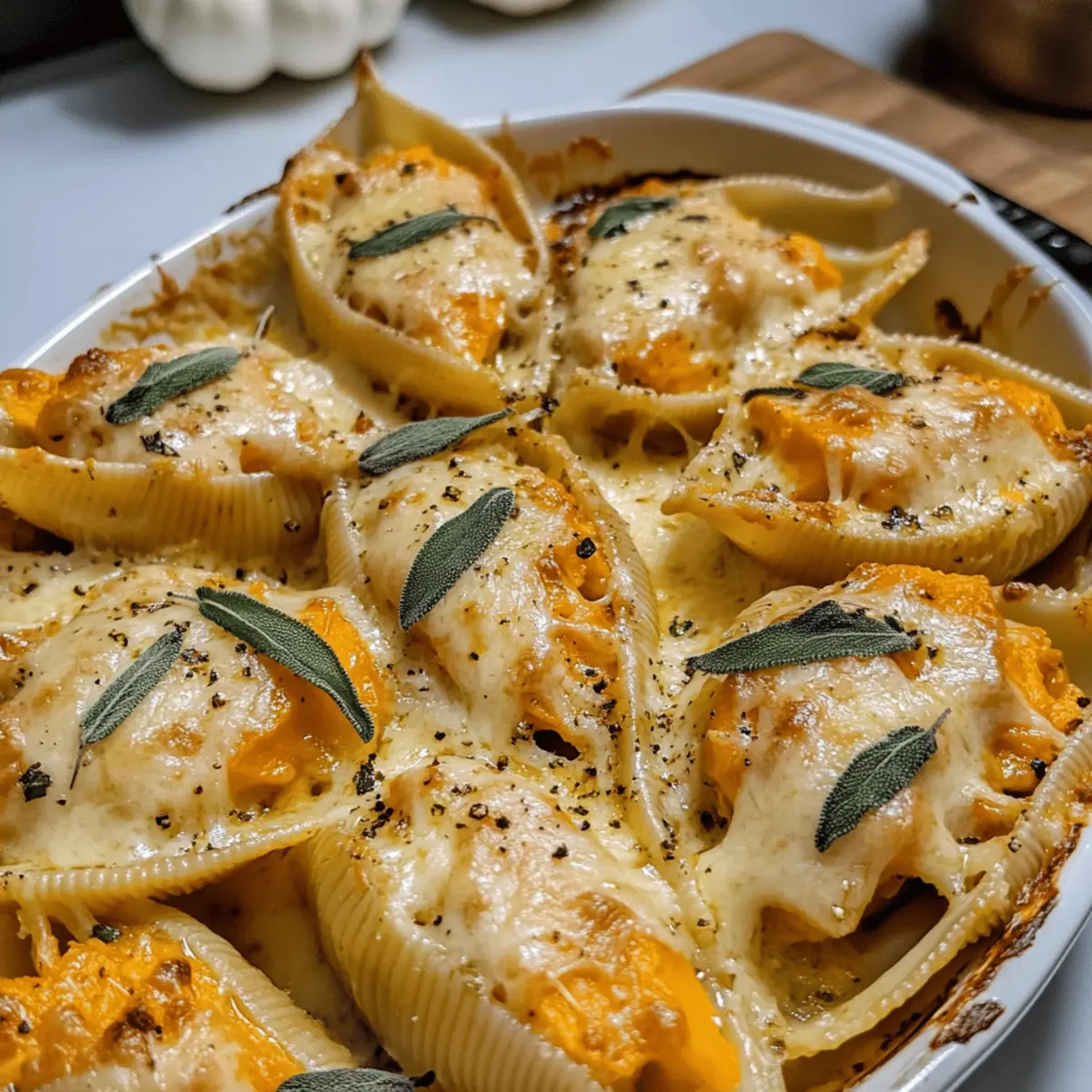 Die warmen Aromen des Herbstes wecken Erinnerungen an gemütliche Abende, während ich in meiner Küche stehe und dabei die köstlichen Kürbis- und Gouda-gefüllten Nudelschalen zubereite. Diese gefüllten Schalen sind nicht nur ein Fest für die Sinne, sondern auch ein leuchtendes Beispiel für ein freundliches, fleischloses Gericht, das perfekt zur kalten Jahreszeit passt. Mit einer unwiderstehlichen Kombination aus bunt gefärbtem Kürbis und cremigem Gouda, veredelt durch eine braune Butter-Salbei-Alfredo-Sauce, bieten sie eine echte Umarmung für den Gaumen. Außerdem sind sie schnell zubereitet und ein Publikumsliebling für jede Zusammenkunft. Wer würde da nicht direkt in die Küche stürmen, um dieses zauberhafte Gericht auszuprobieren? Warum wirst du dieses Rezept lieben? Einfachheit: Die Zubereitung ist unkompliziert und erfordert nur grundlegende Kochfähigkeiten, sodass jeder diese köstlichen Muscheln zaubern kann. Herzhafter Genuss: Die Kombination aus Kürbis und Gouda in einer samtigen Alfredo-Sauce sorgt für ein unvergleichliches Geschmackserlebnis. Platzsparend: Diese gefüllten Schalen können einen Tag im Voraus zubereitet und können perfekt für jede Zusammenkunft sein, sodass du mehr Zeit mit deinen Gästen verbringen kannst. Vielfalt: Ob mit Salat frischem Salat oder knusprigem Knoblauchbrot, du kannst dieses Gericht nach Belieben ergänzen. Gemütlichkeit: Ideal für lange Herbstabende, bieten diese Muscheln die perfekte Umarmung für den Gaumen und wecken Erinnerungen an festliche Zusammenkünfte. Kürbis-Gouda gefüllte Muscheln Zutaten Für die Füllung • Jumbo-Pasta-Schalen – Die Basis für das Gericht; achte darauf, dass sie groß genug sind, um gefüllt zu werden. • Ricotta – Sorgt für Cremigkeit und Feuchtigkeit; kann durch Hüttenkäse ersetzt werden, um es leichter zu machen. • Kürbispüree – Fügt Tiefe und herbstlichen Geschmack hinzu; ersetzbar durch pürierten Butternusskürbis, wenn nicht verfügbar. • Gouda (Artikaas Ginger Pumpkin Seed) – Reichhaltiger Käsegeschmack, der den Kürbis ergänzt; kann auch durch milde, cremige Käsesorten wie Mozzarella ersetzt werden. • Knoblauch – Liefert aromatischen Geschmack; frischer Knoblauch ist dem Pulver vorzuziehen. • Gelbe Zwiebel – Sorgt für Süße und Tiefe in der Füllung; bis zur Transparenz anbraten, um die ideale Textur zu erreichen. • Salbei – Für eine herbe Note, sowohl in der Füllung als auch in der Alfredo-Sauce; die Blätter können auch zur Garnierung frittiert werden. • Muskatnuss – Aromatische Gewürz, das die Wärme des Kürbisses verstärkt; sparsam verwenden. • Salz & Pfeffer – Wesentliche Gewürze zur Geschmacksbalance. Für die Sauce • Olivenöl – Zum Anbraten der Zwiebeln; kann durch ungesalzene Butter ersetzt werden. • Butter (ungesalzen) – Basis für die braune Butter-Sauce; sorgt für einen nussigen Geschmack. • Mehl – Verdickungsmittel für die Alfredo-Sauce. • Schlagsahne – Verleiht der Sauce Reichhaltigkeit; kann durch Halbfett-Sahne ersetzt werden, um sie leichter zu machen. Dieses köstliche Rezept für Kürbis-Gouda gefüllte Muscheln wird alle begeistern und ist perfekt für die herbstliche Küche! Schritt-für-Schritt-Anleitung für Kürbis-Gouda gefüllte Muscheln mit Salbeisahnesoße Step 1: Ofen vorheizen Heize den Ofen auf 200 °C vor. Dies ist wichtig, während du die Pasta und Füllung zubereitest, um die gefüllten Muscheln später perfekt backen zu können. Ein vorgeheizter Ofen sorgt dafür, dass die Käseoberfläche schön golden und die Muscheln gleichmäßig erwärmt werden. Step 2: Pasta kochen Koche die Jumbo-Pasta-Schalen in einem großen Topf mit leicht gesalzenem Wasser für 8-10 Minuten bis sie al dente sind. Achte darauf, sie nicht zu weich zu kochen, damit sie beim Füllen nicht reißen. Nach dem Kochen die Schalen in ein Sieb abgießen und mit kaltem Wasser abschrecken, damit sie nicht weiter garen. Step 3: Zwiebeln anbraten Erhitze in einer großen Pfanne 1-2 Esslöffel Olivenöl bei mittlerer Hitze. Füge die gewürfelten Zwiebeln und die Hälfte des gehackten Salbeis hinzu. Brate sie etwa 5-7 Minuten an, bis die Zwiebeln weich und glasig sind. Dies verleiht der Füllung eine aromatische Basis, die wunderbar zu der Kürbis-Gouda-Füllung passt. Step 4: Füllung vorbereiten In einer großen Schüssel vermische den Ricotta, das Kürbispüree, 1/3 Tasse Gouda, den gehackten Knoblauch sowie eine Prise Muskatnuss, Salz und Pfeffer. Rühre gut um, bis eine glatte Masse entsteht. Die Kombination dieser Zutaten schafft eine reichhaltige und cremige Füllung für die Muscheln. Step 5: Zwiebeln in die Füllung einarbeiten Füge die angebratenen Zwiebeln in die Ricotta-Mischung hinzu und vermische alles vorsichtig. Dies sorgt dafür, dass der reichhaltige Geschmack der gebratenen Zwiebeln gleichmäßig in die Füllung verteilt ist. Die Mischung sollte aromatisch und gut gewürzt sein, um das Gesamtgericht abzurunden. Step 6: Alfredo-Sauce zubereiten In einer sauberen Pfanne schmelze 4 Esslöffel Butter bei mittlerer Hitze, bis sie einen nussigen Geruch entwickelt und leicht braun wird. Reduziere dann die Hitze und füge den restlichen gehackten Salbei hinzu. Dies fördert die Aromen in der Sauce und gibt ihr einen herbstlichen Charakter. Step 7: Sauce andicken Streue 2 Esslöffel Mehl in die Pfanne mit der braunen Butter. Rühre gut um, bis alles vermischt ist und keine Klumpen mehr vorhanden sind. Nach und nach die Hälfte der Schlagsahne hinzufügen, während du kontinuierlich rührst, um eine glatte Konsistenz zu erreichen. Lasse die Sauce 3-4 Minuten köcheln, bis sie dick wird. Step 8: Muscheln füllen Verteile die Hälfte der Alfredo-Sauce gleichmäßig auf dem Boden einer Auflaufform. Fülle jede Pasta-Schale mit etwa 2 Esslöffeln der Kürbis-Gouda-Füllung und lege sie dann vorsichtig in die Auflaufform. Achte darauf, dass die Schalen gut gefüllt sind, damit sie im Ofen schön aufgehen. Step 9: