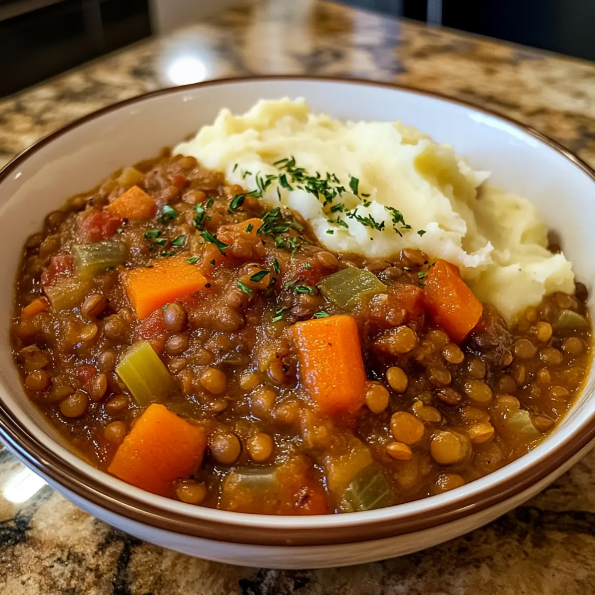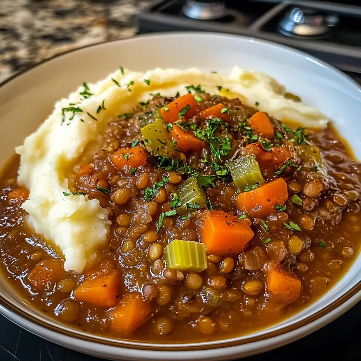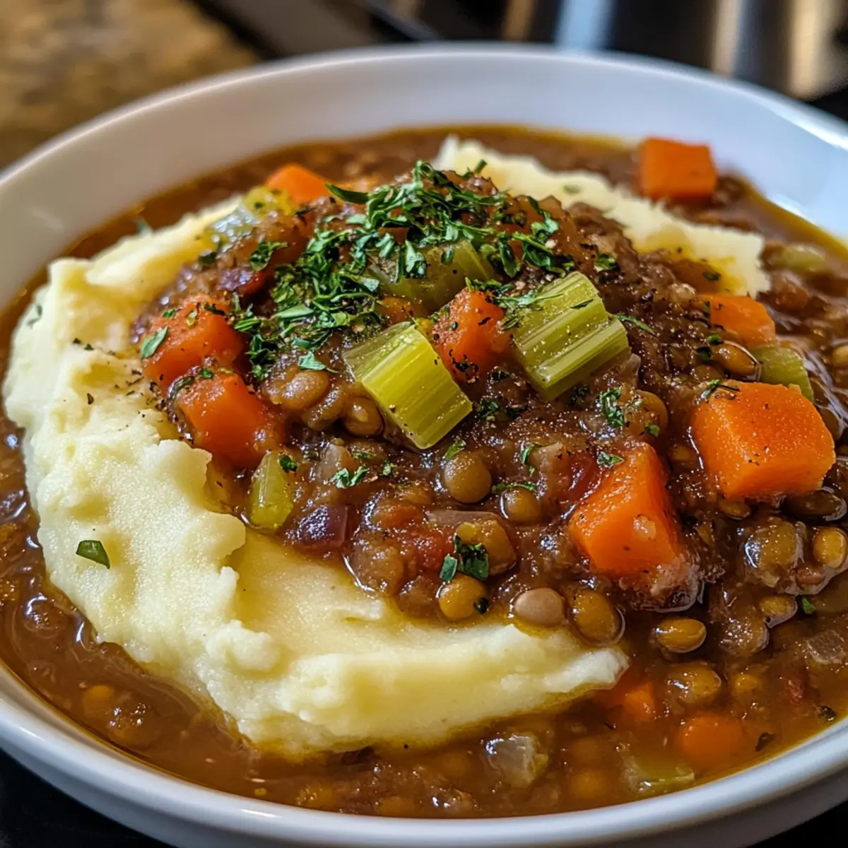 Während ich in meiner Küche stehe und die Zutaten für meinen Linsen-Eintopf mit cremigem Kartoffelpüree vorbereite, breitet sich ein köstlicher Duft aus, der die Erinnerungen an behagliche Familienabende weckt. Diese herzhafte Mahlzeit überzeugt nicht nur mit ihrem reichen, aromatischen Geschmack, sondern bietet auch die perfekte Mischung aus frischen, bunten Gemüse und zarten Linsen – ein echtes Komfortessen! Einfach zuzubereiten, ist dieser Eintopf ideal für geschäftige Wochentage und ein Favorit für alle, die sich nach einer gesunden und sättigenden Option sehnen, ohne auf Genuss zu verzichten. Es ist fast wie eine Umarmung auf dem Teller! Bist du bereit, deine Küche in einen Ort voller Wärme und Geschmack zu verwandeln? Warum ist dieser Linsen-Eintopf so besonders? Herzhafter Genuss: Dieser Linsen-Eintopf mit cremigem Kartoffelpüree kombiniert reichhaltige Aromen und frische Zutaten und bringt die Seele zum Strahlen. Einfache Zubereitung: Schnell und unkompliziert, perfekt für Stressfreie Wochentage. Vegetarisch & Nahrhaft: Ideal für eine gesunde Ernährung, ohne auf Geschmack zu verzichten. Vielseitig: Du kannst zusätzliche Gewürze oder Gemüse hinzufügen, um jedem Biss einen einzigartigen Dreh zu geben. Familienfreundlich: Dieser Eintopf ist ein Hit bei Groß und Klein! Probiere auch unser Rezept für Griechischer Nudelsalat mit Feta als erfrischende Beilage. Linsen-Eintopf mit cremigem Kartoffelpüree Zutaten • Für den Eintopf: Linsen – die Hauptproteinquelle, die eine hervorragende Textur bietet; alle Sorten wie grüne oder braune Linsen sind möglich. Zwiebeln – sorgen für eine süße, würzige Tiefe im Eintopf; verwende Schalotten für einen milderen Geschmack. Knoblauch – bringt eine aromatische Würze ins Spiel; bei Bedarf durch 1/4 Teelöffel Knoblauchpulver ersetzen. Karotten – fügen Süße und Farbe hinzu; du kannst sie auch durch Pastinaken ersetzen, um den Geschmack zu variieren. Sellerie – sorgt für einen knusprigen Biss; kann weggelassen werden, wenn du es nicht magst. Gemüsebrühe – gibt die Flüssigkeit und Basis für den Eintopf; Wasser oder Hühnerbrühe sind auch möglich. Tomatenmark – verstärkt den Umami-Geschmack; für eine süßere Note kannst du geröstetes Paprika-Püree verwenden. • Für das Kartoffelpüree: Kartoffeln – die cremige Beilage, die perfekt mit dem Eintopf harmoniert; wahlweise Rosmarin- oder Yukon-Gold-Kartoffeln verwenden. Butter oder Sahne – sorgen für reichhaltigen Geschmack; sie können durch Olivenöl oder pflanzliche Sahne für eine vegane Variante ersetzt werden. Salz & Pfeffer – unverzichtbare Gewürze, um das Gericht abzurunden. Dieser Linsen-Eintopf mit cremigem Kartoffelpüree bringt nicht nur Wärme in dein Zuhause, sondern nährt auch deinen Körper und deine Seele! Schritt-für-Schritt-Anleitung für Linsen-Eintopf mit cremigem Kartoffelpüree Step 1: Aromaten anbraten Erhitze in einem großen Topf bei mittlerer Hitze etwas Öl. Füge die gewürfelten Zwiebeln und den gehackten Knoblauch hinzu und brate sie an, bis sie weich und glasig sind – etwa 4-5 Minuten. Diese Basis gibt deinem Linsen-Eintopf mit cremigem Kartoffelpüree einen köstlichen Geschmack. Step 2: Gemüse hinzufügen Gib die gewürfelten Karotten und den Sellerie in den Topf. Rühre alles gut um und lasse es etwa 3-4 Minuten weitergaren, bis das Gemüse leicht weich wird. Diese frischen Zutaten bringen Farbe und Textur in deinen herzhaften Eintopf. Step 3: Linsen und Brühe kombinieren Füge die gewaschenen Linsen, das Tomatenmark und die Gemüsebrühe hinzu. Bringe alles zum Kochen und achte darauf, dass es sprudelt – das dauert etwa 5-7 Minuten. Die Linsen werden bald die Aromen des Eintopfs absorbieren, während sie garen. Step 4: Simmern lassen Reduziere die Hitze auf niedrig und lasse den Eintopf für 30-40 Minuten sanft köcheln. Rühre gelegentlich um, bis die Linsen weich sind und die Brühe leicht eingedickt ist. Dies ist der perfekte Moment, um den vollen Geschmack des Linsen-Eintopfs mit cremigem Kartoffelpüree zu genießen. Step 5: Kartoffeln vorbereiten Während der Eintopf köchelt, schäle die Kartoffeln und schneide sie in gleichmäßige Stücke. Koche sie in einem separaten Topf mit kochendem Wasser für ca. 15-20 Minuten, bis sie weich sind. So wirst du daraus ein cremiges Kartoffelpüree zaubern. Step 6: Kartoffelpüree zubereiten Sobald die Kartoffeln gar sind, gieße das Wasser ab und püriere sie mit Butter oder Sahne, bis sie schön cremig sind. Würze mit Salz und Pfeffer. Das Kartoffelpüree wird eine perfekte, köstliche Begleitung zu deinem Linsen-Eintopf mit cremigem Kartoffelpüree. Step 7: Servieren Sobald der Eintopf fertig ist, schöpfe ihn in Schalen und gib eine großzügige Portion des cremigen Kartoffelpürees oben drauf. Ein Hauch von frisch gehackter Petersilie kann als Garnitur dienen. Jetzt ist dein Linsen-Eintopf mit cremigem Kartoffelpüree bereit, genossen zu werden! Expertentipps für Linsen-Eintopf • Linsen vorbereiten: Achte darauf, die Linsen vor dem Kochen gründlich zu spülen, um Verunreinigungen zu entfernen. • Brühe anpassen: Füge beim Kochen je nach gewünschter Konsistenz mehr Brühe hinzu. Für eine dickere Version weniger Brühe verwenden. • Langsam köcheln: Lass den Eintopf lange genug köcheln, damit sich die Aromen entfalten können—Pilot kein „Schnell-Schnell“! • Gewürze variieren: Experimentiere mit verschiedenen Kräutern und Gewürzen, um deinem Linsen-Eintopf mit cremigem Kartoffelpüree einen persönlichen Touch zu verleihen. • Gemüse hinzufügen: Füge während des Kochens Blattgemüse wie Spinat oder Grünkohl hinzu, um zusätzliche Nährstoffe zu integrieren. • Serviervorschläge: Serviere den Eintopf mit einer Scheibe knusprigem Brot, um das Gesamtgericht zu vervollständigen. Vorausplanen für deinen Linsen-Eintopf mit cremigem Kartoffelpüree Der Linsen-Eintopf mit cremigem Kartoffelpüree ist perfekt für die Vorbe