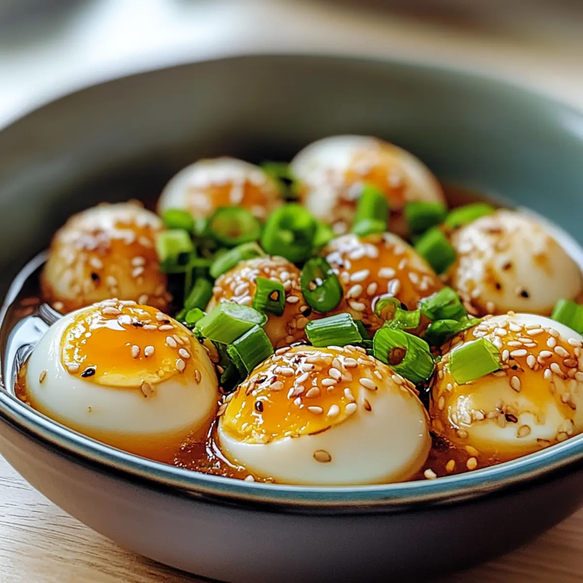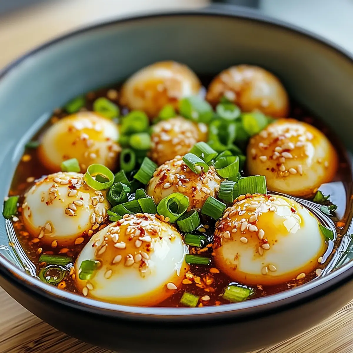 Eines Abends, als ich nach einem neuen Snack-Rezept suchte, stieß ich auf etwas Unglaubliches: Koreanische marinierte Eier, auch bekannt als Mayak Gyeran. Diese kleinen Körnchen der Glückseligkeit sind viel mehr als nur ein einfacher Ei-Snack. Die Kombination aus der zarten Konsistenz und dem reichhaltigen, umami-gesättigten Marinade macht sie zu einer perfekten Begleitung für jede Mahlzeit. Das Beste daran? Sie sind schnell zubereitet und mit einem zusätzlichen glanzvollen Touch versehen, der jeden Esstisch aufwertet. Egal, ob du sie zu Reisgerichten servierst oder einfach nur als köstlichen Snack genießt, diese marinierte Eier bringen Abwechslung in deinen Küchenalltag. Bist du bereit, in die Geschmackswelt von Mayak Gyeran einzutauchen? Warum solltest du marinierte Eier probieren? Schnelle Zubereitung: Die Vorbereitung der marinierenden Eier benötigt nur etwa 30 Minuten, ideal für kochfaule Abende. Arm an Aufwand: Ein einfaches Rezept, das keine besonderen Kochkünste erfordert, macht es für jeden zugänglich. Kreative Variationen: Du kannst die Marinade leicht anpassen, um verschiedene Geschmäcker zu kreieren – vielleicht mit etwas Ingwer oder scharfer Chilipaste? Vielseitiger Genuss: Ob als Snack, Beilage oder Topping für deine Lieblingsgerichte – die Mühe lohnt sich in jedem Fall! Probiere sie auch zusammen mit unserem Miso Marinierter Schwarzbarsch oder dem Sommerbeeren Pfirsich Käsekuchen aus, um eine vollständige Geschmacksexplosion zu erleben! Umami-Explosion: Der kräftige Geschmack der marinierten Eier wird deine Geschmacksknospen begeistern – eine ideale Ergänzung für jede Mahlzeit. Marinierte Eier Zutaten Egal, ob du ein begeisterter Koch oder ein leidenschaftlicher Foodie bist, diese Zutaten werden deine nächsten Mahlzeiten verfeinern! Für die Eier • Eier – Verwende frische Eier für den besten Geschmack und die beste Konsistenz. Für die Marinade • Niedriger-Salz-Soja-Sauce – Dies verleiht der Marinade einen salzigen Tiefgang; du kannst Tamari als glutenfreie Option verwenden. • Mirin – Fügt eine süße Note hinzu; Zucker kann alternativ verwendet werden, wenn Mirin nicht verfügbar ist. • Sesamöl – Bringt einen nussigen Geschmack; kann bei Bedarf durch ein neutrales Öl ersetzt werden. • Minced Garlic (optional) – Sorgt für aromatische Tiefe; Passe die Menge nach deinem Geschmack an. Zum Garnieren • Geschnittene Frühlingszwiebeln – Perfekt für die Garnitur und zur Aufwertung von Aroma und Präsentation. Mit diesen Zutaten bereitest du eine ausgeglichene und köstliche Marinierung deiner Eier vor, die es zu einem echten Genuss macht! Schritt-für-Schritt-Anleitung für Marinierte Eier Step 1: Eier kochen Lege die frischen Eier in einen Topf mit kaltem Wasser, sodass sie vollständig bedeckt sind. Bringe das Wasser langsam zum Kochen und decke den Topf ab. Sobald das Wasser kocht, nimm den Topf vom Herd und lasse die Eier für 10 bis 12 Minuten im heißen Wasser ziehen, bis sie perfekt weich gekocht sind. Step 2: Eisbad vorbereiten Während die Eier kochen, fülle eine große Schüssel mit Eiswasser. Dieses Eisbad hilft dabei, den Kochprozess sofort zu stoppen und die Eier schnell abzukühlen, damit die Konsistenz ideal bleibt. Halte das Eis bereit, während die Eier fertig garen. Step 3: Eier abkühlen Nach der Kochzeit nimmst du die Eier mit einem Löffel oder einer Zange vorsichtig aus dem heißen Wasser und legst sie direkt ins Eisbad. Lasse sie dort für etwa 5 Minuten, damit sie schön abkühlen und sich die Schale leichter abziehen lässt. Step 4: Eier schälen Halte ein Ei unter fließendes Wasser und klopfe es sanft auf die Arbeitsfläche, um die Schale zu knacken. Beginne am breiteren Ende, wo sich oft Luftblasen befinden, und schäle vorsichtig die Schale ab. Das Wasser hilft, die Schale leichtere abzutrennen, und sorgt dafür, dass die Eier unbeschädigt bleiben. Step 5: Marinade zubereiten In einer Schüssel misst du die niedrige-Salz-Soja-Sauce, Mirin und das Sesamöl ab. Wenn du magst, füge feingehackten Knoblauch hinzu, um der Marinade eine aromatische Tiefe zu geben. Mische alles gründlich mit einem Schneebesen oder einer Gabel, bis sich alle Zutaten gut verbunden haben und die Marinade homogen aussieht. Step 6: Marinieren Lege die geschälten Eier in einen luftdichten Behälter oder ein Glas. Gieße die fertig gemixte Marinade gleichmäßig über die Eier, sodass sie vollständig bedeckt sind. Verschließe den Behälter und stelle ihn in den Kühlschrank. Lass die Eier mindestens 2 Stunden marinieren, noch besser ist es, sie über Nacht ziehen zu lassen, um den vollen Geschmack zu entfalten. Step 7: Servieren Vor dem Servieren die marinierten Eier aus dem Kühlschrank nehmen und in der köstlichen Marinade schwenken. Richte sie auf einem Teller an und garniere sie mit den geschnittenen Frühlingszwiebeln, um einen frischen Farb- und Geschmackskontrast zu erzeugen. Diese Marinierte Eier sind nicht nur ein appetitlicher Blickfang, sondern auch eine leckere Ergänzung zu vielen Gerichten. Lagerungstipps für marinierte Eier Kühlschrank: Halte die marinierten Eier in einem luftdichten Behälter im Kühlschrank auf, wo sie bis zu einer Woche frisch bleiben. Stelle sicher, dass sie immer vollständig von der Marinade bedeckt sind. Einfrieren: Marinierte Eier können nicht gut eingefroren werden, da die Textur und der Geschmack darunter leiden. Es ist am besten, sie frisch zu genießen. Wiedererwärmung: Wenn du die Eier wieder verwenden möchtest, kannst du sie direkt aus dem Kühlschrank servieren. Zimmertemperatur lässt die Aromen besser zur Geltung kommen, daher ist kein zusätzliches Erwärmen nötig. Marinade: Die Marinade selbst kann in einem separaten Behälter bis zu einer Woche aufbewahrt werden und eignet sich hervorragend zum Marinieren weiterer Eier oder Gemüse. Tipps zur Vorbereitung von Marinierte Eier für die Woche Diese marinierten Eier sind ideal für die Vorbereitung im Voraus und s