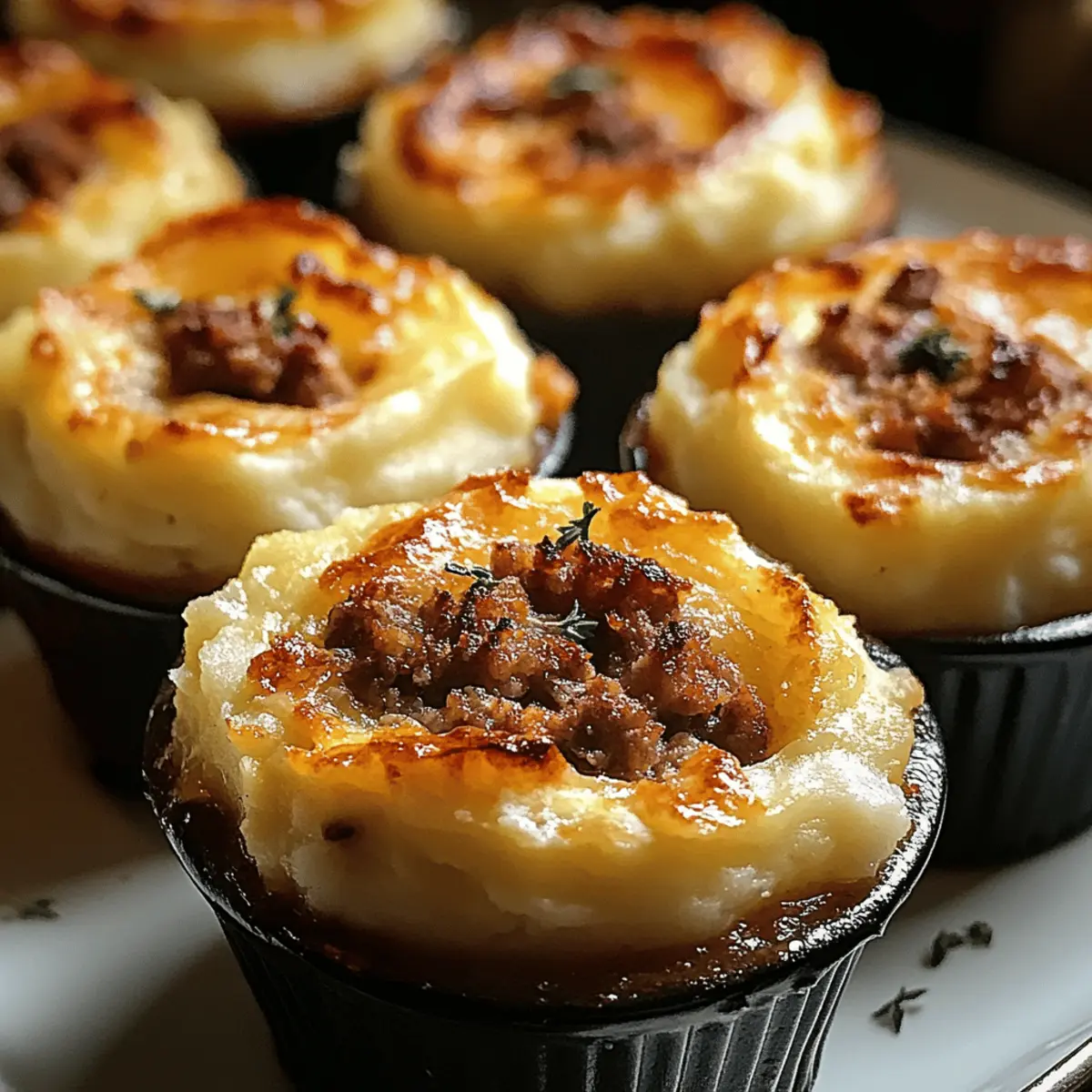 Hast du jemals das Gefühl, dass ein einfaches Dinner nicht langweilig sein muss? Diese Mini Shepherd’s Pies sind die perfekte Antwort auf die Suche nach einem herzhaften und gleichzeitig praktischen Gericht. Mit einer köstlichen, herzhaften Füllung aus frisch zubereitetem Hackfleisch und einer cremigen Schicht aus Kartoffelpüree lassen sich diese kleinen Leckereien im Handumdrehen kreieren. Sie sind nicht nur schnelles Comfort Food, das selbst wählerische Esser um den Tisch versammelt, sondern auch kinderfreundlich und anpassbar, sodass jeder seine persönliche Variante gestalten kann. Egal, ob du eine glutenfreie oder vegetarische Option bevorzugst, diese Mini-Pies sind ganz nach deinem Geschmack! Bist du bereit, deine Familie mit diesen köstlichen Stücken zu überraschen? Warum sind Mini Shepherd’s Pies so beliebt? Herzhaft und befriedigend: Diese Mini Shepherd’s Pies sind eine köstliche Kombination aus aromatischem Hackfleisch und cremigem Kartoffelpüree, die süchtig macht. Vielseitig: Egal, ob du Fleischliebhaber oder Vegetarier bist, diese Pies lassen sich ganz nach deinem Geschmack anpassen. Probiere verschiedene Proteine oder Gemüse, um für jeden etwas zu bieten! Einfache Zubereitung: Der gesamte Prozess ist unkompliziert – ideal für Kochanfänger und beschäftigte Haushalte. Du kannst die Zutaten sogar bereits im Voraus vorbereiten. Familienfreundlich: Selbst die wählerischsten Esser werden von diesem herzhaften Gericht begeistert sein. Serviere die Pies einfach als Hauptgericht oder als Snack für zwischendurch. Praktisch zum Einfrieren: Perfekt für Meal Prep! Diese kleinen Wunder lassen sich problemlos einfrieren, sodass du jederzeit eine köstliche Mahlzeit zur Hand hast. Mache die Zubereitung noch einfacher, indem du sie mit einem frischen Salat oder gedämpftem Gemüse kombinierst. Mini Shepherd’s Pie Zutaten • Diese Mini Shepherd’s Pies bieten eine leckere und vielschichtige Mischung aus Aromen – perfekt für kuschelige Abendessen! Für die Füllung: Hackfleisch – Die Hauptproteinquelle für eine herzhaft und sättigende Füllung. Du kannst auch Pute, Lamm oder Linsen für eine vegetarische Option verwenden. Zwiebel – Fügt Geschmack und Tiefe hinzu. Verwende Schalotten für einen milderen Geschmack. Knoblauch – Verstärkt das Aroma. In einer Notlage kann Knoblauchpulver verwendet werden. Erbsen und Karotten (gefroren) – Bringen Süße und Textur. Frisches Gemüse oder Mais können als Ersatz dienen. Tomatenmark – Verleiht der Füllung Reichtum und Körper. Ketchup kann alternativ verwendet werden. Rinderbrühe – Sorgt für Feuchtigkeit und Geschmack. Gemüsebrühe eignet sich gut für eine vegetarische Variante. Worcestershire-Sauce – Steigert den Umami-Geschmack. Achte darauf, eine glutenfreie Variante zu wählen; Sojasauce ist ein guter Ersatz. Für das Kartoffelpüree: Kartoffeln – Die Basis für das cremige Topping. Du kannst sie gegen Blumenkohl für eine kohlenhydratarme Variante austauschen. Milch – Macht das Püree cremig. Pflanzliche Milch ist perfekt für eine milchfreie Version. Butter – Sorgt für einen reichen Geschmack. Ersetze sie durch vegane Butter für eine milchfreie Option. Salz und Pfeffer – Unverzichtbar für die richtige Würze. Geriebener Cheddar-Käse – Optionale Oberfläche für extra Geschmack. Lass ihn weg, wenn du ein milchfreies Gericht möchtest, oder verwende veganen Käse. Schritt-für-Schritt-Anleitung für Mini Shepherd’s Pies Schritt 1: Ofen vorheizen Heize deinen Ofen auf 200 °C (400 °F) vor. Dies ist der ideale Zeitpunkt, um sicherzustellen, dass deine Mini Shepherd’s Pies gleichmäßig gebräunt und köstlich knusprig werden. Während der Ofen aufheizt, kannst du dich um die anderen Vorbereitungen kümmern. Schritt 2: Kartoffeln kochen Schäle und würfle die Kartoffeln und koche sie in einem Topf mit gesalzenem Wasser für etwa 10–12 Minuten, bis sie mit einer Gabel zart sind. Nachdem sie weich sind, gieße das Wasser ab und stampfe die Kartoffeln zusammen mit Milch, Butter, Salz und Pfeffer für eine cremige Konsistenz. Schritt 3: Fleisch bräunen Erhitze eine große Pfanne bei mittlerer Hitze und füge das Hackfleisch hinzu. Brate es an, bis es vollständig gebräunt ist, und lasse überschüssiges Fett abtropfen. Das Hackfleisch ist jetzt bereit, die Grundlage für die herzhafte Füllung deiner Mini Shepherd’s Pies zu bilden. Schritt 4: Zwiebel und Knoblauch anbraten Füge die gehackte Zwiebel und den gehackten Knoblauch in die Pfanne mit dem Hackfleisch hinzu. Sauté die Mischung für etwa 3–5 Minuten, bis die Zwiebel weich und glasig ist. Dies intensiviert den Geschmack deiner Füllung und sorgt für ein köstliches Aroma in der Küche. Schritt 5: Gemüse und Gewürze hinzufügen Rühre die gefrorenen Erbsen und Karotten zusammen mit dem Tomatenmark, der Brühe und der Worcestershire-Sauce in die Pfanne. Lass die Mischung 3–5 Minuten bei mittlerer Hitze köcheln, bis sie leicht eingedickt ist. Achte darauf, dass die Aromen gut miteinander verschmelzen. Schritt 6: Muffinblech vorbereiten Fette ein Muffinblech großzügig ein, damit sich die Mini Shepherd’s Pies leicht herauslösen lassen. Fülle jede Mulde des Muffinblechs etwa zu zwei Dritteln mit der herzhafte Fleischmischung. So wird jede Portion optimal mit Füllung versorgt. Schritt 7: Mit Kartoffelpüree bedecken Verteile das cremige Kartoffelpüree gleichmäßig über der Fleischfüllung in jedem Muffinförmchen. Glätte es mit einem Löffel oder einem Spatel, damit es schön aussieht und beim Backen eine goldene Kruste entsteht. Schritt 8: Backen Optional: Streue geriebenen Cheddar-Käse über das Kartoffelpüree für extra Geschmack. Backe die Mini Shepherd’s Pies im vorgeheizten Ofen 10–15 Minuten lang, bis sie goldbraun sind. Um die Oberseite noch krosser zu machen, kannst du sie für die letzten 2–3 Minuten unter den Grill stellen. Schritt 9: Servieren Sobald sie fertig sind, nimm die Mini Sh