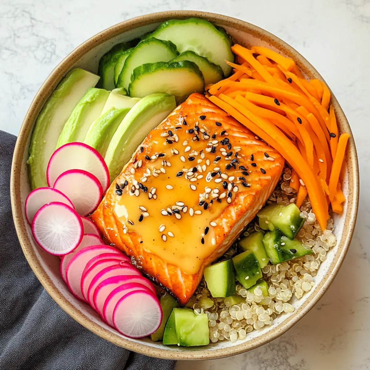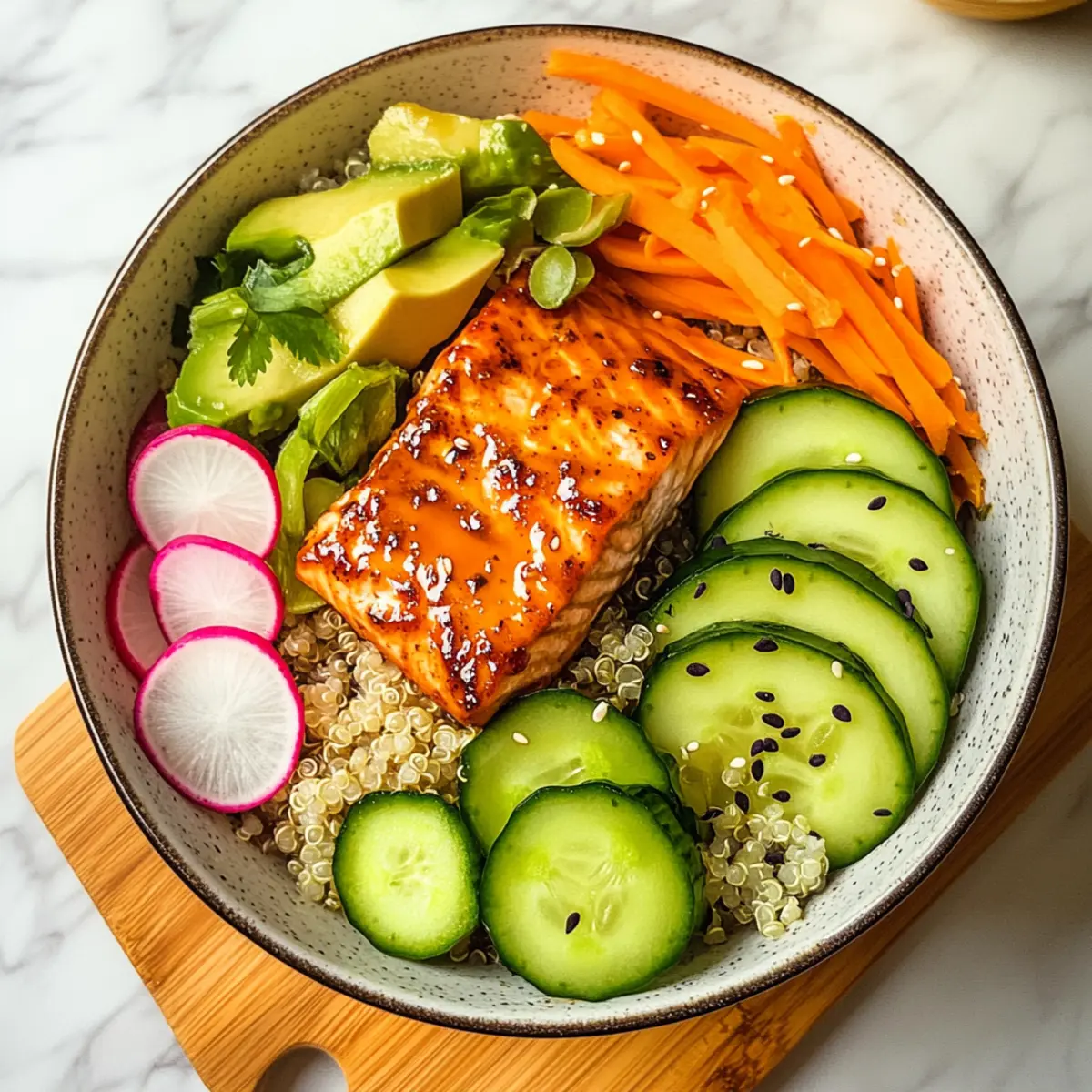 5. Platziere gekochten Quinoa oder Reis in einer Schüssel und arrangiere das Gemüse und den Lachs darauf. Träufle das Dressing darüber.