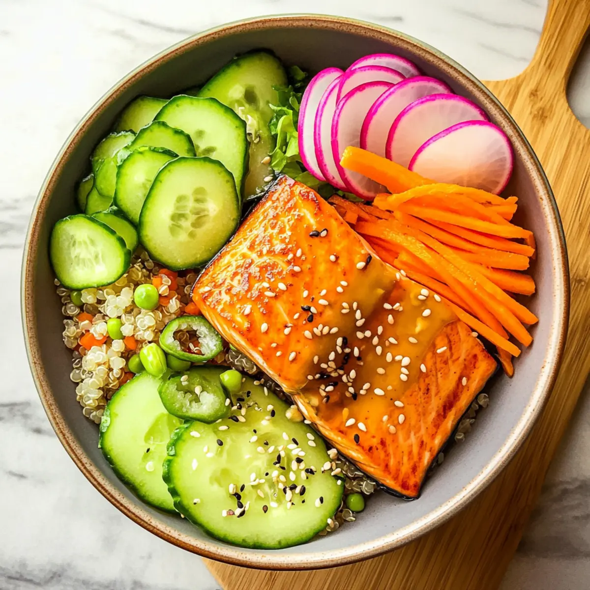 Nehme eine Schüssel und platziere eine Portion gekochten Quinoa oder Reis als Basis. Arrangiere dann die frisch geschnittene Gurke, Karotte, Radieschen, Avocado- und Edamame-Stücke kunstvoll rund um den Reis. Setze den hervorragend gebackenen Lachs direkt in die Mitte der Schale und träufle das cremige Sesam-Dressing großzügig darüber. Bestreue die Schale mit zusätzlichen gerösteten Sesamsamen und serviere sie sofort.