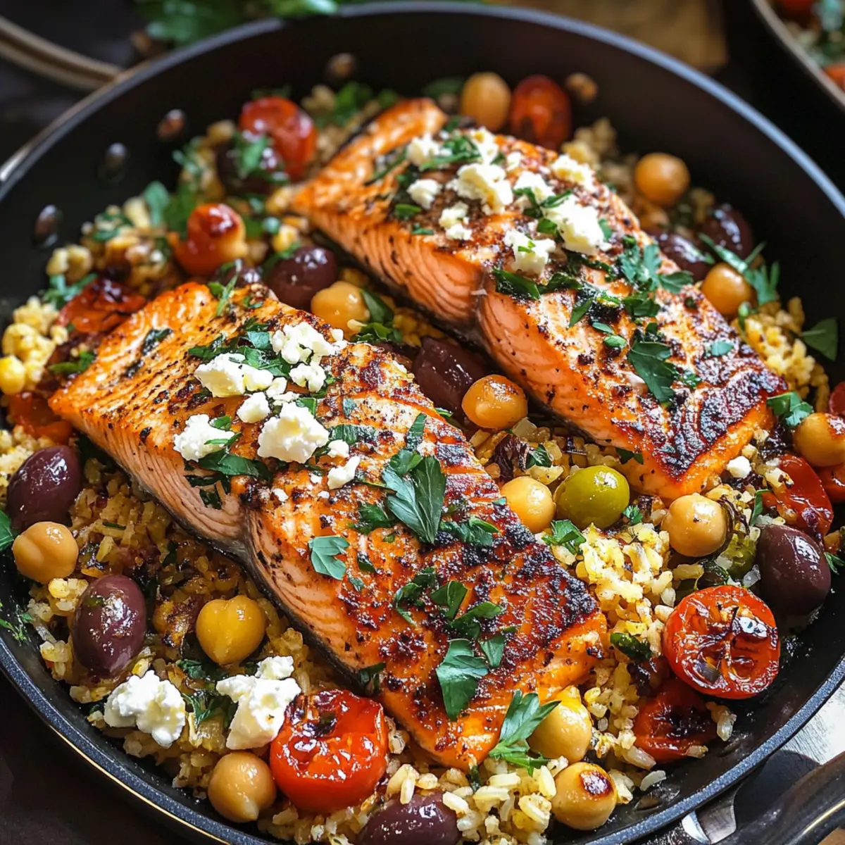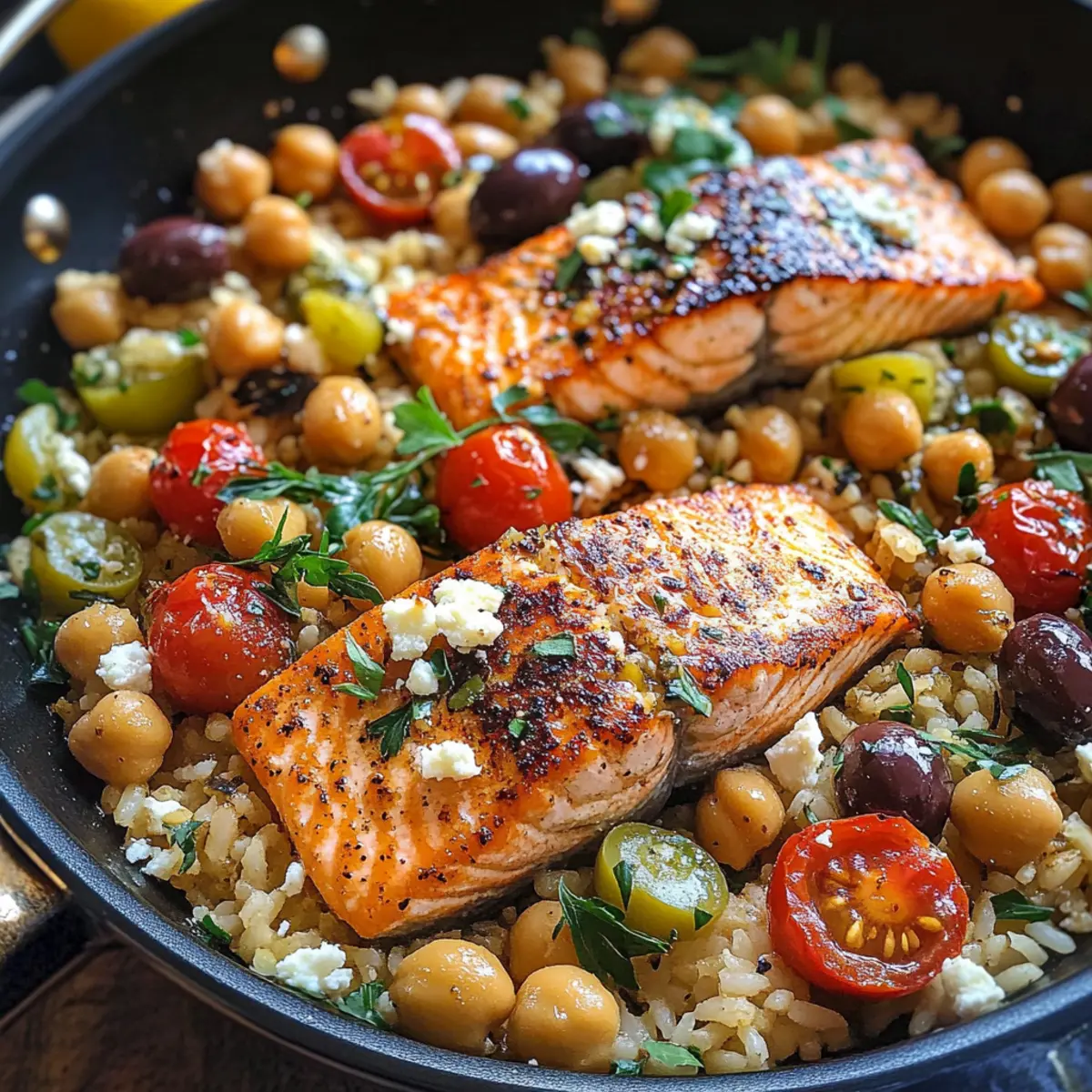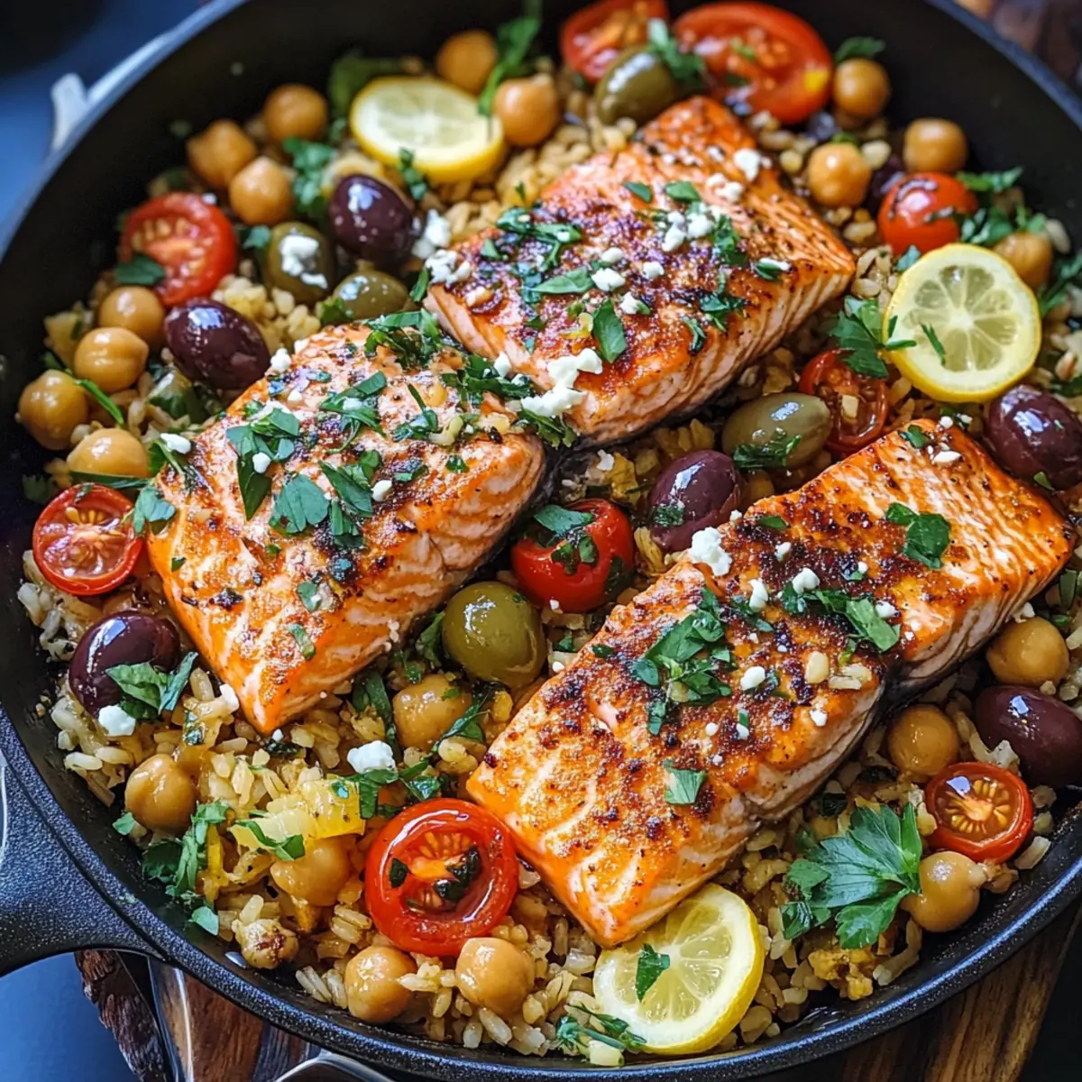 Ich erinnere mich an den ersten Biss in einen saftig gebratenen Mittelmeer-Lachs, der mit frisch gepresstem Zitronensaft und duftendem Oregano geschmückt war. Diese Kombination aus zartem Lachs, nahrhaftem Reis und proteinreichen Kichererbsen ist einfach unwiderstehlich. Mein Rezept für den Mittelmeer-Lachs mit Reis und Kichererbsen hat nicht nur den Vorteil, dass es glutenfrei ist, sondern auch in nur 30 Minuten vollständig zubereitet werden kann. Perfekt für hektische Wochentage oder besondere Anlässe, vereint es gesunde Zutaten und aufregende Aromen in einem einzigen, leicht zu reinigenden Gericht. Bist du bereit, dein Lieblingsgericht zu entdecken, das auch noch elegant aussieht? Warum wirst du dieses Rezept lieben? Einfachheit: Die Zubereitung erfordert nur wenige grundlegende Kochfähigkeiten und ist in nur 30 Minuten fertig. Gesunde Zutaten: Kombination aus proteinreichem Lachs, nahrhaften Kichererbsen und frischem Gemüse sorgt für ein ausgeglichenes Essen. Vielseitigkeit: Variiere die Gemüse oder ersetze den Lachs durch Hähnchen oder Tofu für ein individuelles Erlebnis. Aromatischer Genuss: Zesty Zitronensaft und kräftiger Oregano verleihen dem Gericht eine unverwechselbare mediterrane Note. Gericht in einer Pfanne: Alle Zutaten werden in nur einer Pfanne zubereitet, was die Reinigung erheblich erleichtert. Wenn du eine schnelle, köstliche und gesunde Mahlzeit suchst, ist dieses Rezept genau das Richtige für dich! Probiere auch unser Mango Sago Rezept oder unsere Spinat Feta Einfach. Mittelmeer-Lachs Zutaten Für den Lachs Lachsfilets (2 lb) – Hauptquelle für Eiweiß und gesunde Omega-3-Fettsäuren; frischen oder qualitativ hochwertigen gefrorenen Lachs verwenden. Räucherpaprika (1 TL) – Fügt dem Fisch eine rauchige Tiefe hinzu; kann durch normale Paprika ersetzt werden, wenn weniger Rauchgeschmack gewünscht ist. Getrockneter Oregano (½ TL) – Verleiht einen klassischen mediterranen Geschmack; frischer Oregano kann für einen frischeren Geschmack verwendet werden. Für den Reis und die Kichererbsen Gekochter Jasminreis (1,5 Tassen) – Die Basis des Gerichts, die Ballaststoffe und Kohlenhydrate hinzufügt; für eine gesündere Alternative kann auch brauner Reis verwendet werden. Dose Kichererbsen (15 oz) – Fügt Eiweiß und Ballaststoffe hinzu; kann durch weiße Bohnen oder Linsen ersetzt werden. Cherrytomaten (6 oz) – Sorgt für Süße und Säure; halbiert zugeschnitten; können durch normale gewürfelte Tomaten ersetzt werden. Für das Aroma Kalamata-Oliven (⅓ Tasse) – Ein salziger Bestandteil, der den Geschmack verbessert; hochwertige Oliven sind empfehlenswert. Grüne Oliven (¼ Tasse) – Bringen zusätzlichen Geschmack und Textur. Frisch gepresster Zitronensaft (3 EL) – Bringt Helligkeit ins Gericht und fügt Säure hinzu; abgefüllter Zitronensaft kann als Backup dienen. Feta-Käse (6 oz, gewürfelt) – Cremiger, säuerlicher Geschmack, der das Gericht zusammenbringt; für eine vegane Option kann auch pflanzlicher Feta verwendet werden. Für die Gewürze Dill (½ TL, optional) – Verstärkt den Geschmack der mediterranen Aromen; kann weggelassen werden, wenn nicht verfügbar. Rote Chiliflocken (¼ TL) – Fügt einen Hauch von Schärfe hinzu; diese kann weggelassen werden, um das Gericht milder zu gestalten. Salz (¼ TL) – Grundlegendes Gewürz, das nach persönlichem Geschmack angepasst werden kann. Olivenöl (3 EL, geteilt) – Wird zum Kochen und Würzen verwendet; kann durch Avocadoöl ersetzt werden. Ein schmackhafter Mittelmeer-Lachs in nur 30 Minuten zubereitet – perfekt für gesunde und köstliche Mahlzeiten! Schritt-für-Schritt-Anleitung für Mittelmeer-Lachs mit Reis und Kichererbsen Schritt 1: Lachs vorbereiten Erhitze eine hochrandige Pfanne bei mittlerer Hitze und gib 1 Esslöffel Olivenöl hinein. Würze die Lachsfilets gleichmäßig mit Räucherpaprika, Salz und Oregano. Wenn das Öl heiß ist, lege die Filets mit der Hautseite nach oben in die Pfanne. Die Filets sollten sofort brutzeln; dadurch erhältst du eine schöne Kruste. Schritt 2: Lachs garen Lasse die Lachsfilets 4 Minuten in der Pfanne braten, ohne sie zu bewegen, damit eine goldene Kruste entsteht. Wende die Filets vorsichtig und reduziere die Hitze auf mittlere Stufe. Koche den Lachs für weitere 5 Minuten, bis er matte Farbe annimmt und die Mitte leicht flockig wird. Nimm die Filets dann aus der Pfanne und stelle sie beiseite; entsorge die Haut. Schritt 3: Mediterranen Reis zubereiten Gebe den gekochten Jasminreis, die Kichererbsen, die halbierten Cherrytomaten und die Kalamata- sowie grünen Oliven in die gleiche Pfanne. Füge 3 Esslöffel frisch gepressten Zitronensaft hinzu und erhitze alles unter gelegentlichem Rühren, bis es durchgehend warm ist. Die Aromen verbinden sich und der Reis nimmt die mediterranen Geschmäcker auf. Schritt 4: Feta-Mischung anrühren Während der Reis aufwärmt, mische in einer Schüssel 6 Unzen gewürfelten Feta mit 1 Esslöffel Olivenöl, 1 Esslöffel Zitronensaft und frischem Oregano. Rühre die Mischung vorsichtig um, bis der Feta gleichmäßig mit dem Öl und den Gewürzen ummantelt ist. Diese Mischung wird dem Gericht eine cremige Textur verleihen. Schritt 5: Anrichten Rühre die Hälfte der Feta-Mischung vorsichtig in den warmen Reis. Lege die gebratenen Lachsfilets zurück in die Pfanne, um sie gleichmäßig zu erhitzen. Toppe alles mit der verbleibenden Feta-Mischung. Garniere den Mittelmeer-Lachs mit frischem Oregano und serviere ihn sofort. So wird das Gericht ein wahrer Hingucker! Meal Prep für deinen Mittelmeer-Lachs Der Mittelmeer-Lachs ist ideal für die Vorbereitung im Voraus, sodass du in stressigen Zeiten Zeit sparen kannst. Du kannst die Lachsfilets bis zu 24 Stunden im Voraus würzen und im Kühlschrank aufbewahren; das sorgt dafür, dass sie die Aromen optimal aufnehmen. Auch den gekochten Jasminreis und die Kichererbsen kannst du bis zu 3 Tage im Voraus zubereiten und in einem luftdichten Behälter im