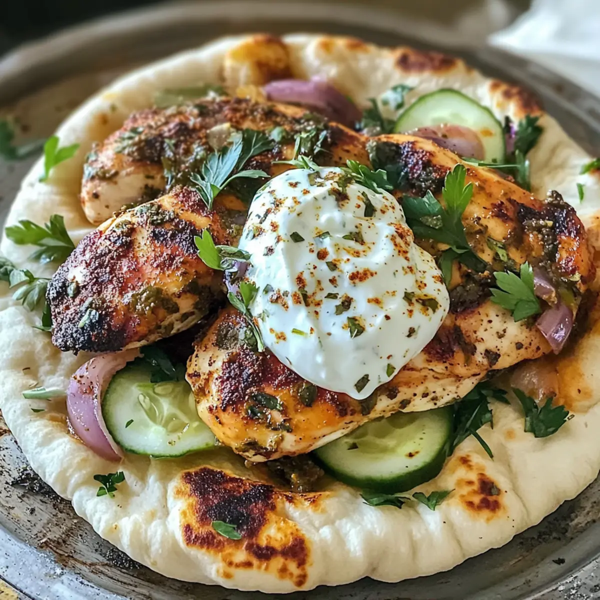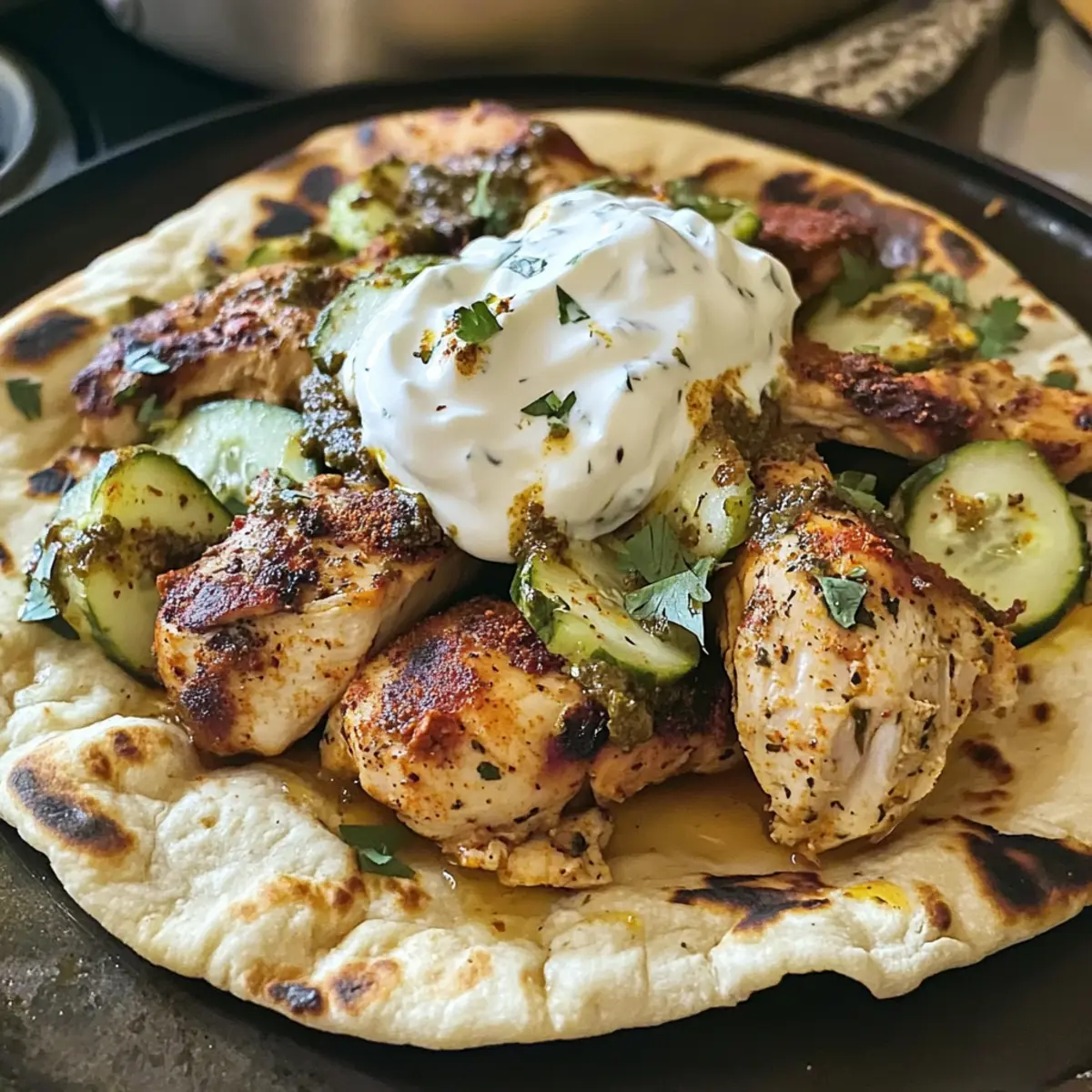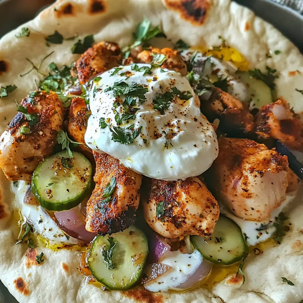 Die geheimnisvolle Kraft von Sumac hat mich sofort in ihren Bann gezogen. Als ich zum ersten Mal die leuchtend rote Gewürzkruste auf zartem Hühnchen entdeckte, wusste ich, dass ich ein Geschmackserlebnis gefunden hatte, das in meiner Küche nicht fehlen durfte. Das Rezept für Mittelmeer-Sumach-Hühnchen mit erfrischender Yogurt-Gurken-Sauce ist nicht nur in nur 33 Minuten zubereitet, sondern auch unglaublich vielseitig – ideal für entspannte Abendessen unter der Woche oder festliche Anlässe. Diese Kombination aus aromatischem Hühnchen, das perfekt gewürzt und auf den Punkt gegart ist, und der kühlen, cremigen Sauce wird alle an den Tisch locken. Bist du bereit, deine Geschmacksknospen auf eine mediterrane Reise mitzunehmen? Warum ist dieses Rezept besonders? Schnelligkeit: In nur 33 Minuten bringst du ein köstliches Gericht auf den Tisch, ideal für stressige Wochentage. Vielseitigkeit: Das Mittelmeer-Sumach-Hühnchen eignet sich perfekt für verschiedene Anlässe, egal ob ein einfaches Familienessen oder eine festliche Feier. Aromatische Frische: Mit der Kombination aus Sumac und der erfrischenden Yogurt-Gurken-Sauce wird jedes Bissen zu einem Geschmackserlebnis. Einfachheit: Nur grundlegende Kochfertigkeiten sind erforderlich, sodass Kochen Spaß macht und leicht von der Hand geht. Kreative Anpassungen: Variiere mit Zutaten wie Knusprige Sesam Blumenkohl für eine vegetarische Option oder füge Feta und Oliven hinzu, um den mediterranen Flair zu verstärken. Mittelmeer-Sumach-Hühnchen Zutaten • Für alle, die das köstliche Mittelmeer-Sumach-Hühnchen zubereiten möchten, hier ist, was du brauchst! Für das Hühnchen Hühnchenbrust – die Hauptzutat, die für ein vollwertiges und saftiges Gericht sorgt. Sumac – verleiht dem Hühnchen seinen charakteristischen, säuerlichen Geschmack. In einem Notfall kannst du auch Zitronenabrieb verwenden. Za’atar – eine aromatische Kräutermischung, die Tiefe und Erdtöne hinzufügt; alternativ kann eine Mischung aus Thymian und Oregano verwendet werden. Salz – hebt die Aromen hervor; passe die Menge nach deinem Geschmack an. Pfeffer – sorgt für eine leichte Schärfe, die das Gericht abrundet. Für die Yogurt-Gurken-Sauce Naturjoghurt – bildet die Grundlage der Sauce und macht sie cremig; für vegane Alternativen eignet sich auch pflanzlicher Joghurt. Gurke – sorgt für Frische und Knackigkeit; du kannst auch andere knackige Gemüse wie Radieschen verwenden. Salz – nach Geschmack hinzufügen, um die Aromen zu verstärken. Für das Fladenbrot Fladenbrot – dient als perfekte Basis für das Hühnchen; Alternativen sind Pita oder Tortillas. Wenn du perfekte Mittelmeer-Sumach-Hühnchen zubereiten möchtest, achte darauf, alle Zutaten bereit zu haben! Schritt-für-Schritt-Anleitung für Mittelmeer-Sumach-Hühnchen Schritt 1: Hühnchen würzen Beginne, indem du die Hühnchenbrüste gründlich abspülst und trocken tupfst. Damit das Mittelmeer-Sumach-Hühnchen seinen köstlichen Geschmack entfaltet, würze es großzügig mit Sumac, Za’atar, Salz und Pfeffer auf beiden Seiten. Lass die Gewürze für etwa 10 Minuten einziehen, damit sie den Geschmack des Hühnchens durchdringen können. Schritt 2: Hühnchen braten Erhitze eine große Pfanne auf mittelhoher Stufe und füge einen Esslöffel Öl hinzu. Wenn das Öl heiß ist, lege das gewürzte Hühnchen vorsichtig hinein. Brate es für etwa 6-8 Minuten pro Seite, bis die äußere Schicht goldbraun und knusprig ist. Achte darauf, dass die Innentemperatur des Hühnchens 74°C erreicht, damit es sicher und saftig ist. Schritt 3: Hühnchen ruhen lassen Nachdem das Hühnchen perfekt gebraten ist, nimm es aus der Pfanne und lege es auf ein Schneidebrett. Lass es für 5 Minuten ruhen, damit sich die Säfte im Fleisch verteilen können. Dieser Schritt ist wichtig, um sicherzustellen, dass das Mittelmeer-Sumach-Hühnchen auch nach dem Schneiden zart und saftig bleibt. Schritt 4: Yogurt-Gurken-Sauce zubereiten Während das Hühnchen ruht, bereite die Yogurt-Gurken-Sauce vor. Schneide die Gurke in kleine Würfel und gib sie in eine Schüssel. Füge den Naturjoghurt hinzu und würze die Mischung mit einer Prise Salz. Optional kannst du alles in einem Mixer pürieren, um eine cremigere Konsistenz zu erhalten, die perfekt das Mittelmeer-Sumach-Hühnchen ergänzt. Schritt 5: Anrichten und servieren Schneide das Hühnchen in dünne Scheiben und lege es auf das warme Fladenbrot. Belege das Hühnchen großzügig mit der erfrischenden Yogurt-Gurken-Sauce. Wickele das Fladenbrot um das Hühnchen und genieße dein selbstgemachtes Mittelmeer-Sumach-Hühnchen sofort, während es noch warm und aromatisch ist. Was passt gut zu Mittelmeer-Sumach-Hühnchen? Genieße eine harmonische Kombination von Aromen und Texturen, die deine Mahlzeit bereichern und den mediterranen Genuss perfekt abrunden. Cremige Kartoffelpüree: Diese Buttermilch-Variation ergänzt das würzige Hühnchen mit einer samtigen Textur, die zum Schlemmen einlädt. Die zarten Aromen der Kartoffeln harmonieren wunderbar mit dem pikanten Geschmack von Sumac. Mediterraner Couscous-Salat: Ein frischer Couscous-Salat mit Tomaten, Gurken und Minze bringt die leichten, aromatischen Elemente des Mittelmeer-Sumach-Hühnchens auf den Punkt. Die knackigen Gemüse und die frische Minze bieten einen perfekten Kontrast zum zarten Hühnchen. Eiskalte Limonade: Ein spritziges Getränk aus frischen Zitronen und Minze passt ideal zur herzhaften Wärme des Gerichts. Die kühlenden Eigenschaften der Limonade bieten eine erfrischende Ablenkung und machen jeden Bissen noch angenehmer. Tzatziki-Dip: Dieser klassische Dip aus Joghurt und Gurke verstärkt den frischen Geschmack des Hühnchens. Serviere ihn als zusätzlichen Dip für ein noch intensiveres Geschmackserlebnis. Geröstetes Gemüse: Eine Mischung aus Paprika, Zucchini und Auberginen bringt nicht nur Farbe, sondern auch zusätzliche Süße und Röstaromen in dein Gericht. Das Kombinieren von warmem, g