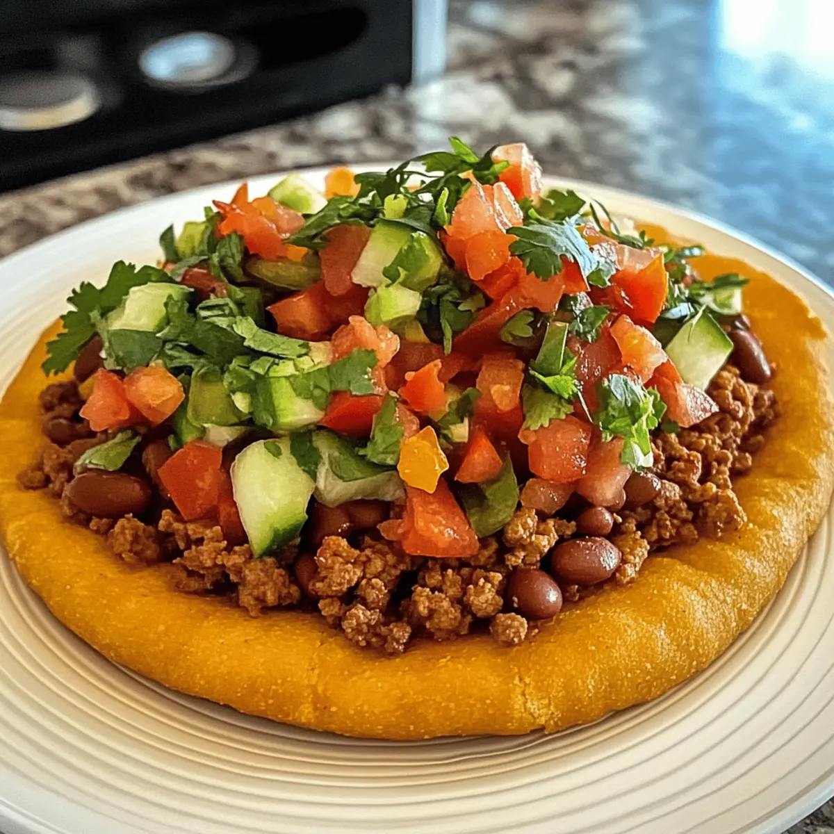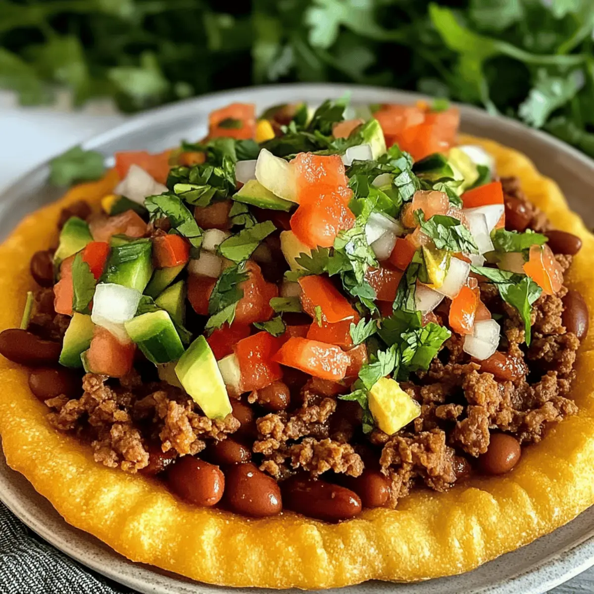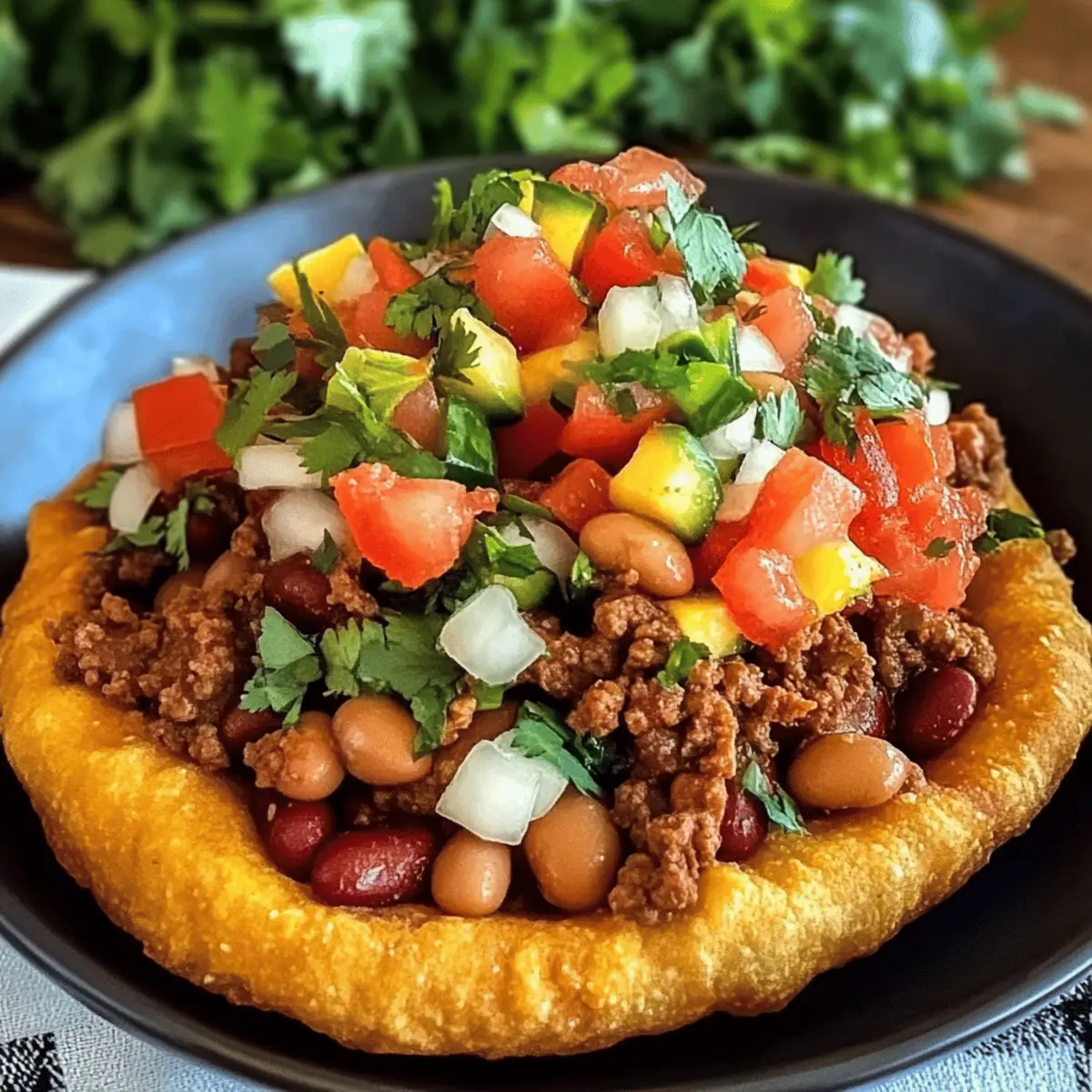In einem kleinen Restaurant in der Wüstenlandschaft der Navajo Nation habe ich das erste Mal den köstlichen Crunch von Navajo Taco Fry Bread erlebt – ein Gericht, das Erinnerungen und Geschmack zu einem Fest vereint. Diese schnelle und herzhafte Komfortspeise kombiniert luftigen, knusprigen Teig mit würzigem Rinderhackfleisch, Bohnen und frischen Gemüse. Es ist nicht nur ein Hit bei Familie und Freunden, sondern auch perfekt für wuselige Wochentage, an denen man sich nach etwas Heimischem sehnt. Mit anpassbaren Belägen passt es für alle, die nach einer kreativen Wendung in der Küche suchen. Bist du bereit, deine eigene Portion dieser kulturellen Köstlichkeit zuzubereiten? Warum wirst du dieses Rezept lieben? Vielseitigkeit: Dieses Rezept für Navajo Taco Fry Bread lässt sich mühelos anpassen, egal ob du es vegetarisch mit Bohnen und Gemüse zubereitest oder mit würzigem Rinderhackfleisch. Schnelle Zubereitung: In weniger als einer Stunde kannst du ein leckeres Gericht zaubern, das ideal für geschäftige Wochentage ist, und dennoch genug Zeit für eine gesellige Runde lässt. Kulturelles Erlebnis: Erlebe die Verbindung zur Navajo-Kultur und kreiere ein Gericht, das nicht nur sättigt, sondern auch Geschichten erzählt. Familienfreundlich: Kinder und Erwachsene lieben die Kombination aus knusprigem Brot und herzhaften Belägen, was das Rezept perfekt für Familienessen macht. Für eine erfrischende Begleitung empfehle ich, dazu ein Glas Sago Rezept Erfrischendes oder einfaches Wasser mit Zitrone zu servieren. Navajo Taco Fry Bread Zutaten Für den Teig • Allzweckmehl – bildet die Basis des knusprigen Teigs, für eine glutenfreie Variante einfach glutenfreies Mehl verwenden. • Backpulver – sorgt dafür, dass der Teig aufgeht; achte darauf, dass es frisch ist für optimale Fluffigkeit. • Meersalz – hebt die Aromen im gesamten Gericht hervor. Für die Füllung • Gemüseöl – wird zum Braten des Teigs und zum Sautieren verwendet; kann durch Rapsöl für eine leichtere Option ersetzt werden. • Gelbe Zwiebel – bringt Süße und Geschmack in die Füllung; für einen kräftigeren Geschmack kann rote Zwiebel verwendet werden. • Rinderhackfleisch (oder Putenhackfleisch) – die Basisprotein für das Topping; kann durch Putenhackfleisch für eine magerere Mahlzeit oder durch Bohnen als vegetarische Option ersetzt werden. • Chili-Pulver, Kreuzkümmel, Salz, schwarzer Pfeffer, geräucherter Paprika, Knoblauchpulver, zerstoßene rote Pfefferflocken, Chipotle-Chili-Pulver – Gewürze, die das herzhafte Aroma ausbauen; justiere die Menge je nach deinem persönlichen Schärfeempfinden. • Dunkelrote Kidneybohnen – sorgen für Ballaststoffe und Herzhaftigkeit; schwarze Bohnen oder Linsen können für Abwechslung verwendet werden. • Petite gewürfelte Tomaten und milde grüne Chilischoten – sorgen für Feuchtigkeit und Geschmack in der Füllung; versuche, gewürzte Dosen zu verwenden, für einen pikanten Kick. • Maiskörner – fügen Süße und Textur hinzu; gefrorener Mais funktioniert hier ebenfalls gut. Sonstige Zutaten • Warmes Wasser – wird nach und nach zum Kneichen des Teigs hinzugefügt, um die gewünschte Konsistenz zu erreichen. Mit diesen Zutaten bereitest du ganz unkompliziert das köstliche Navajo Taco Fry Bread zu – ein echtes Komfortgericht, das jeden begeistern wird! Step-by-Step Instructions for Navajo Taco Fry Bread Step 1: Füllung zubereiten Erhitze in einer Pfanne bei mittlerer Hitze etwas Gemüseöl und sautiere die gewürfelte Zwiebel, bis sie weich und glasig ist, etwa 5 Minuten. Brate das Rinderhackfleisch in der Pfanne an, bis es vollständig durchgegart ist, und rühre es regelmäßig um. Füge Chili-Pulver, Kreuzkümmel, Salz, schwarzen Pfeffer, geräucherten Paprika und andere Gewürze hinzu. Mische die Kidneybohnen, die gewürfelten Tomaten, die grünen Chilischoten und die Maiskörner ein, lasse alles 10 Minuten köcheln und stelle die Füllung beiseite. Step 2: Teig herstellen In einer großen Schüssel vermische das Allzweckmehl, das Backpulver und das Meersalz. Füge langsam warmes Wasser hinzu, während du den Teig mit einem Löffel oder der Hand zu einer weichen, formbaren Konsistenz knetest. Knete den Teig für etwa 5 Minuten, bis er gleichmäßig und geschmeidig ist. Decke den Teig mit einem Tuch ab und lasse ihn 10 Minuten ruhen, während die Füllung zieht. Step 3: Ausrollen und Frittieren Teile den Teig in sechs gleich große Stücke und forme jedes Stück zu einer Kugel. Rolle jede Kugel auf einer bemehlten Arbeitsfläche zu einem Kreis von etwa 0,6 cm Dicke aus. Erhitze in einem tiefen Topf oder einer Pfanne reichlich Gemüseöl auf etwa 180 °C. Frittiere jeden Teigkreis für 2-3 Minuten pro Seite, bis sie goldbraun und knusprig sind. Achte darauf, dass das Öl nicht zu heiß wird, um Verbrennungen zu vermeiden. Step 4: Anrichten Lass das fertig frittierte Fry Bread auf Küchenpapier abtropfen, um überschüssiges Öl zu entfernen. Garniere jede Stück mit der vorbereiteten Füllung und optionalen Toppings wie frischem Gemüse, Avocado oder Käse. Serviere das Navajo Taco Fry Bread sofort und genieße die perfekte Kombination aus knusprigem Teig und herzhaftem Belag. Meal Prep für Navajo Taco Fry Bread Navajo Taco Fry Bread ist perfekt für die Vorausplanung und spart dir wertvolle Zeit in der Küche! Du kannst die Füllung bis zu 3 Tage im Voraus zubereiten: Koche das Rinderhackfleisch, die Zwiebeln und die Gewürze und lasse alles abkühlen, bevor du es in einem luftdichten Behälter im Kühlschrank aufbewahrst. Auch der Teig für das Fry Bread kann bis zu 24 Stunden vor dem Frittieren zubereitet und im Kühlschrank aufbewahrt werden – achte darauf, ihn gut abzudecken, damit er nicht austrocknet. Wenn du bereit bist, das Gericht zu servieren, stelle sicher, dass das Öl die richtige Temperatur hat (ca. 180 °C), und frittiere die Teigkreise für 2-3 Minuten pro Seite, bis sie goldbraun sind. So hast du mi