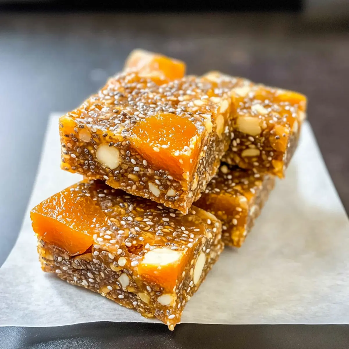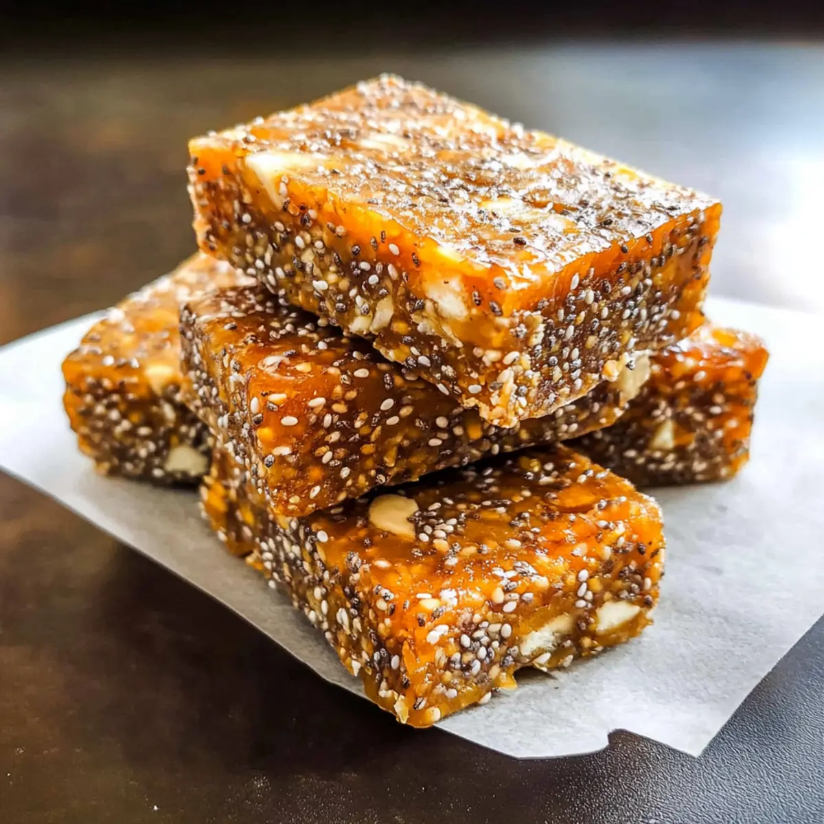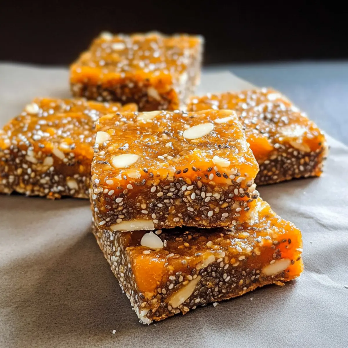 Mit einem Biss in diese köstlichen No-Bake Aprikosen Chia Energieriegel wird die Hektik des Alltags für einen Moment vergessen. Wer sagt, dass gesunde Snacks nicht auch leicht zuzubereiten sein können? Diese Riegel sind nicht nur glutenfrei und vegan, sondern auch nach einem langen Tag der ideale Energielieferant. Mit nur sechs einfachen Zutaten sind sie eine perfekte Lösung für alle, die sich schnell und gesund ernähren möchten, ohne auf Geschmack zu verzichten. Ob für die Schule, das Büro oder einfach als kleiner Genuss zwischendurch – diese kleinen Kraftpakete sind ein Hit bei Groß und Klein. Was haltet ihr davon, ein paar Riegel selbst zuzubereiten und euren Snack-Game auf die nächste Stufe zu heben? Warum lieben Sie diese Riegel? Einfachheit: Die Zubereitung dieser No-Bake Aprikosen Chia Energieriegel erfordert nur grundlegende Kochkenntnisse – perfekt für jeden! Gesunde Nascherei: Mit nur sechs Zutaten kombinieren diese Riegel gesunde Nährstoffe und natürlichen Geschmack, ideal für alle, die zwischen den Mahlzeiten snacken möchten. Vielseitigkeit: Variieren Sie die Zutaten nach Ihrem Geschmack – ob mit anderen Trockenfrüchten oder verschiedenen Schokoladen. Perfekter Snack für unterwegs: Dank ihrer handlichen Form sind sie der ideale Begleiter für Schule, Büro oder Outdoor-Aktivitäten. Nutritive Nährstoffe: Jeder Riegel steckt voller Energie und gesunder Fette, die Sie durch den Tag bringen! Lust auf mehr gesunde Rezepte? Probieren Sie auch unsere gesunden Snacks für Kinder für kreative Ideen! No-Bake Aprikosen Chia Energieriegel Zutaten Hinweis: Diese Zutaten sind einfach zu beschaffen und ergeben köstliche, gesunde Riegel. Medjool-Datteln: – Sie sorgen für natürliche Süße und eine zähe Textur. Ersatzweise können auch andere Trockenfrüchte wie Feigen verwendet werden. Getrocknete Aprikosen: – Sie verleihen einen fruchtigen Geschmack und unterstützen die zähe Konsistenz. Alternativ sind auch Rosinen oder Cranberries möglich. Chia-Samen: – Diese wirken als Bindemittel und liefern Ballaststoffe sowie Omega-3-Fettsäuren. Flachs samen können eine gute Alternative sein. Zimt: – Er fügt Wärme und Geschmack hinzu. Je nach Vorliebe kann die Menge reduziert oder ganz weggelassen werden. Rohe Kürbiskerne (Pepitas): – Sie sorgen für den nötigen Crunch und enthalten gesunde Fette. Sonnenblumenkerne sind ebenfalls eine tolle Option. Weiße Schokoladenstückchen: – Sie bringen Süße und eine cremige Textur. Für den veganen Ansatz können Sie auch dunkel Schokolade wählen. Diese No-Bake Aprikosen Chia Energieriegel sind nicht nur einfach zuzubereiten, sondern auch eine fantastische Wahl für diejenigen, die gesunde Snacks suchen! Schritt-für-Schritt-Anleitung für No-Bake Aprikosen Chia Energieriegel Step 1: Zutaten vorbereiten Beginnen Sie damit, die Medjool-Datteln zu entsteinen und gegebenenfalls die getrockneten Aprikosen in kleine Stücke zu schneiden. Dieser Schritt ist wichtig, um eine gleichmäßige Mischung zu gewährleisten. Legen Sie die vorbereiteten Zutaten auf einen Schneidebrett bereit, damit Sie sie später leicht in den Mixer geben können. Step 2: In der Küchenmaschine kombinieren Geben Sie die entsteinten Medjool-Datteln und die geschnittenen getrockneten Aprikosen in die Küchenmaschine. Mixen Sie die Zutaten etwa 1-2 Minuten lang, bis sie gut zerkleinert und eine klebrige, homogene Masse entsteht. Achten Sie darauf, dass keine großen Stücke zurückbleiben, da dies die Textur der No-Bake Aprikosen Chia Energieriegel beeinträchtigen könnte. Step 3: Trockene Zutaten mischen In einer großen Schüssel vermengen Sie die Chia-Samen, den Zimt und die rohen Kürbiskerne. Rühren Sie die trockenen Zutaten gründlich um, bis sie gleichmäßig verteilt sind. Diese Mischung wird dem Riegel sowohl Geschmack als auch eine gute Bindung verleihen, die für die Festigkeit der No-Bake Aprikosen Chia Energieriegel sorgt. Step 4: Mischungen kombinieren Gießen Sie die zerkleinerte Datteln-Aprikosen-Mischung in die Schüssel mit den trockenen Zutaten. Fügen Sie die weißen Schokoladenstückchen hinzu und vermischen Sie alles gut mit einem Löffel oder den Händen. Achten Sie darauf, dass die Zutaten gleichmäßig verteilt sind, um einen köstlichen, homogenen Riegel zu erhalten. Step 5: In die Form drücken Legen Sie eine 20×20 cm große Backform mit Backpapier aus und geben Sie die Mischung hinein. Drücken Sie die Masse mit den Händen oder einem Löffel fest an, um eine ebene und kompakte Schicht zu erstellen. Dies ist ein entscheidender Schritt, damit die No-Bake Aprikosen Chia Energieriegel nach dem Kühlen in schöne Stücke geschnitten werden können. Step 6: Kühlen Stellen Sie die Backform für etwa 30 Minuten in den Kühlschrank, damit die Riegel fest werden. Dies gibt den Chia-Samen Zeit, ihre gelartige Konsistenz zu entwickeln, was der Textur der Riegel zugutekommt. Überprüfen Sie nach dieser Zeit, ob die Mischung fest geworden ist und sich leicht aus der Form heben lässt. Step 7: Riegel schneiden Nach dem Kühlen nehmen Sie die Riegel aus der Form und schneiden Sie sie in gleichmäßige Stücke. Die No-Bake Aprikosen Chia Energieriegel sind jetzt fertig zum Genießen. Sie können die Riegel in einem luftdichten Behälter aufbewahren, damit sie frisch bleiben und jederzeit griffbereit sind. No-Bake Aprikosen Chia Energieriegel Variationen Entdecken Sie die Vielfalt, die mit diesen köstlichen Riegeln möglich ist und zaubern Sie ganz individuelle Snacks. Fruchtige Abwechslung: Ersetzen Sie die getrockneten Aprikosen durch Cranberries oder Mangostücke für eine süß-säuerliche Note. Diese kleinen Veränderungen können das Geschmackserlebnis komplett verändern! Schokoladentwist: Tauschen Sie die weißen Schokoladenstückchen gegen dunkle Schokolade aus. Dies sorgt für einen intensiveren, schokoladigen Geschmack, den Schokoladenliebhaber lieben werden. Nussige Ergänzung: Fügen Sie etwas gehackte Mandeln ode