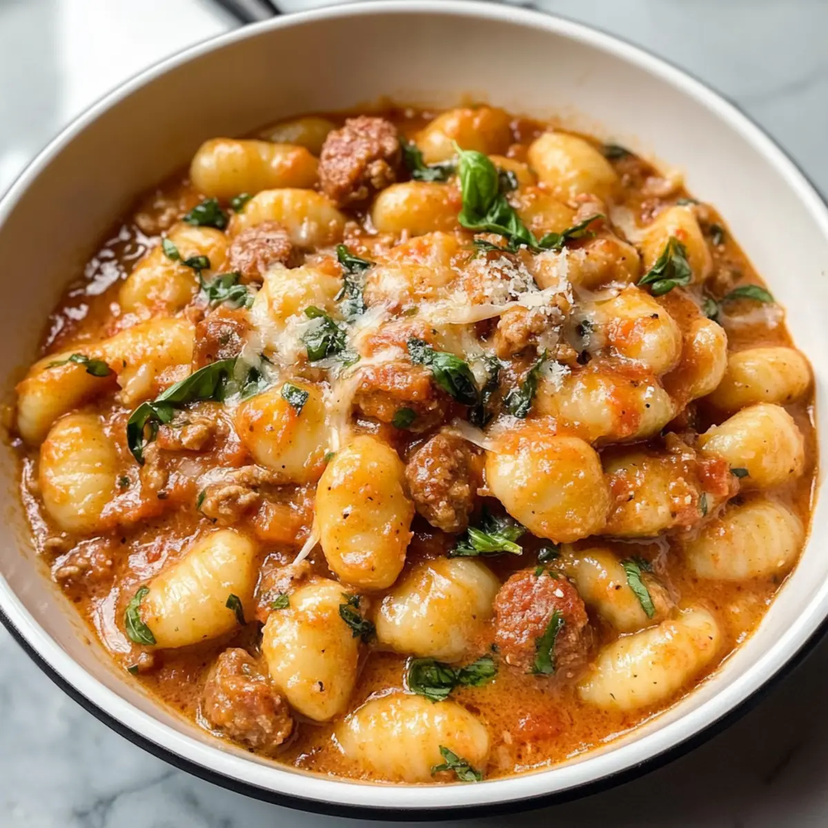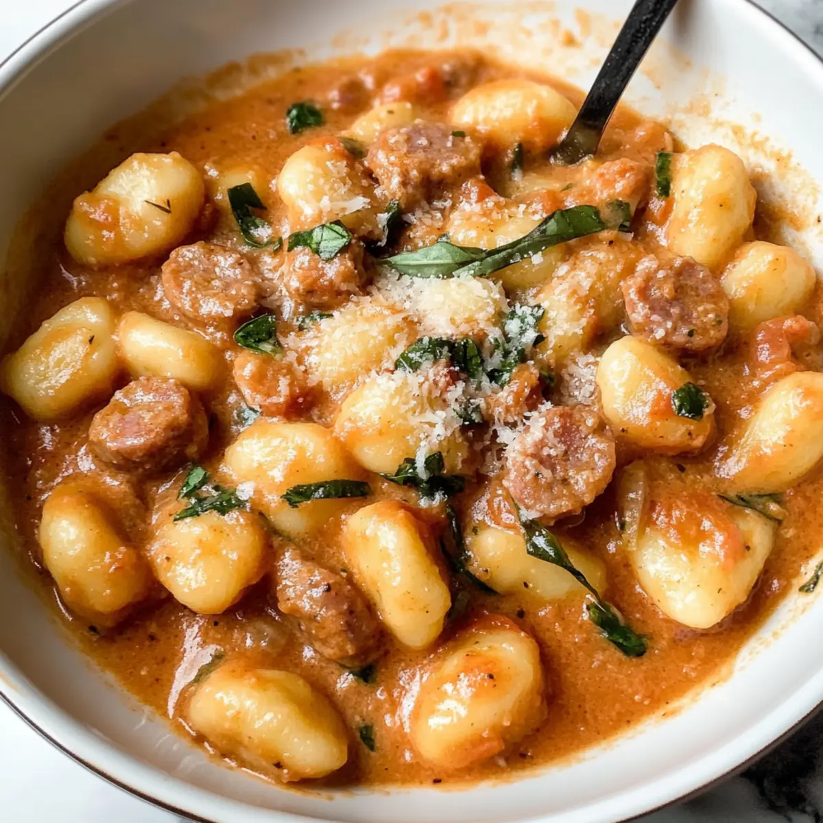 Wenn ich an einen perfekten Wochentag denke, dann ist es der, an dem sich die Aromen von Pfannen-Cremiger Gnocchi mit Wurst in meiner Küche entfalten. Diese schnelle und einfache Mahlzeit bietet nicht nur eine köstliche Kombination aus zarten Gnocchi und würziger italienischer Wurst, die in einer cremigen Tomatensoße simmernd vereint werden, sondern sie ist auch in nur 30 Minuten zubereitet! Ideal für geschäftige Abende, wenn man sich nach einer gemütlichen Portion Komfortessen sehnt, ohne stundenlang in der Küche zu stehen. Was könnte besser sein, als ein Gericht, das sowohl den Gaumen erfreut als auch die Freude am Kochen weckt? Also, bereit für den nächsten kulinarischen Genuss? Warum werden Sie dieses Rezept lieben? Einfachheit: Die Zubereitung ist unkompliziert und erfordert nur wenige grundlegende Kochfähigkeiten – perfekt für stressige Wochentage. Verführerischer Geschmack: Die harmonische Kombination aus würziger Wurst, fröhlichem Basilikum und cremiger Soße verwandelt jeden Bissen in ein Geschmackserlebnis. Klassisches Komfortessen: Diese Pfannen-Cremigen Gnocchi vereinen alle Elemente eines perfekten Wohlfühlgerichts. Genießen Sie die Aromen, die an italienische Hausmannskost erinnern. Vielseitigkeit: Ob mit frischem Blattspinat oder scharfer Wurst, dieses Rezept lässt sich leicht anpassen und bleibt dabei immer lecker. Überlegen Sie doch mal, die Königin der Kohlrouladen mit einer veganes Füllung zu kombinieren! Zeitersparnis: In nur 30 Minuten verwandeln Sie frische Zutaten in eine köstliche Mahlzeit, die die ganze Familie begeistern wird. Pfannen-Cremige Gnocchi Zutaten Für die Soße • Italienische Wurst – Hauptquelle für Protein mit robustem Geschmack; Sie können auch Bratwurst oder Wurstbrät verwenden. • Zwiebel – Fügt Süße und Tiefe hinzu; fein gehackt sorgt für eine gleichmäßige Verteilung im Gericht. • Knoblauch – Verstärkt das Aroma; frisch gehackt ist am besten. • Trockener Weißwein (z.B. Sauvignon Blanc) – Bringt Säure und Komplexität in die Soße; für eine alkoholfreie Variante kann Rinderbrühe genutzt werden. • Dose gehackte Tomaten (400 g mit Saft) – Basis der Soße, sorgt für Feuchtigkeit und Säure. • Schlagsahne (240 ml) – Kreiert eine reichhaltige, cremige Textur; direkter Ersatz wird nicht empfohlen, aber Halbrahm kann den Fettgehalt senken. Für die Gnocchi • Kartoffelgnocchi (450 g) – Hauptkohlenhydrat, kocht direkt in der Soße für Bequemlichkeit; kein Vorkochen nötig. • Parmesan (60 g, frisch gerieben) – Fügt Umami-Geschmack hinzu und macht die Soße cremiger. Für das Finish • Frisches Basilikum – Sorgt für Frische und Aroma; getrocknetes Basilikum kann in kleineren Mengen verwendet werden. • Salz und Pfeffer – Essentiell zum Würzen und zur Geschmacksverbesserung nach Geschmack. Genießen Sie diese Pfannen-Cremigen Gnocchi mit Wurst in einem kurzen und köstlichen Gericht! Schritt-für-Schritt-Anleitung für Pfannen-Cremige Gnocchi mit Wurst Schritt 1: Basis anbraten Erhitzen Sie eine große Pfanne bei mittlerer bis hoher Temperatur. Geben Sie die italienische Wurst und die fein gehackte Zwiebel hinzu und braten Sie beides etwa 7-10 Minuten lang an, bis die Wurst leicht gebräunt und die Zwiebel weich ist. Rühren Sie während des Bratens gelegentlich um, um ein gleichmäßiges Garen zu gewährleisten. Schritt 2: Aromatische Zutaten hinzufügen Fügen Sie den frisch gehackten Knoblauch zur Wurst-Zwiebel-Mischung in der Pfanne hinzu. Sautieren Sie alles für etwa 30 Sekunden, bis der Knoblauch duftet und leicht goldbraun ist. Achten Sie darauf, den Knoblauch nicht zu verbrennen, da er sonst bitter wird und den Geschmack der Pfannen-Cremigen Gnocchi mit Wurst beeinträchtigen könnte. Schritt 3: Mit Wein ablöschen Gießen Sie den trockenen Weißwein in die Pfanne und lassen Sie ihn etwa 1 Minute lang köcheln. Dadurch wird der Boden der Pfanne deglaziert, und die Aromen verbinden sich. Rühren Sie gut um, um eventuelle Reste vom Boden zu lösen und das Gericht noch schmackhafter zu machen. Schritt 4: Zutaten kombinieren Fügen Sie die gehackten Tomaten, die Schlagsahne und die Kartoffelgnocchi in die Pfanne hinzu. Rühren Sie alles gut um, bis die Mischung zu köcheln beginnt. Decken Sie die Pfanne ab und reduzieren Sie die Hitze auf mittlere Temperatur. Lassen Sie das Gericht für etwa 5 Minuten kochen, während die Gnocchi die Soße aufnehmen. Schritt 5: Endkochen Entfernen Sie den Deckel und rühren Sie die Mischung erneut um. Lassen Sie die Pfannen-Cremigen Gnocchi mit Wurst weiter köcheln, bis die Gnocchi weich sind und die Soße die gewünschte Konsistenz erreicht hat. Dies dauert weitere 3-5 Minuten; die Soße sollte leicht eindicken und cremig sein. Schritt 6: Fertigstellen Rühren Sie den frisch geriebenen Parmesan und die zerrissenen Basilikumblätter in die Pfanne. Schmecken Sie das Gericht anschließend mit Salz und Pfeffer ab. Wenn alles gut vermischt ist, servieren Sie die Pfannen-Cremigen Gnocchi mit Wurst umgehend, damit Sie die Aromen frisch genießen können. Lagerungstipps für Pfannen-Cremige Gnocchi mit Wurst Kühlschrank: Lagern Sie die Reste in einem luftdichten Behälter bis zu 3 Tagen. Achten Sie darauf, die Gnocchi gut zu bedecken, um das Austrocknen zu vermeiden. Aufwärmen: Erwärmen Sie die Pfannen-Cremigen Gnocchi mit Wurst vorsichtig auf dem Herd bei mittlerer Hitze, indem Sie etwas zusätzliche Sahne oder Brühe hinzufügen, um die cremige Textur zu erhalten. Gefrierschrank: Für eine längere Aufbewahrung können diese Gnocchi bis zu 2 Monate eingefroren werden. Verwenden Sie einen gefriersicheren Behälter, um Gefrierbrand zu vermeiden. Auftauen: Lassen Sie die gefrorenen Gnocchi über Nacht im Kühlschrank auftauen und erwärmen Sie sie dann wie oben beschrieben, um sicherzustellen, dass die Aromen gut erhalten bleiben. Pfannen-Cremige Gnocchi Variationen Entdecken Sie die Freude, Ihre Pfannen-Cremigen Gnocchi mit Wurst nach Ihrem Ge