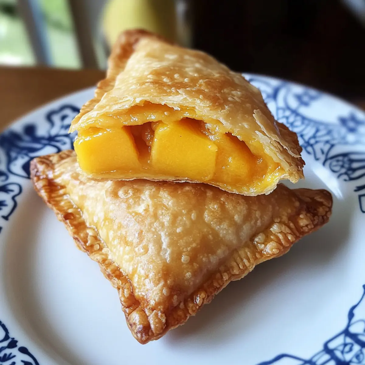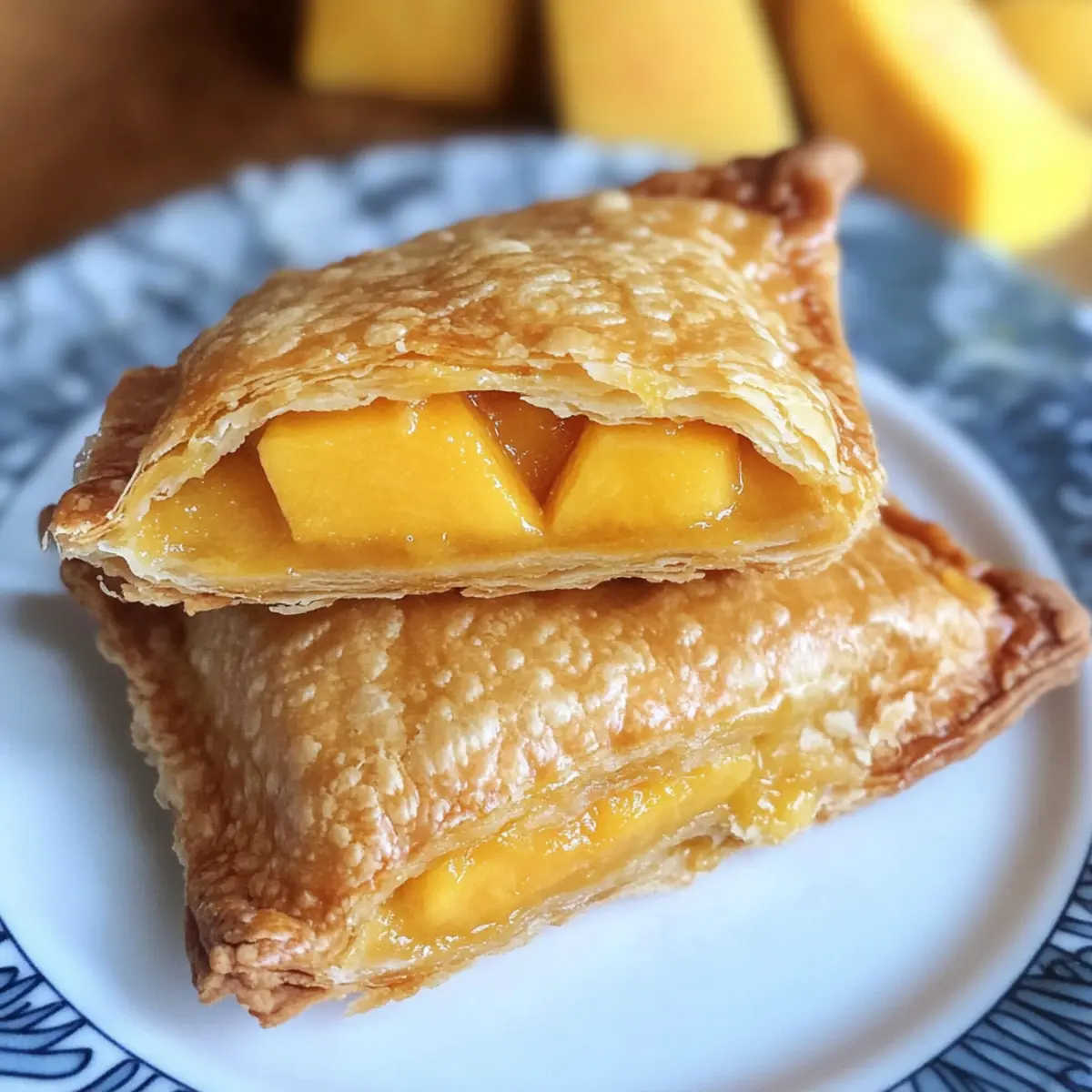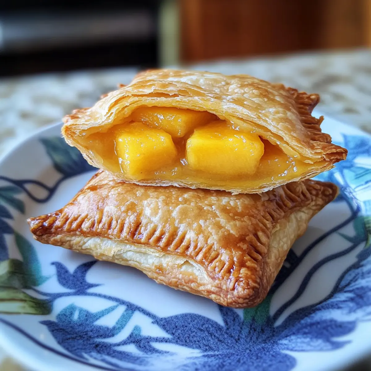 Ein schneller Genuss mit fruchtiger Füllung aus Pfirsichen und Mangos in knusprigem Blätterteig. Perfekt für Sommerabende! Pfirsich-Mango-Taschenkuchen.