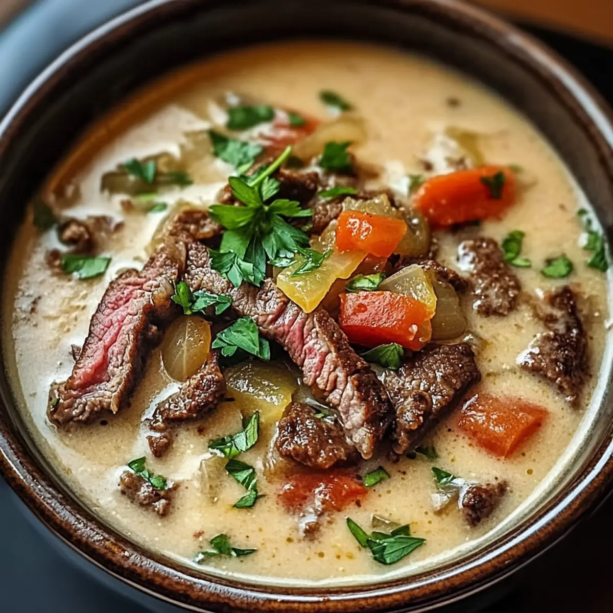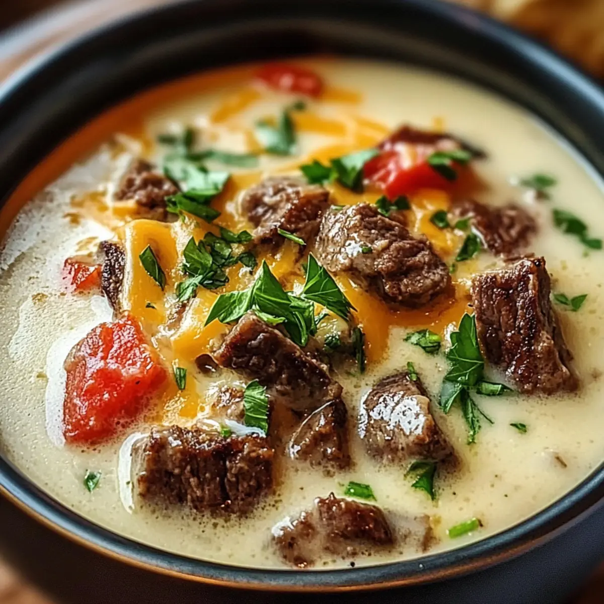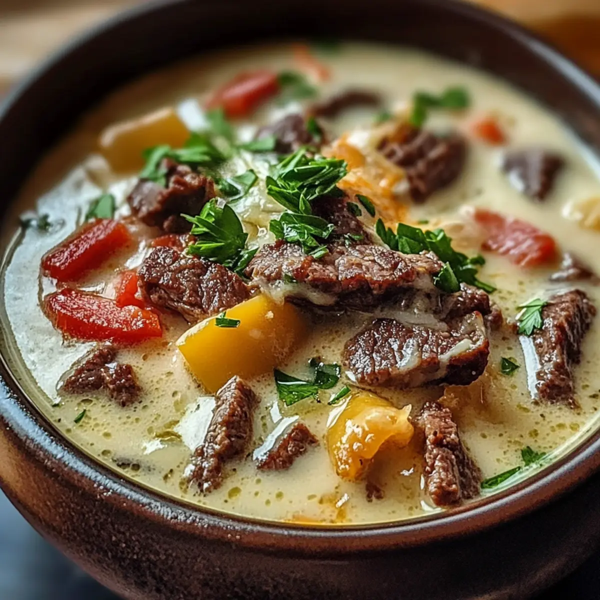 Gemütliches Kochen: Diese Philly-Cheesesteak-Suppe bringt die Wärme deiner Küche in jeden Bissen und ist perfekt für gesellige Abende mit Freunden und Familie.