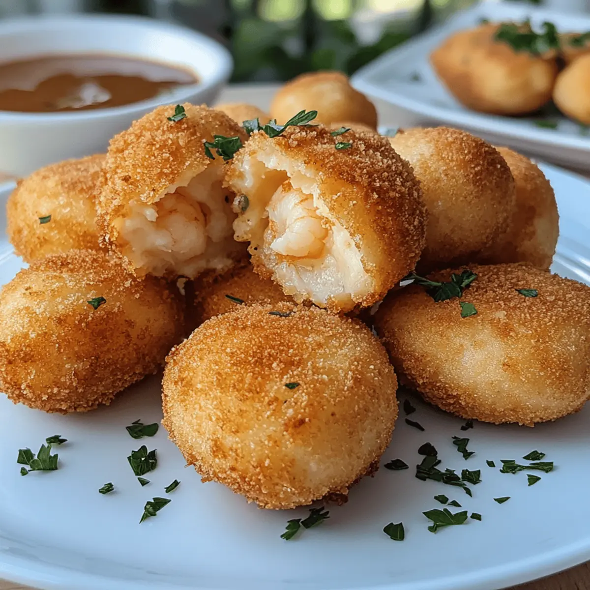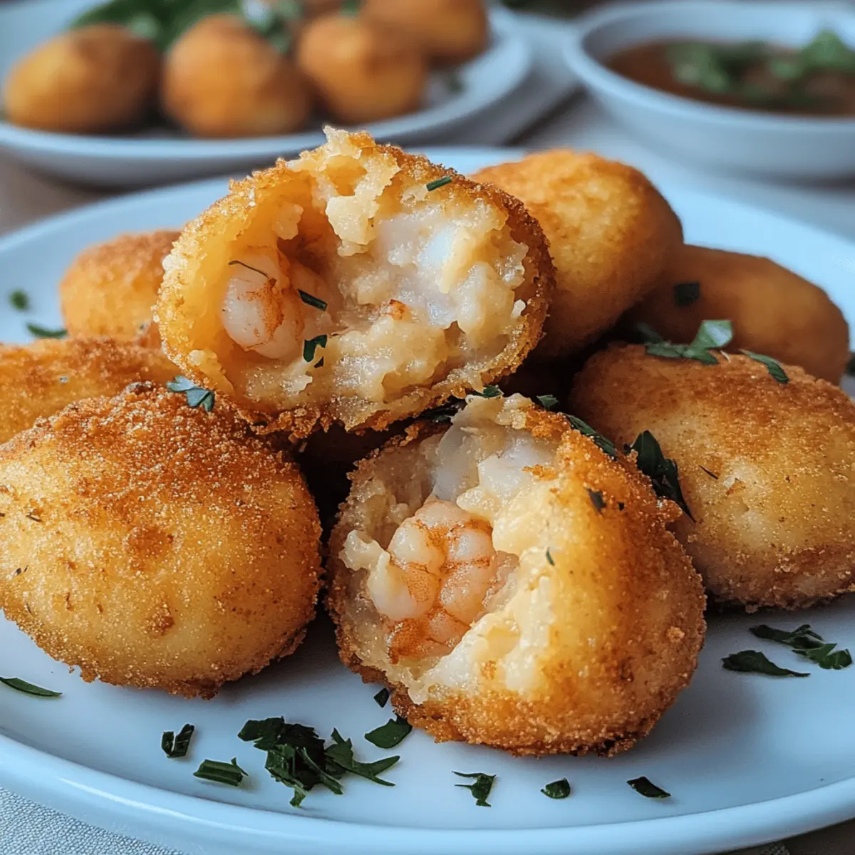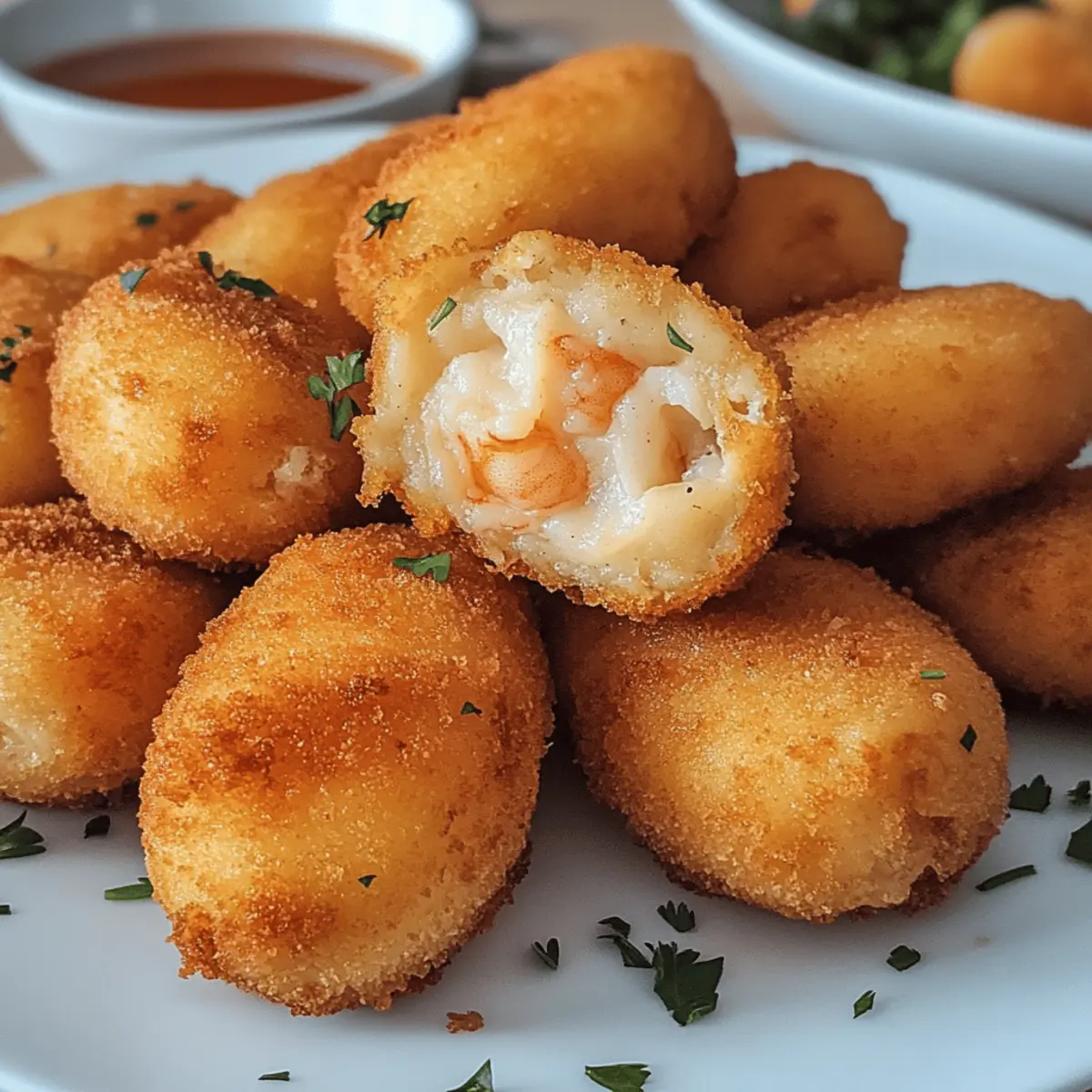 Hast du schon einmal den verlockenden Duft von frisch zubereiteten Spezialitäten aus Portugal eingeatmet? Bei meinen letzten kulinarischen Abenteuern entdeckte ich die schmackhaften Portugiesischen Shrimp Croquettes, die nicht nur ein Genuss für die Sinne sind, sondern auch eine wunderbare Möglichkeit bieten, Gäste zu beeindrucken oder einfach nur einen gemütlichen Abend zu bereichern. Diese köstlichen Leckerbissen kombinieren eine cremige Shrimpsfüllung mit einer goldbraunen, knusprigen Panade, die jeden Bissen zum Erlebnis macht. Schnell zubereitet und ideal als Snack oder Appetitanreger, sind sie die perfekte Lösung, um dem Alltag etwas Komfort zu verleihen. Wer könnte da widerstehen? Bist du bereit, diese kleinen Schatztruhen der Geschmackserlebnisse mit mir zu entdecken? Warum wirst du dieses Rezept lieben? Einfachheit, die begeistert: Die Zubereitung dieser kroatischen Köstlichkeit ist unkompliziert, sodass jeder sie meistern kann. Reiche, würzige Aromen: Die Kombination aus frischen Kräutern und Garnelen sorgt für ein geschmackliches Erlebnis, das die Geschmacksknospen verführt. Vielseitigkeit: Ob als Snack für deine nächste Feier oder als leckere Vorspeise – du kannst die Kroketten nach deinem Geschmack anpassen. Schnelle Zubereitung: Mit nur wenigen Schritten zaubern Sie in kürzester Zeit ein Gericht, das alle begeistert. Wenn du deine Kreativität entfalten möchtest, schaue dir auch mein Rezept für Mango Sago Dessert an. Perfekte Textur: Der kontrastreiche Crunch der Panade umhüllt die cremige Füllung – ein Genuss, der einfach süchtig macht. Crowd-Pleasing: Jeder wird dieseeinmaligen Kroketten lieben, egal ob bei einem Familienessen oder einer geselligen Runde mit Freunden! Deliziere sie beispielsweise mit einem frischen Salat oder einer Sauce, um das Erlebnis noch abzurunden. Zutaten für die portugiesischen Garnelen-Kroketten Für die Füllung: Garnelen – Essenziell für die Füllung, die einen reichen Meeresgeschmack bietet. Du kannst frische oder gefrorene Garnelen verwenden. Kartoffelpüree – Dient als Bindemittel und verleiht den Kroketten eine cremige Textur. Übrig gebliebenes Kartoffelpüree eignet sich hervorragend. Knoblauch – Verstärkt das Geschmacksprofil und fügt Tiefe hinzu. Kräuter (z.B. Petersilie, Koriander) – Bringen Frische und Farbe in die Füllung. Semmelbrösel – Schafft eine knusprige Panade für den Texturkontrast. Panko-Semmelbrösel können für zusätzlichen Crunch verwendet werden. Ei – Hilft, die Mischung zu binden und wird zum Panieren vor den Semmelbröseln verwendet. Salz und Pfeffer – Würzen alle Aromen und heben den Geschmack hervor. Für die Panade: Semmelbrösel – Bietet den charakteristischen Crunch, perfekt für die knusprige Außenlage der Kroketten. Optional kannst du Panko verwenden, für extra Knusprigkeit. Die portugiesischen Garnelen-Kroketten sind ein Genuss, den du dir nicht entgehen lassen solltest! Schritt-für-Schritt-Anleitung für Knusprige portugiesische Garnelen-Kroketten Step 1: Füllung vorbereiten Erhitze eine große Pfanne bei mittlerer Hitze und füge einen Schuss Öl hinzu. Sauté den gehackten Knoblauch für etwa 1-2 Minuten, bis er duftet. Gib dann die Garnelen dazu und brate sie, bis sie rosa und durchgegart sind, ca. 3-4 Minuten. Vermenge die Garnelen mit dem Kartoffelpüree und den frisch gehackten Kräutern. Mit Salz und Pfeffer abschmecken und in eine Schüssel umfüllen, damit die Füllung abkühlen kann. Step 2: Kroketten formen Sobald die Füllung abgekühlt ist, forme mit deinen Händen kleine Patties oder Bällchen, etwa in der Größe eines Tischtennisballs. Bereite eine Schüssel mit geschlagenem Ei und eine zweite Schüssel mit Semmelbröseln vor. Tauche jede Form in das Ei, damit die Semmelbrösel haften, und wälze sie anschließend gründlich in den Semmelbröseln, um eine gleichmäßige Schicht zu erhalten. Step 3: Frittieren oder Backen Erhitze in einer tiefen Pfanne ausreichend Öl auf 180°C (350°F). Fritte die Kroketten portionsweise für etwa 3-4 Minuten, bis sie goldbraun und knusprig sind. Alternativ kannst du die Kroketten auf ein Backblech legen, mit etwas Öl besprühen und im vorgeheizten Ofen bei 200°C (400°F) für ca. 20 Minuten backen, bis sie schön goldbraun sind. Step 4: Servieren Nimm die knusprigen portugiesischen Garnelen-Kroketten aus dem Öl oder Ofen und lasse sie kurz auf Küchenpapier abtropfen, um überschüssiges Fett zu entfernen. Serviere sie warm mit einer passenden Dipsauce, wie z.B. Aioli oder einer scharfen Remoulade, und vielleicht einem frischen Salat als Beilage für ein rundum gelungenes Gericht. Was passt zu knusprigen portugiesischen Garnelen-Kroketten? Genieße die Aromen der Küste mit einer sorgfältig zusammengestellten Beilage, die dein Geschmackserlebnis noch bereichert. Frischer Blattsalat: Ergänzt die warmen Kroketten mit einem knackigen Kontrast und leichtem Dressing für ein erfrischendes Zusammenspiel. Knoblauch-Aioli: Diese cremige und aromatische Sauce verleiht den Kroketten einen zusätzlichen Geschmackskick und passt hervorragend dazu. Pikante Remoulade: Eine würzige Dip-Sauce, die die Aromen der Garnelen-Kroketten wunderbar unterstreicht und für geschmackliche Tiefe sorgt. Zitronenspalten: Ein Spritzer frischer Zitrone bringt eine lebendige Säure mit, die die Fülle der Kroketten ausgleicht. Baguette: Serviere knusprige Stücke dazu, wenn du eine herzhafte Textur und einen freundschaftlichen Austausch von Aromen suchst. Weißwein: Ein trockener, fruchtiger Weißwein rundet das Gericht ab und sorgt für eine harmonische Verbindung der Aromen. Cremiges Kartoffelpüree: Eine zusätzliche, buttrige Seite, die das Gericht besonders schmeichelhaft macht und schön sättigt. Aufbewahrungstipps für portugiesische Garnelen-Kroketten Zimmertemperatur: Auf ungenutzte Kroketten solltest du verzichten, da sie schnell an Qualität verlieren und nicht länger als 1–2 Stunden draußen bleiben sollten. Kühl