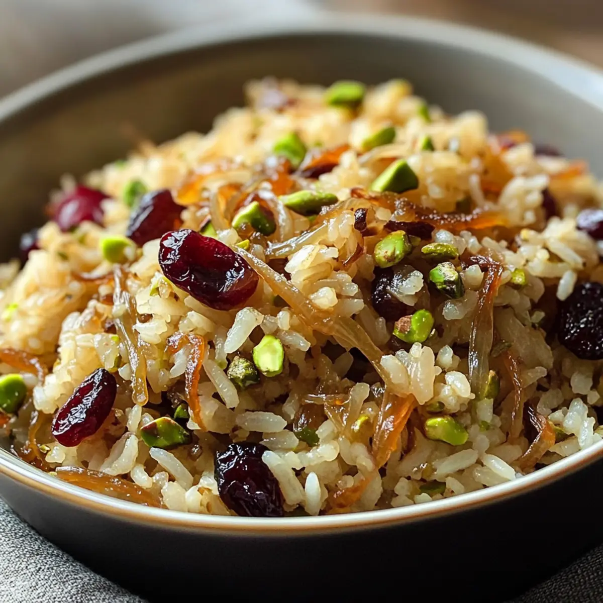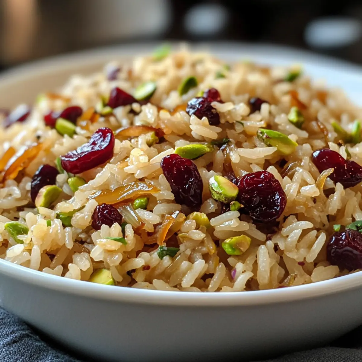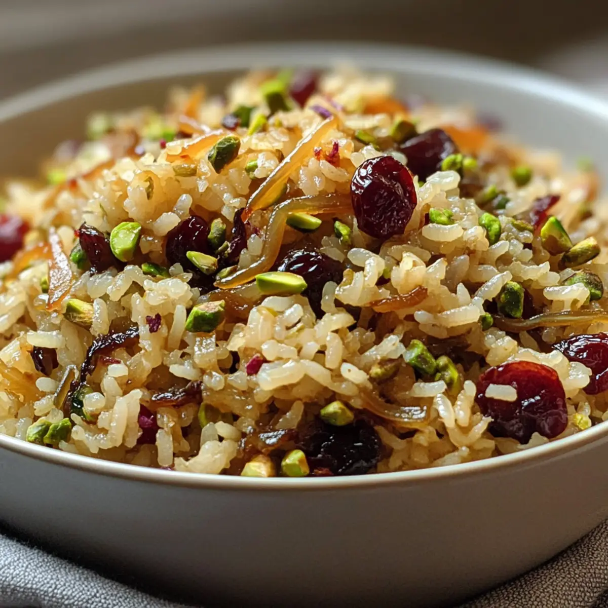 Als ich neulich in meinem Lieblingsmarkt stöberte, fiel mir die strahlend orangefarbene Schale mit erfrischenden Orangen ins Auge. Sofort dachte ich an einen köstlichen Reis-Pilaw, der genau die richtige Balance zwischen süß und herzhaft vereint. Dieser aromatische Exotic Reis-Pilaw mit karamellisierten Zwiebeln und Kirschen ist nicht nur ein quick and easy Gericht, sondern auch eine versatile Beilage, die jedes einfache Hauptgericht wie gebratenen Lachs oder Brathähnchen aufwertet. Bereit in nur 30 Minuten, ist er perfekt für stressige Wochentage und begeistert garantiert alle am Tisch. Wer könnte bei dieser delikaten Mischung aus Gewürzen und fruchtiger Süße widerstehen? Ich kann es kaum erwarten, meine Geheimnisse mit Ihnen zu teilen – sind Sie bereit, Ihr nächstes Meisterwerk zu kreieren? Warum lieben Sie diesen Reis-Pilaw? Einfachheit: Die Zubereitung ist kinderleicht und erfordert nur grundlegende Kochfähigkeiten. Schnell und praktisch: In nur 30 Minuten servierbereit, perfekt für hektische Wochentage! Vielfältig: Dieser Reis-Pilaw harmoniert nicht nur mit gebratenem Lachs, sondern passt auch hervorragend zu gebratenem Gemüse oder einer herzhaften Bratenvorspeise. Aromatische Aromen: Die Kombination aus karamellisierten Zwiebeln und süßen Kirschen verleiht dem Gericht eine einzigartige Geschmacksrichtung, die jeden Gaumen erfreut. Gesellig: Ideal, um Gäste zu beeindrucken oder einfach nur um Ihr Abendessen in etwas Besonderes zu verwandeln. Lassen Sie sich inspirieren und probieren Sie auch unseren Okonomiyaki Japanische Kohlpfannkuchen oder die Krosse Pfannkuchen Haehnchenfuellung für weitere kreative Beilagen! Reis-Pilaw Zutaten Für den Pilaw • Ungesalzene Butter – Sorgt für Reichtum und Geschmack; verwenden Sie Olivenöl für eine milchfreie Version. • Zwiebeln – Bringen Süße und Tiefe, wenn sie karamellisiert werden; verwenden Sie gelbe oder süße Zwiebeln für die besten Ergebnisse. • Gemahlenen Kreuzkümmel – Fügt warme, erdige Noten hinzu; versuchen Sie Koriander für ein anderes Geschmacksprofil. • Gemahlener Zimt – Verleiht Wärme; für eine einzigartige Note probieren Sie Kardamom. • Salz – Verbessert den Gesamteindruck; an persönliche Ernährungsbedürfnisse anpassen. • Schwarzer Pfeffer – Fügt milde Schärfe hinzu; frisch gemahlen ist für den besten Geschmack empfehlenswert. • Orange – Zest und Saft bringen Frische und Säure; Zitronen können als Ersatz verwendet werden. • Gesüßte, getrocknete Sauerkirschen – Sorgen für Süße und Textur; getrocknete Cranberries können ebenfalls verwendet werden. • Langkornreis – Bildet die Basis des Pilaws; brauner Reis kann verwendet werden, benötigt jedoch eine längere Kochzeit. • Ungesalzene, geschälte Pistazien – Fügt Knusprigkeit und nussigen Geschmack hinzu; Mandeln sind eine gute Alternative. Für die Garnitur • Frische Petersilie – Bringt Farbe und einen frischen Geschmack; gerne auch Minze für eine andere Note. • Zitronenscheiben – Zum Dekorieren und für zusätzliche Frische bei der Servierung. Dieser Reis-Pilaw ist nicht nur schnell zubereitet, sondern ein echtes Highlight auf jedem Tisch! Schritt-für-Schritt-Anleitung für den leckeren Reis-Pilaw mit karamellisierten Zwiebeln Step 1: Zwiebeln karamellisieren In einer Pfanne die ungesalzene Butter bei mittlerer Hitze schmelzen. Die geschnittenen Zwiebeln hinzufügen und etwa 20-25 Minuten lang garen, bis sie zart und goldbraun sind. Gelegentlich mit Wasser ablöschen, um ein Anbrennen zu vermeiden. Diese Zwiebeln werden die süße Basis für unseren Reis-Pilaw sein. Step 2: Gewürze vorbereiten Fügen Sie den gemahlenen Kreuzkümmel und den Zimt zu den karamellisierten Zwiebeln hinzu und braten Sie alles eine weitere Minute an. Mit Salz und frisch gemahlenem schwarzen Pfeffer abschmecken. Stellen Sie die Zwiebelmischung beiseite, während Sie die nächsten Schritte vorbereiten. Step 3: Zwiebeln würfeln und anbraten In einem separaten Topf die verbleibende Butter bei mittlerer bis niedriger Hitze schmelzen. Die gewürfelten Zwiebeln hinzufügen und etwa 5 Minuten lang dünsten, bis sie weich und durchscheinend sind. Diese Zwiebeln werden dem Reis-Pilaw zusätzliches Aroma verleihen. Step 4: Reis rösten Fügen Sie den Langkornreis und eine Prise Salz in den Topf mit den weichgekochten Zwiebeln hinzu. Rühren Sie ihn um, sodass der Reis gut mit der Butter überzogen ist. Rösten Sie den Reis für etwa 5 Minuten bei niedriger Hitze, bis er leicht duftet und eine goldene Farbe annimmt. Step 5: Reis kochen Gießen Sie Wasser in den Topf und bringen Sie es zum Kochen. Decken Sie dann den Topf ab und reduzieren Sie die Hitze auf niedrig. Lassen Sie den Reis-Pilaw für 18 Minuten köcheln. Nach dem Kochen den Topf vom Herd nehmen und den Reis noch 5 Minuten zugedeckt ruhen lassen. Step 6: Zutaten kombinieren Lockern Sie den Reis vorsichtig mit einer Gabel auf. Fügen Sie die karamellisierten Zwiebeln, die abgetropften Kirschen, die Pistazien und die Orangenschale hinzu. Sanft unterheben, um alle Zutaten gleichmäßig zu vermischen und den Reis-Pilaw zu vervollständigen. Step 7: Abschmecken und würzen Probieren Sie den Reis-Pilaw und passen Sie die Gewürze nach Belieben an. Gegebenenfalls mit zusätzlichem Salz, Pfeffer und Orangenschale abschmecken. Dieser letzte Schliff sorgt dafür, dass die Aromen im Reis-Pilaw perfekt zur Geltung kommen. Tipps zur Vorbereitung des Reis-Pilaw für stressfreie Wochentage Dieser leckere Reis-Pilaw mit karamellisierten Zwiebeln kann wunderbar im Voraus zubereitet werden, was Ihnen wertvolle Zeit spart! Beginnen Sie damit, die karamellisierten Zwiebeln bis zu 24 Stunden vorher zu kochen und im Kühlschrank aufzubewahren. Auch die Pistazien und die getrockneten Kirschen können Sie bis zu 3 Tage vor dem Servieren vorbereiten und in einem luftdichten Behälter lagern. Wenn es Zeit ist, zu genießen, wärmen Sie einfach den Reis-Pilaw in einem Topf bei niedriger