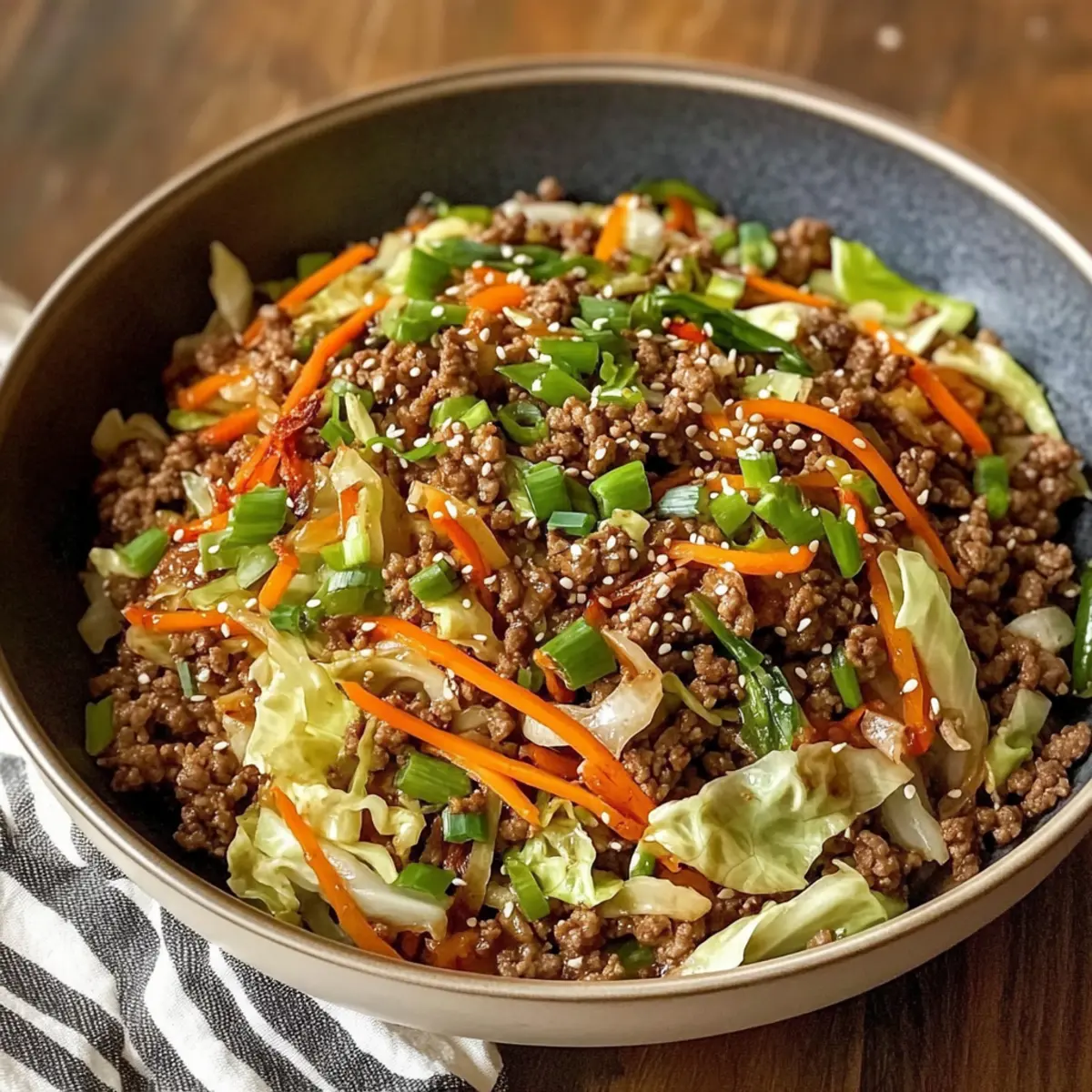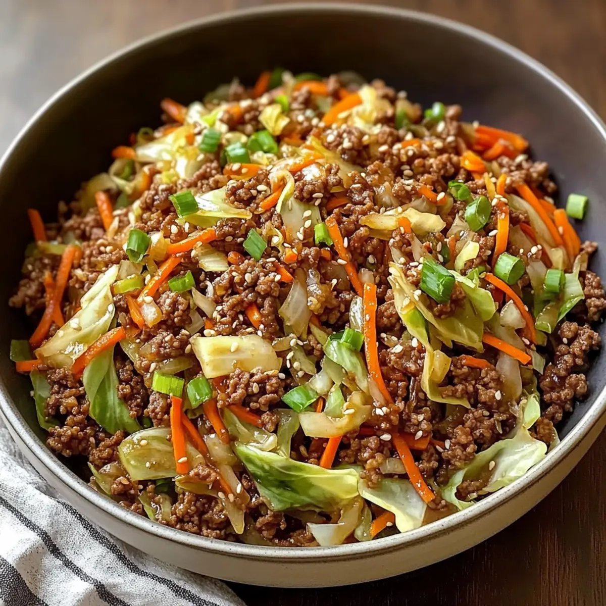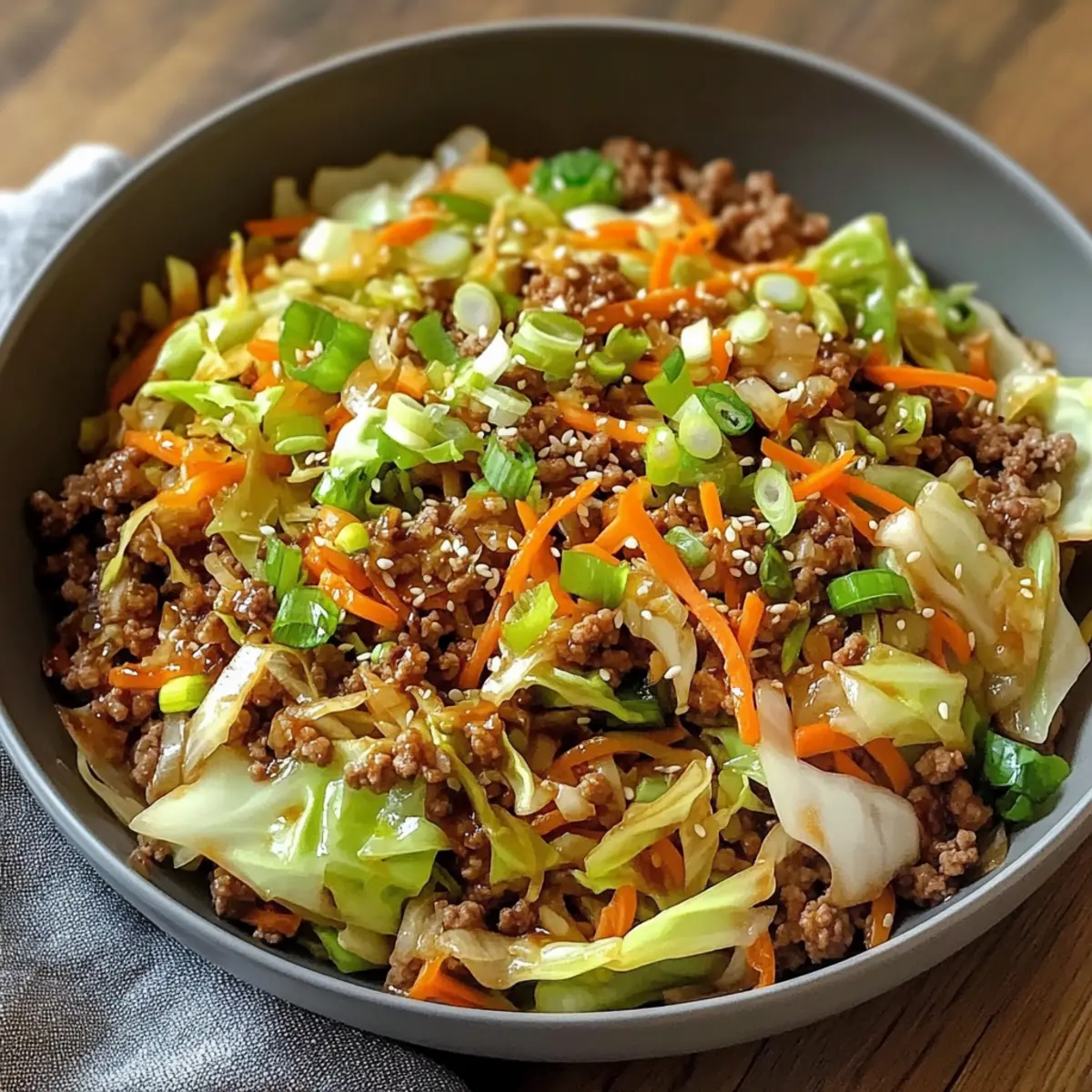 Die köstlichen Aromen einer Rinderhackfleisch und Kohl Pfanne erleben zu dürfen, fühlt sich an, als würde man in eine Welt voller Genuss eintauchen. In nur 30 Minuten zaubern wir ein schnelles, nahrhaftes Abendessen, das dem hektischen Alltag mühelos trotzt. Diese schmackhafte Pfanne vereint zartes Rinderhackfleisch mit knackigem Kohl zu einem echten Wohlfühlgericht, das sich perfekt für stressige Wochentage eignet. Egal, ob du mit Freunden oder Familie speist, dieses Gericht ist ein echter Publikumsmagnet, der alle begeistert! Was hältst du davon, kreativ zu werden und deine eigenen Zutaten zu integrieren? Lass uns gemeinsam in die Welt der schnellen und köstlichen Küche eintauchen! Warum wirst du dieses Rezept lieben? Einfachheit: Die Zubereitung ist kinderleicht und benötigt lediglich grundlegende Kochfähigkeiten, perfekt für gestresste Wochentage. Vielseitigkeit: Du kannst ganz nach deinem Geschmack variieren, indem du andere Gemüse oder Fleischsorten wie Rinderhackfleisch und Kohl Pfanne verwendest. Schnelligkeit: In nur 30 Minuten hast du ein köstliches Abendessen auf dem Tisch, ideal für schnelllebige Abende. Aromatische Fusion: Die Kombination aus Sesamöl, Sriracha und frischen Aromen sorgt für ein Geschmackserlebnis, das begeistert. Crowd-Pleaser: Ob Familie oder Freunde – jeder wird von diesem bunten, nahrhaften Gericht begeistert sein! Rinderhackfleisch und Kohl Pfanne Zutaten Für die Sauce • Sojasauce – sorgt für umami Tiefe und Salzigkeit; ggf. mit Tamari als glutenfreie Option ersetzen. • Sesamöl – verleiht nussige Fülle; kann durch Rapsöl ersetzt werden, wenn nicht verfügbar. • Sriracha – bietet Schärfe und Hitze; Menge nach gewünschter Schärfe anpassen oder durch andere scharfe Soße ersetzen. • Brauner Zucker – bringt Süße ins Spiel; Honig oder Ahornsirup sind gute Alternativen. • Reisessig – sorgt für Säure, die das Gericht aufhellt; Zitronensaft kann ebenfalls verwendet werden. Für das Gemüse • Kohl (½ Kopf) – ist das Hauptgemüse und sorgt für Crunch; grüner Kohl ist ideal, kann aber durch Napa- oder Rotkohl ersetzt werden. • Karotten (2, geraspelt oder dünn geschnitten) – sorgen für Süße und Farbe; Sellerie kann als Alternative genutzt werden. • Frühlingszwiebeln (3, geschnitten) – geben einen frischen, milden Zwiebelgeschmack; Porree kann bei Bedarf substituiert werden. Für die Hauptzutaten • Kochöl (½ EL, Trauben- oder Pflanzenöl) – wird zum Anbraten des Rinderhackfleischs verwendet; jedes neutrale Öl funktioniert. • Rinderhackfleisch (¾ Pfund) – die Hauptproteinquelle; für eine magerere Option kann auch Puten- oder Hühnerhack verwendet werden. • Knoblauch (2 Zehen, gehackt) – sorgt für aromatischen Geschmack; Schalotten können für eine süßere Note verwendet werden. • Ingwer (1,5 EL, frisch gerieben) – gibt einen würzigen Kick; gemahlener Ingwer kann im Notfall verwendet werden. • Salz & Pfeffer – zum Würzen; nach Geschmack anpassen. • Sesamkörner (1 EL) – als Garnitur verwendbar; können weggelassen oder durch zerdrückte Erdnüsse ersetzt werden für extra Crunch. Diese köstliche Rinderhackfleisch und Kohl Pfanne ist eine schnelle und einfache Lösung, um dein Abendessen aufzupeppen! Step-by-Step Instructions for Rinderhackfleisch und Kohl Pfanne Step 1: Sauce zubereiten In einer Schüssel die Sojasauce, das Sesamöl, die Sriracha, den braunen Zucker und den Reisessig gut vermischen, bis sich der Zucker aufgelöst hat. Diese aromatische Mischung ist die Grundlage für deine Rinderhackfleisch und Kohl Pfanne. Stelle die Sauce beiseite, während du die restlichen Zutaten vorbereitest. Step 2: Gemüse vorbereiten Schneide den Kohl in Streifen, raspel die Karotten und schneide die Frühlingszwiebeln in Ringe. Hacke den Knoblauch fein und reibe den Ingwer frisch. Achte darauf, dass alle Zutaten bereit sind, bevor du mit dem Kochen beginnst; so kannst du die Rinderhackfleisch und Kohl Pfanne schnell zubereiten. Step 3: Hackfleisch braten Erhitze in einer großen Pfanne oder einem Wok ½ Esslöffel Kochöl bei mittelhoher Hitze. Füge das Rinderhackfleisch hinzu und zerteile es mit einem Spatel. Brate das Fleisch für etwa 2-3 Minuten, bis es außen schön gebräunt ist. Achtung: Überfülle die Pfanne nicht, damit das Fleisch schön anbräunt. Step 4: Aromatische Zutaten hinzufügen Gib den gehackten Knoblauch und den frisch geriebenen Ingwer zum gebratenen Rinderhackfleisch. Sauté für 30 Sekunden, bis die Aromen freigesetzt werden. Würze diese Mischung mit etwas Salz und Pfeffer, um den Geschmack deiner Rinderhackfleisch und Kohl Pfanne zu intensivieren. Step 5: Gemüse hinzufügen Füge den geschnittenen Kohl und die Karotten in die Pfanne hinzu. Rühre alles gut um und brate es für 3-4 Minuten an, bis das Gemüse leicht weich, aber immer noch knackig ist. So bleibt die schöne Textur und der frische Geschmack der Rinderhackfleisch und Kohl Pfanne erhalten. Step 6: Sauce einrühren Gieße die vorbereitete Sauce über das Gemüse und das Hackfleisch. Vermische alles gut, damit sich die Aromen gleichmäßig verteilen. Füge die geschnittenen Frühlingszwiebeln hinzu und rühre nochmals für 1 Minute, damit alles gut erhitzt wird und die Sauce leicht eindickt. Step 7: Servieren Verteile die Rinderhackfleisch und Kohl Pfanne auf Schalen. Garniere jede Portion mit Sesamkörnern und ggf. zusätzlicher Sriracha für mehr Schärfe. Serviere das Gericht heiß, idealerweise über gedämpftem Reis oder Nudeln, damit du die leckeren Aromen wirklich genießen kannst. Expertentipps für die Rinderhackfleisch und Kohl Pfanne Vorbereitung ist alles: Achte darauf, alle Zutaten vor dem Kochen bereitzustellen; so verkürzt sich die Zubereitungszeit und das Kochen bleibt stressfrei. Nicht überfüllen: Achte darauf, die Pfanne beim Braten des Rinderhackfleischs nicht zu überladen; das verhindert einen schönen Bräunungsprozess. Richtige Temperatur: Erhitze die Pfanne