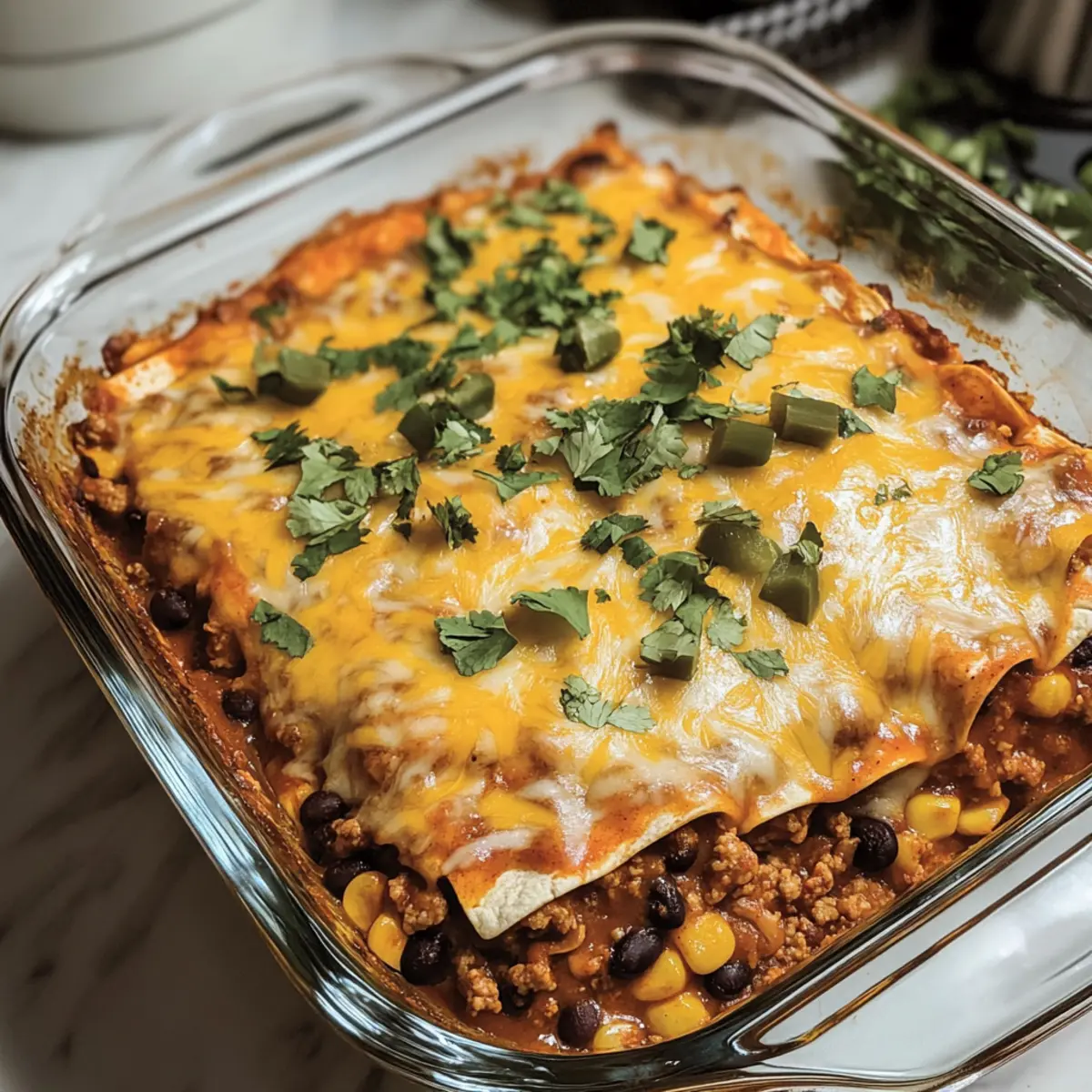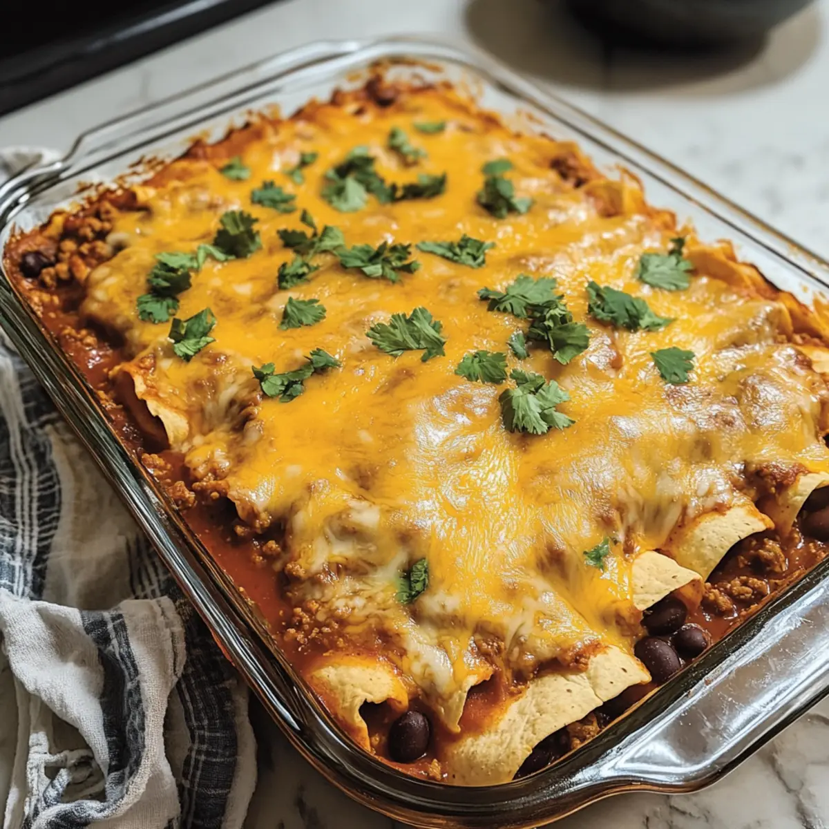 Weißt du, was mich immer wieder aufmuntert? Ein köstlicher Rindfleisch Enchilada Auflauf, der nicht nur die Geschmacksknospen begeistert, sondern auch eine echte Umarmung für die Seele ist. Diese herzhafte Mischung aus gewürztem Rinderhackfleisch, schmelzendem Käse und würziger Sauce vereint alles, was wir an Komfortessen lieben. Und das Beste daran? Der Auflauf ist nicht nur in der Zubereitung schnell und einfach, sondern macht auch am nächsten Tag noch hervorragende Reste! Wenn du auf der Suche nach einem Gericht bist, das deine ganze Familie zusammenbringt und gleichzeitig Möglichkeiten für vegetarische oder kohlenhydratarme Varianten bietet, dann ist dieser Auflauf genau das Richtige für dich. Bist du bereit, in die Welt der herzhaften Aromen einzutauchen? Warum wirst du diesen Auflauf lieben? Einfachheit: Dieser Rindfleisch Enchilada Auflauf ist unkompliziert zuzubereiten, perfekt für geschäftige Wochentage. Einfach alles in eine Form schichten und ab in den Ofen! Vielfältige Variationen: Ob du einen vegetarischen oder kohlenhydratarmen Auflauf möchtest, hier findest du Passende für jeden Geschmack – denk an Linsen oder Zucchini! Herzhafter Geschmack: Die Kombination aus gewürztem Rinderhack und schmelzendem Käse bietet ein Geschmackserlebnis, das jede Küche belebt. Tolle Reste: Diese Mahlzeit schmeckt am nächsten Tag sogar noch besser, ideal für das Mittagessen! Zufriedenheitsgarantie: Mit einem Auflauf, der die ganze Familie vereint, wird jeder an deinem Tisch glücklich sein. Probiere es auch mit frischer Guacamole oder Sour Cream als Beilage für noch mehr Genuss! Rindfleisch Enchilada Auflauf Zutaten • Hinweis: Hier sind die Zutaten für den Rindfleisch Enchilada Auflauf – eine köstliche Kombination, die die gesamte Familie begeistern wird! Für die Füllung Rinderhackfleisch – sorgt für eiweißreiche Sättigung und herzhaften Geschmack; für eine vegetarische Variante können Linsen oder fein gehackte Pilze verwendet werden. Zwiebel – fügt eine aromatische Tiefe hinzu; verwende gewürfelte Zwiebeln sowohl in der Füllung als auch in der Sauce für mehr Geschmack. Grüne Chilis – bringen eine angenehme Schärfe; sie sind eine perfekte Ergänzung zur Füllung. Schwarze Bohnen – bieten Textur und zusätzliche Nährstoffe; sie runden das Geschmackserlebnis ab. Für die Tortillas Mais-Tortillas – bilden die Basis des Auflaufs; du kannst auch dünn geschnittene Zucchini oder Blumenkohl-Tortillas für eine kohlenhydratarme Option verwenden. Für den Käse Colby Jack Käse – sorgt für eine cremige und schmelzende Textur; du kannst auch milchfreie Käsealternativen verwenden, um den Auflauf laktosefrei zu machen. Für die Sauce Hühnerbrühe – verleiht der Sauce einen herzhaften Geschmack; ersetze sie durch Gemüsebrühe für eine vegetarische Variante. Tomatensauce – ist eine Basis für die cremige Sauce; sorgt für die nötige Fruchtigkeit. Knoblauch – fügt eine aromatische Geschmackskomponente hinzu; frisch gehackter Knoblauch verstärkt das Aroma. Mehl – dient zur Verdickung der Sauce; optional, um eine glattere Konsistenz zu erzielen, kannst du die Sauce pürieren. Für die Gewürze Chilipulver & Kreuzkümmel – liefern den charakteristischen mexikanischen Geschmack; diese Gewürze sind unverzichtbar für diesen Auflauf. Bereite dich darauf vor, in die Welt des Rindfleisch Enchilada Auflaufs einzutauchen – ein Gericht, das deine Sinne verzaubern wird! Schritt-für-Schritt-Anleitung für Rindfleisch Enchilada Auflauf Step 1: Ofen vorheizen und Backform vorbereiten Heize den Ofen auf 175°C vor und spray die 9×13 Zoll große Backform mit etwas Kochspray ein, um ein Anhaften zu vermeiden. Dies sorgt dafür, dass dein Rindfleisch Enchilada Auflauf später leicht herausgenommen werden kann und eine schöne goldene Kruste bildet. Step 2: Zwiebeln anbraten Erhitze in einer großen Pfanne etwas Öl und füge die gewürfelten Zwiebeln hinzu. Brate sie für etwa 5 Minuten unter gelegentlichem Rühren, bis sie weich und durchscheinend sind. Diese aromatischen Zwiebeln werden die Basis für die köstliche Füllung deines Auflaufs sein. Step 3: Gewürze und Sauce hinzufügen Streue nun das Chilipulver und den Kreuzkümmel über die Zwiebeln und lass alles für eine weitere Minute braten, um die Aromen hervorzuheben. Füge dann das Mehl hinzu und rühre gut um. Gieße nach und nach die Hühnerbrühe, die Tomatensauce und den frisch gehackten Knoblauch hinein, während du ständig rührst. Lass die Sauce 5 Minuten lang leicht köcheln. Step 4: Rinderhackfleisch anbraten In einer separaten Pfanne erhitzt du auf mittlerer Hitze etwas Öl und brätst das Rinderhackfleisch mit etwas Salz und Pfeffer an. Füge die zweite gewürfelte Zwiebel hinzu und brate das Fleisch, bis es gleichmäßig gebräunt ist, was etwa 5 Minuten dauert. So erhältst du die perfekte Fleischfüllung für deinen Rindfleisch Enchilada Auflauf. Step 5: Füllung verfeinern Lass das Fett des Rinderhackfleischs abtropfen und mische dann die grünen Chilis und die schwarzen Bohnen unter. Gib außerdem 1/2 Tasse der zuvor zubereiteten Sauce in die Fleischmischung, um alles gut zu vermengen. Dies sorgt für zusätzliche Geschmacksnoten und eine leckere Textur in deinem Auflauf. Step 6: Tortilla-Schichten legen Gieße 1/2 Tasse der Enchiladasauce auf den Boden deiner vorbereiteten Backform und tauche die Mais-Tortillas kurz in die restliche Sauce. Lege eine Lage Tortillas gleichmäßig in die Form, sodass der Boden gut abgedeckt ist. Diese schmackhafte Basis ist das Herzstück deines Rindfleisch Enchilada Auflaufs. Step 7: Füllung und Käse hinzufügen Verteile die Hälfte der Rinderhackfüllung gleichmäßig über die Tortillas und streue dann 1 Tasse des Colby Jack Käses darüber. Lege eine weitere Schicht der mit Sauce getränkten Tortillas darauf und wiederhole den Vorgang mit der restlichen Füllung und dem Käse. Die üppigen Schichten bieten einen köstlichen Genuss beim 