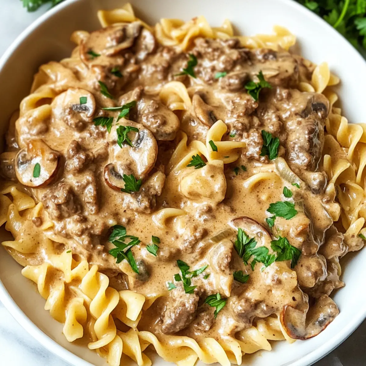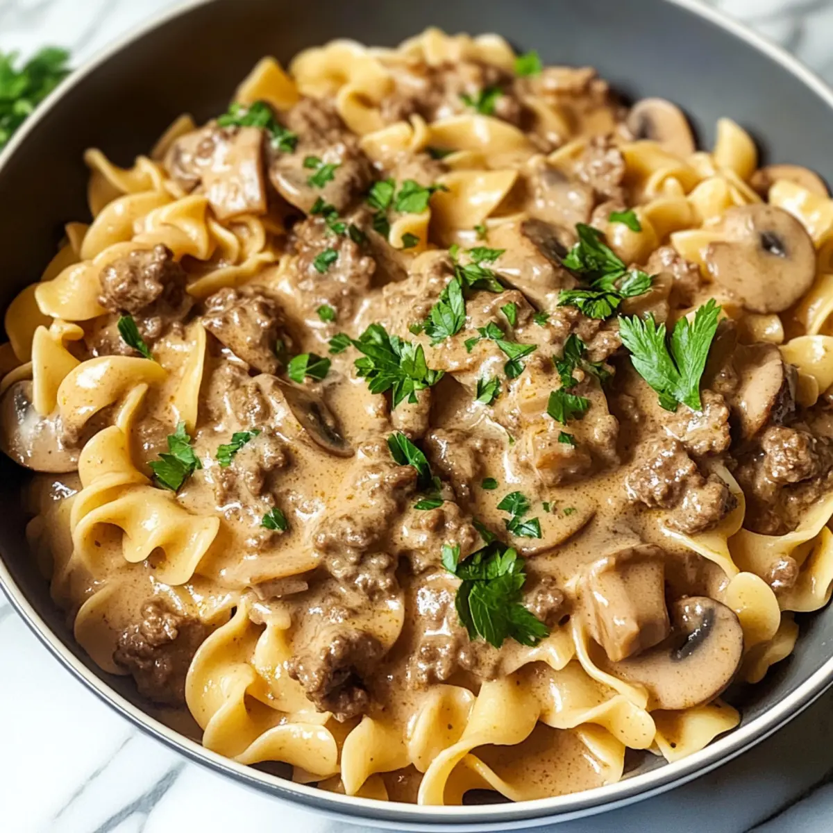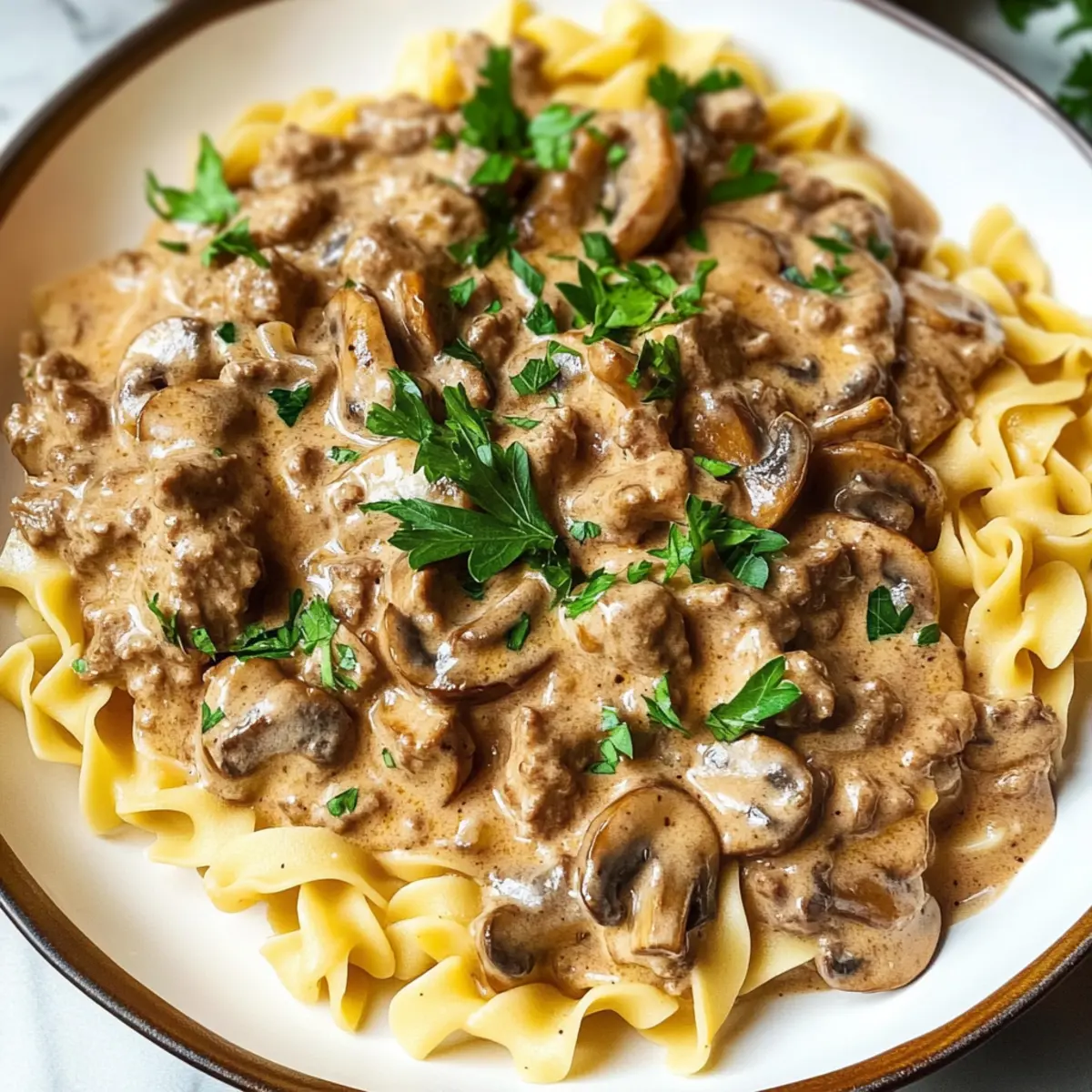 Die Woche neigt sich dem Ende zu und ich stehe in der Küche, als der köstliche Duft von frisch gebratenem Rindfleisch durch den Raum zieht. Mein One Pot Rindfleisch Stroganoff ist nicht nur ein Familienliebling, sondern auch das perfekte Beispiel für unkomplizierte Hausmannskost. Jeder Biss vereint saftiges Rindfleisch, zarte Champignons und eine cremige Sauce, die die Nudeln perfekt umhüllt. Das Beste daran? Diese Rezept erfordert nur einen Topf und bietet in kürzester Zeit eine geschmackvolle Mahlzeit – ideal für stressige Wochentage. Ob mit einer pflanzlichen Alternative oder verschiedenen Gemüsesorten, dieses Gericht lässt sich an jeden Geschmack anpassen. Kannst du dir vorstellen, wie einfach es ist, eine so leckere Mahlzeit zu zaubern, die die ganze Familie erfreut? Lass uns gemeinsam in die Zubereitung eintauchen! Warum wirst du dieses Rezept lieben? Einfachheit für jeden Koch: Mit minimalem Aufwand und nur einem Topf kannst du dieses köstliche Gericht zubereiten. Vielseitige Variationen: Ob mit Rindfleisch, Hühnchen oder sogar einer vegetarischen Option – du hast die Freiheit, das Rezept nach deinem Geschmack anzupassen. Familienfreundlich: Dieses Rindfleisch Stroganoff ist nicht nur schmackhaft, sondern auch budgetfreundlich und für alle Altersgruppen geeignet. Zeitsparend: Ideal für hektische Wochentage, da es schnell zubereitet ist und nur wenig Abwasch benötigt wird. Sinnlicher Genuss: Die harmonische Kombination aus zartem Fleisch, frischen Champignons und einer cremigen Sauce bietet ein Geschmackserlebnis, das du nicht verpassen möchtest. Entdecke auch, wie du dieses Rezept mit glasierten Karotten oder einem italienischen Salat kombinieren kannst, um deine Mahlzeit zu vervollständigen! Rindfleisch Stroganoff Zutaten Für die Sauce • Ungesalzene Butter – Verleiht Reichtum und hilft beim Anbraten der Aromen. • Cremini-Champignons – Sorgen für Umami und Textur; frisch sind sie am besten. • Süße Zwiebel – Fügt Süße und Balance hinzu; kann durch gelbe Zwiebel ersetzt werden. • Koscheres Salz & schwarzer Pfeffer – Wichtig für die Würze; nach Geschmack anpassen. • Mageres Rinderhackfleisch – Die Hauptquelle für Protein; kann durch Hähnchen, Pute oder pflanzliche Optionen ersetzt werden. • Knoblauch – Verstärkt den Geschmack; frisch empfohlen. • Getrockneter Thymian – Gibt eine erdige Note; frischer Thymian kann ebenfalls verwendet werden. • Allzweckmehl – Verdickt die Sauce; für eine glutenfreie Option, denke an Maisstärke. • Trockener Weißwein – Fügt Säure und Tiefe hinzu; mit zusätzlichem Rinderfond für alkoholfreie Version ersetzen. • Rinderfond – Die Basis der Sauce; ungesalzen oder natriumarme Varianten verbessern die Geschmackskontrolle. • Worcestershiresauce – Führt komplexe Aromen ein; die Menge anpassen oder mit Sojasauce ersetzen. • Dijon-Senf – Fügt Würze und Tiefe hinzu. • Eiernudeln – Kochen in der Sauce zur Geschmacksaufnahme; nach Belieben durch andere Pasta ersetzen. • Sauerrahm – Verleiht Cremigkeit; griechischen Joghurt für eine leichtere Variante verwenden. • Frisch gehackte Petersilie – Als Garnitur; fügt Frische und Farbe hinzu. Das Rindfleisch Stroganoff wird schnell zum Höhepunkt deiner Familienessen und bringt Freude auf den Tisch! Schritt-für-Schritt-Anleitung für Rindfleisch Stroganoff Step 1: Butter und Gemüse anbraten Erhitze in einer großen Pfanne bei mittlerer Hitze die ungesalzene Butter, bis sie schäumt. Füge die Cremini-Champignons und die süße Zwiebel hinzu und brate sie für 3-5 Minuten, bis sie goldbraun und weich sind. Würze mit koscherem Salz und schwarzem Pfeffer, um die Aromen zu intensivieren. Step 2: Rinderhackfleisch anbraten Gib nun das mageres Rinderhackfleisch in die Pfanne und brate es unter ständigem Zerkleinern für etwa 3-5 Minuten, bis es vollständig braun ist. Achte darauf, dass das Fleisch gleichmäßig gegart wird, damit es saftig bleibt. Step 3: Knoblauch und Thymian hinzufügen Füge den gehackten Knoblauch und den getrockneten Thymian hinzu und koche alles für ungefähr 1 Minute, bis die Gewürze aromatisch werden. Diese Schritte verleihen dem Rindfleisch Stroganoff eine köstliche Basis an Geschmack und Aromatik. Step 4: Mehl einrühren Streue das Allzweckmehl gleichmäßig über die Mischung und rühre es ein, bis es leicht bräunlich wird, was etwa 1 Minute dauert. Dies wird dazu beitragen, die Sauce später zu verdicken und eine tolle Textur zu erzeugen, die perfekt zu den Nudeln passt. Step 5: Wein hinzufügen Gieße den trockenen Weißwein in die Pfanne und kratze den Boden ab, um die köstlichen Röststoffe einzufangen. Lass den Wein 1-2 Minuten köcheln, bis er leicht eingekocht ist und einen tiefen, herzhaften Geschmack ins Gericht bringt. Step 6: Brühe und Nudeln hinzufügen Füge jetzt den Rinderfond, die Worcestershiresauce, den Dijon-Senf und die Eiernudeln hinzu. Geschmacklich mit Salz und Pfeffer abschmecken, dann bringe die Mischung zum Kochen. Achte darauf, alles gut zu vermengen, damit die Nudeln die Sauce optimal aufnehmen. Step 7: Köcheln lassen Decke die Pfanne ab und reduziere die Hitze. Lasse alles für 9-10 Minuten köcheln, bis die Nudeln al dente und gut durchgezogen sind. Rühre gelegentlich um, um ein Anbrennen zu verhindern und die gleichmäßige Garung zu gewährleisten. Step 8: Sauerrahm einrühren Rühre zum Schluss den Sauerrahm unter die Mischung, bis alles gut verbunden ist und die Sauce schön cremig wird. Dies sollte etwa 1-2 Minuten dauern. Achte darauf, dass die Hitze nicht zu hoch ist, damit der Sauerrahm nicht gerinnt. Step 9: Anrichten und servieren Serviere das Rindfleisch Stroganoff sofort und garniere es nach Belieben mit frisch gehackter Petersilie. Die Kombination aus dem cremigen Stroganoff und der frischen Petersilie sorgt für einen ansprechenden Look und ein ganz besonderes Geschmackserlebnis. Lagerungstipps für Rindfleisch Stroganoff Zimmertemperatur: Rindf