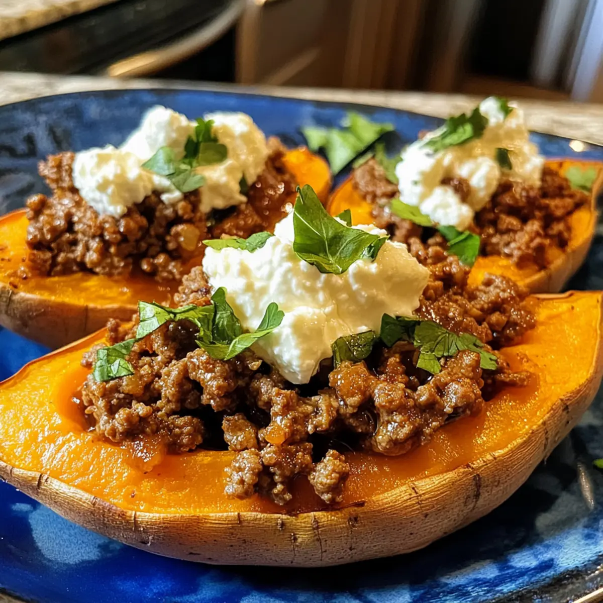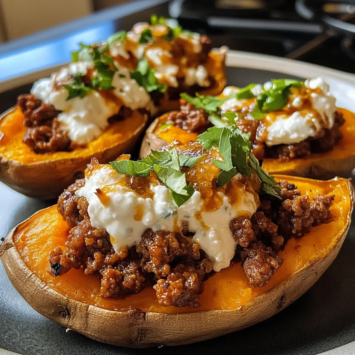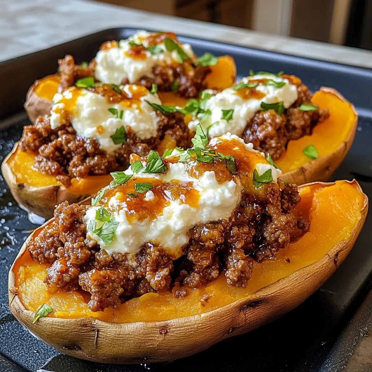 Der köstliche Duft von frisch gebackenen Süßkartoffeln und würzigem Rindfleisch erfüllt die Küche und zaubert ein Lächeln auf mein Gesicht. Wenn ich diese Scharfe Honig-Rindfleisch- und Süßkartoffel-Boote zubereite, fühle ich mich, als ob ich eine kleine kulinarische Reise unternehme, ohne mein Zuhause zu verlassen. Diese glutenfreie und einfach zuzubereitende Mahlzeit ist perfekt für hektische Wochentage, wenn die Zeit drängt, aber ich dennoch etwas Heißes und Herzhaftes auf den Tisch bringen möchte. Die Kombination aus zartem, würzigem Rindfleisch, cremigem Cottage Cheese und der süßen Schärfe des Honig macht jeden Bissen zu einem kleinen Fest der Aromen. Ich kann es kaum erwarten, mit euch zu teilen, wie diese köstlichen Boote so schnell zubereitet werden können. Wer ist bereit für ein Dinner, das nicht nur den Bauch, sondern auch die Seele wärmt? Warum sind diese Boots so besonders? Kulinarische Reise: Mit jedem Bissen fühlst du den warmen, reichhaltigen Geschmack, der Erinnerungen an gemütliche Abende weckt. Einfachheit: Diese robusten Boote benötigen nur grundlegende Kochfähigkeiten und sind damit perfekt für jeden! Vielfalt: Du kannst das Rezept anpassen, indem du z.B. mageres Putenfleisch verwendest oder sogar pflanzliche Alternativen ausprobierst. Woche für Woche: Diese glutenfreie Mahlzeit ist schnell zubereitet und ideal für stressige Wochentage, da du die Süßkartoffeln und das Rindfleisch im Voraus vorbereiten kannst. Zusatz-Tipps: Probiere einfach, frische Kräuter wie Koriander im Cottage Cheese zu mischen für das gewisse Extra! Scharfe Honig-Rindfleisch- und Süßkartoffel-Boote Zutaten • Hinweis: Um die zarten Scharfen Honig-Rindfleisch- und Süßkartoffel-Boote perfekt hinzubekommen, ist es wichtig, die richtigen Zutaten auszuwählen. Für die Boote Süßkartoffeln – Sie sind die Hauptbasis für die Boote und sorgen für eine cremige Textur, die jeder liebt. Tipp: Lass die Schale für zusätzlichen Biss und Nährstoffe dran! Rinderhackfleisch (oder Putenhack) – Liefert proteinreiche Substanz und herzhaften Geschmack; du kannst es auch durch mageres Putenfleisch ersetzen für eine leichtere Variante. Cottage Cheese – Fügt eine cremige und milde Säure hinzu; für eine Abwechslung kannst du auch Ricotta oder griechischen Joghurt verwenden. Für die Würze Scharfer Honig – Bringt eine süße Schärfe ins Spiel; wenn du keinen hast, mische normalen Honig mit Chili-Flocken für eine schnelle hausgemachte Variante. Salz und Gewürze (geräuchertes Paprikapulver/Chilipulver) – Verstärken den Geschmack des Rindfleischs; Salz hebt das gesamte Aroma. Für die Garnitur Avocado – Fügt eine köstliche Cremigkeit hinzu; frische Avocado ergänzt die Schärfe des Honigs wunderbar. Bereit für ein einzigartiges Geschmackserlebnis? Lass uns die Zutaten holen und diese köstlichen Boote zubereiten! Schritt-für-Schritt-Anleitung für Scharfe Honig-Rindfleisch- und Süßkartoffel-Boote Step 1: Ofen vorheizen Heize deinen Ofen auf 200 °C vor. Dies ist der perfekte Start für die Scharfen Honig-Rindfleisch- und Süßkartoffel-Boote, da du dann die Süßkartoffeln optimal backen kannst. Während der Ofen aufheizt, kannst du die Süßkartoffeln gründlich waschen und vorbereiten. Step 2: Süßkartoffeln backen Lege die gewaschenen Süßkartoffeln auf ein Backblech und backe sie 40-50 Minuten lang im vorgeheizten Ofen, bis sie weich sind und ein leichtes Plätschern hören kannst, wenn du darauf drückst. Alternativ kannst du sie auch für 8-10 Minuten in die Mikrowelle legen, wenn du es eilig hast. Step 3: Rindfleisch anbraten Während die Süßkartoffeln backen, erhitze eine große Pfanne bei mittlerer Hitze. Gib das Rinderhackfleisch mit einer Prise Salz und den Gewürzen (wie geräuchertem Paprika oder Chilipulver) hinzu. Brate das Fleisch etwa 6-8 Minuten lang, bis es nicht mehr rosa ist und leicht knusprig aussieht. Step 4: Süßkartoffeln vorbereiten Nimm die gebackenen Süßkartoffeln aus dem Ofen und lasse sie kurz abkühlen. Halbiere jede Süßkartoffel der Länge nach und fülle das Innere vorsichtig mit einer Gabel auf. Würze die aufgeschüttelten Süßkartoffeln mit einer Prise Salz und Pfeffer für zusätzlichen Geschmack. Step 5: Boote zusammenstellen Fülle jede Süßkartoffelhälfte großzügig mit dem angebratenen Rindfleisch. Löffle dann etwas Cottage Cheese darauf und ergänze das Ganze mit frischen Avocadoscheiben. Zu guter Letzt träufelst du einige Löffel scharfen Honig über die Boote und sorgst so für die perfekte süß-würzige Note. Aufbewahrungstipps für Scharfe Honig-Rindfleisch- und Süßkartoffel-Boote Raumtemperatur: Lasse die Scharfen Honig-Rindfleisch- und Süßkartoffel-Boote nicht länger als 2 Stunden bei Raumtemperatur stehen, um die Lebensmittelsicherheit zu gewährleisten. Kühlschrank: Bewahre die Reste in einem luftdichten Behälter im Kühlschrank auf, wo sie bis zu 3 Tage frisch bleiben. Gefrierfach: Diese Boote können auch eingefroren werden! Wickel sie in Frischhaltefolie und dann in Alufolie. Im Gefrierfach bleiben sie bis zu 2 Monate haltbar. Wiedererhitzen: Um die Boote wieder zu genießen, erwärmst du sie im Ofen bei 180 °C für etwa 15-20 Minuten, bis sie durchgehend heiß sind. Was passt gut zu Scharfen Honig-Rindfleisch- und Süßkartoffel-Boote? Genieße ein vollständiges und ausgeglichenes Erlebnis, wenn du diese herzhaften Boote servierst, die im Handumdrehen zubereitet sind. Frischer grüner Salat: Ein knackiger Salat mit Rucola und einem spritzigen Dressing bietet eine erfrischende Balance zu den herzhaften Boote. Geröstetes Gemüse: Saisonales Gemüse wie Karotten oder Zucchini bringt zusätzliches Aroma und Textur, während es gleichzeitig die Süße der Süßkartoffeln ergänzt. Knoblauchbrot: Die Kombination aus knusprigem Knoblauchbrot und deinen Boots sorgt für einen köstlichen, herzhaften Kontrast, der jeden Bissen noch besser macht. Cremiger Joghurt-Dip: Ein einfacher J