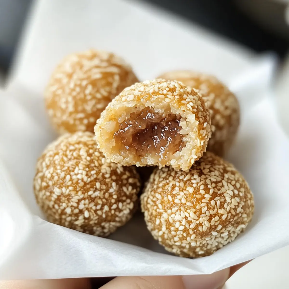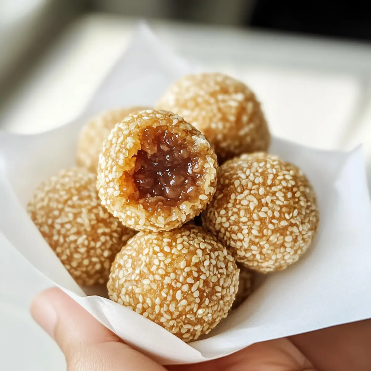 Irgendwo beim Stöbern in einer kleinen asiatischen Küche entdeckte ich die Magie der Sesamkugeln. Diese kleinen, goldbraunen Wunder sind nicht nur ein Fest für die Augen, sondern auch ein Genuss für den Gaumen! Mit ihrem knackigen Äußeren und dem süßen roten Bohnenfüllung sorgen sie für eine wahrhaft unwiderstehliche Kombination. In meinem Rezept für “Crispy Fried Sesame Balls with Sweet Red Bean Filling” zeige ich dir, wie du in weniger als zwei Stunden dieses traditionelle asiatische Dessert selbst zubereiten kannst. Egal, ob für besondere Anlässe wie das chinesische Neujahr oder einfach so – diese Sesamkugeln sind ein Hit, die schnell zubereitet werden können und deine Gäste garantiert begeistern werden. Bist du bereit, einen Hauch von Abenteuer in deiner Küche zu erleben? Warum sind Sesamkugeln so beliebt? Unvergleichlicher Genuss: Diese Sesamkugeln bieten ein aufregendes Geschmackserlebnis mit ihrem knackigen Äußeren und der süßen roten Bohnenfüllung. Einfache Zubereitung: Mit nur fünf Zutaten und weniger als zwei Stunden kannst du diese Delikatesse zaubern. Vielseitigkeit: Experimentiere mit verschiedenen Füllungen wie Lotus- oder Kürbispaste, um Abwechslung zu schaffen. Kulturelle Bedeutung: Perfekt für Feiern wie das chinesische Neujahr, symbolisieren sie Glück und Fülle. Beeindruckender Crowd-Pleaser: Du wirst feststellen, dass deine Gäste nicht genug von diesen köstlichen Snacks bekommen können, die sich wunderbar als Begleitung zu einer Tasse Tee eignen! Sesamkugeln Zutaten • Entdecke die einfachen Zutaten für köstliche Sesamkugeln! Glutinous Rice Flour – Sorgt für die einzigartige, chewy Textur der Kugeln; unbedingt kein normales Mehl verwenden. Hot Water – Aktiviert das Mehl und macht den Teig geschmeidig; achte darauf, dass das Wasser heiß genug ist, um den Zucker aufzulösen. Sugar – Verleiht dem Teig Süße; kann je nach Geschmack angepasst oder durch Honig ersetzt werden. Red Bean Paste – Dient als süße Füllung und gibt den Sesamkugeln ihren besonderen Geschmack; alternative Füllungen sind z.B. Lotus- oder Kürbispaste. White Sesame Seeds – Bieten eine aromatische, nussige Beschichtung, die den Geschmack und die Textur erweitert; geröstete Sesamsamen erhöhen das Aroma zusätzlich. Schritt-für-Schritt-Anleitung für Sesamkugeln mit süßer roter Bohnenfüllung Step 1: Heißes Wasser vorbereiten In einem kleinen Topf erhitze 200 ml Wasser bei mittlerer Hitze und füge 50 g Zucker hinzu, bis er vollständig aufgelöst ist. Achte darauf, dass das Wasser heiß ist, aber nicht kocht. Sobald der Zucker aufgelöst ist, nimm den Topf vom Herd und lasse das Wasser leicht abkühlen. Step 2: Den Teig vorbereiten In einer großen Schüssel 250 g glutinöses Reis- oder Klebereismehl mit dem warmen Zuckergemisch vermengen. Knete den Teig mit sauberen Händen, bis er glatt und elastisch ist. Dies dauert etwa 5-7 Minuten. Decke den Teig mit einem feuchten Tuch ab und lasse ihn 30 Minuten ruhen, damit er sich setzen kann. Step 3: Formen und Füllen Teile den Teig nach der Ruhezeit in kleine Portionen von etwa 30 g. Forme jede Portion zu einer kleinen Scheibe, fülle die Mitte mit 1 Teelöffel roter Bohnenpaste und forme die Kugel, indem du die Ränder hochziehst und zusammendrückst. Rolle die gefüllten Kugeln sanft zwischen deinen Händen, um sie gleichmäßig zu gestalten. Step 4: Die Kugeln beschichten Befeuchte jede Kugel leicht mit etwas Wasser, damit die Sesamsamen besser haften. Rolle die Kugeln dann in einer Schüssel mit 100 g weißen Sesamsamen, bis sie vollständig damit bedeckt sind. Achte darauf, dass die Schicht gleichmäßig ist, damit sie beim Frittieren knusprig wird. Step 5: Frittieren Erhitze in einem Wok oder einer tiefen Pfanne etwa 500 ml Öl bei mittlerer Hitze auf 150°C (300°F). Frittiere die Sesamkugeln in kleinen Portionen, bis sie an die Oberfläche steigen, was etwa 5-7 Minuten dauert. Reduziere die Hitze, um die Kugeln gleichmäßig zu bräunen, und erhöhe die Temperatur auf 180°C (350°F), während du sie 5-8 Minuten länger frittierst, bis sie goldbraun sind. Step 6: Abkühlen lassen und servieren Nehme die Sesamkugeln mit einem Schaumlöffel aus dem Öl und lege sie auf ein Küchentuch, um überschüssiges Öl abtropfen zu lassen. Lass die Kugeln für einige Minuten abkühlen. Serviere sie warm als köstlichen Snack oder Dessert, perfekt für festliche Anlässe oder einfach zum Genießen. Meal Prep für Sesamkugeln (芝麻球) Sesamkugeln sind perfekte Snacks, die du im Voraus zubereiten kannst, um deinen Alltag zu erleichtern! Du kannst die vorbereiteten Kugeln bis zu 24 Stunden im Voraus formen und im Kühlschrank lagern, um die Frische zu bewahren. Um die Qualität zu erhalten, decke die Kugeln gut ab, damit sie nicht austrocknen. Wenn du sie frittieren möchtest, erhitze das Öl auf die richtige Temperatur und brate die Kugeln, bis sie goldbraun sind. Der brillante Vorteil: Gönne dir in nur weniger als 20 Minuten frisch frittierte Sesamkugeln, die einfach nur köstlich sind und garantiert jeden überzeugen werden! Aufbewahrungstipps für Sesamkugeln Raumtemperatur: Lass die Sesamkugeln nach dem Frittieren auf einem Gitterrost auskühlen, bevor du sie in einem luftdichten Behälter bei Raumtemperatur für bis zu 1 Tag aufbewahrst, um ihre Knusprigkeit zu bewahren. Kühlschrank: Wenn du die Sesamkugeln länger lagern möchtest, können sie im Kühlschrank für bis zu 3 Tage aufbewahrt werden. Stelle sicher, dass sie in einem luftdichten Behälter gelagert sind, um Feuchtigkeit zu vermeiden. Gefriertruhe: Um die Sesamkugeln einzufrieren, lege sie nach dem Frittieren auf ein Backblech, bis sie fest sind, und packe sie dann in einen gefriergeeigneten Behälter. Sie können bis zu 3 Monate lang im Gefrierschrank gelagert werden. Wiederaufwärmen: Erwärme gefrorene Sesamkugeln im Ofen bei 180°C für etwa 10-15 Minuten, bis sie wieder knusprig sind. Dies hilft, die Textur zu erneuern, die beim A