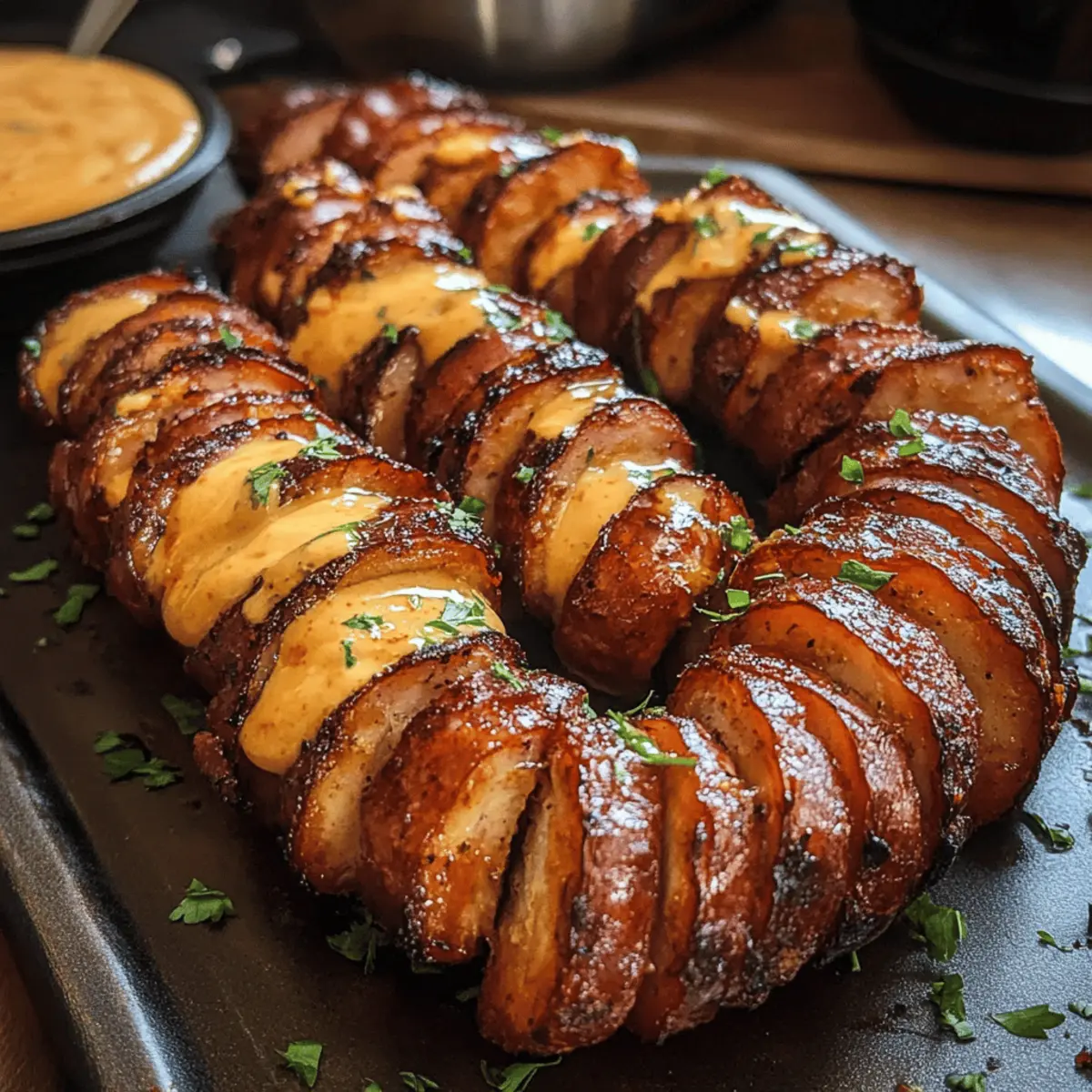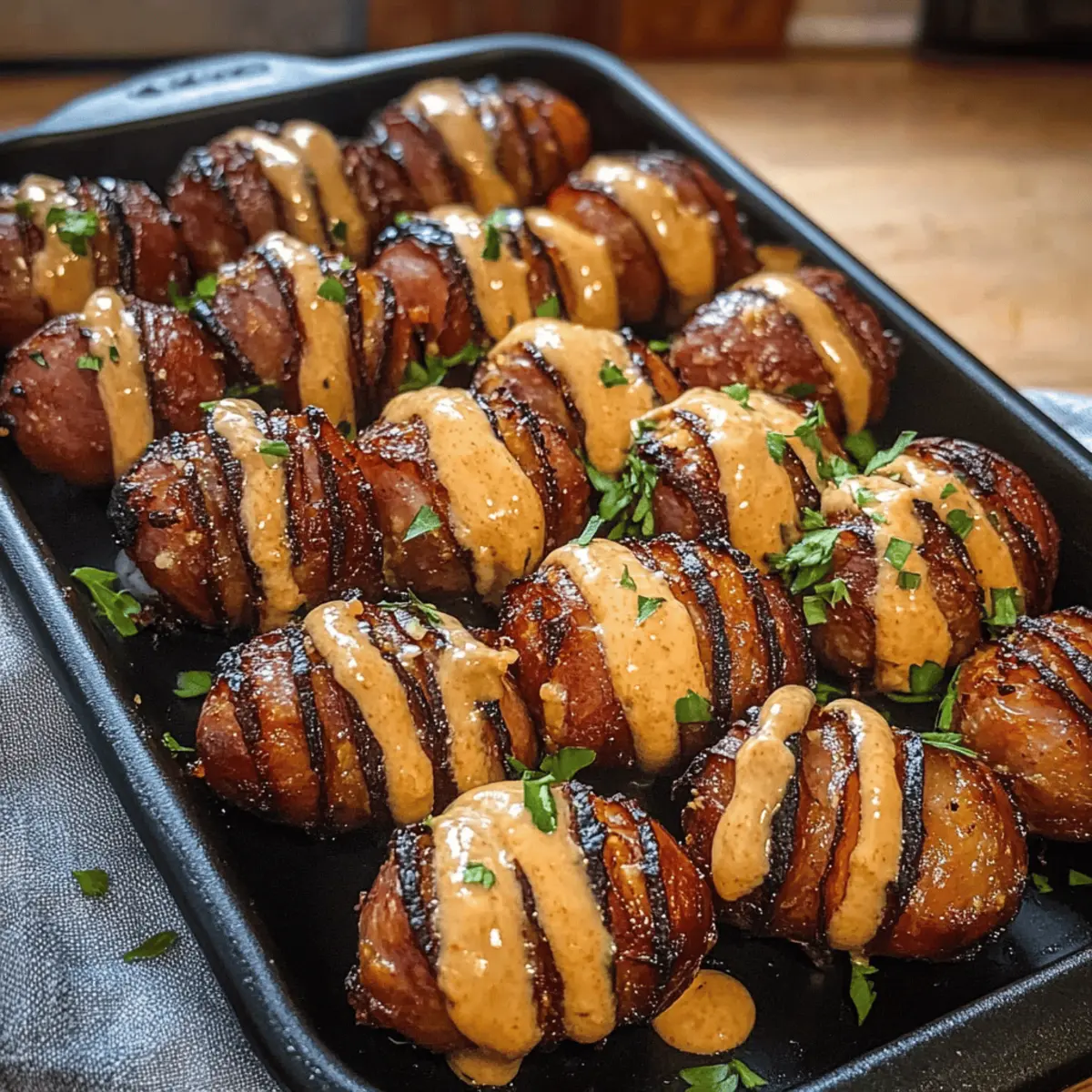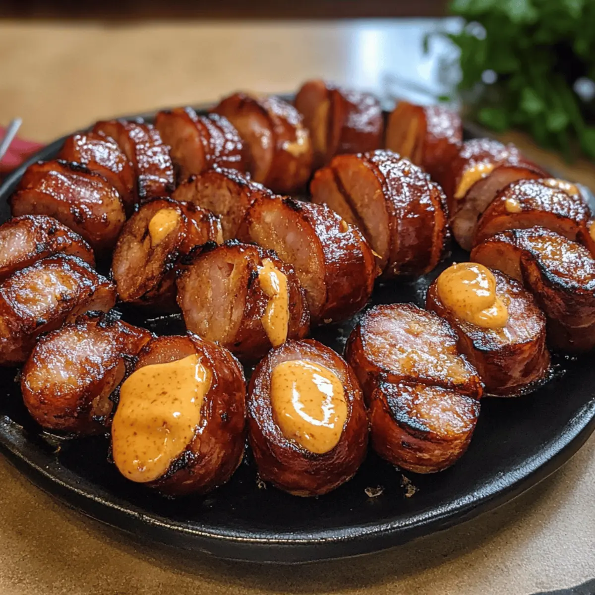 Beim Zubereiten zeigen meine Küchengeräte oft eine erstaunliche Kreativität. Diese Spicy Sriracha Hasselback Kielbasa Bites sind das perfekte Beispiel dafür – jedem Biss lächeln die Geschmäcker entgegen, während die würzige Note des Srirachas wunderbar mit dem herzhaften Kielbasa harmoniert. Diese Appetizer sind nicht nur schnell zubereitet und einfach anpassbar, sondern bringen auch jeden zu einem geselligen Anlass oder Game-Day in Hochstimmung. Egal, ob du es scharf oder mild magst, hier findet jeder seinen Favoriten. Bist du bereit, deine nächste Grillfeier oder das Abendessen zu einem wahren Genuss zu machen? Lass uns gleich das Rezept entdecken! Warum sind diese Bites so unwiderstehlich? Einzigartiger Geschmack: Die Kombination aus würzigem Sriracha und herzhaftem Kielbasa sorgt für eine Geschmacksexplosion. Einfache Zubereitung: Diese Bites sind schnell und unkompliziert gemacht – perfekt für lebhafte Zusammenkünfte. Anpassungsfähig: Variiere die Schärfe ganz nach deinem Geschmack und probiere Alternativen wie die Cremige Scharfe Rezept oder die Mustard Hasselback Kielbasa Bites. Crispy & Saftig: Dank der Luftfritteuse erhältst du eine köstlich knusprige Außenhülle bei gleichzeitiger Saftigkeit im Inneren. Beliebtheit: Diese Appetizer sind absolute Crowd-Pleaser und bringen Freude auf jede Feier! Spicy Sriracha Hasselback Kielbasa Bites Zutaten Für die Bites • Kielbasa – Hauptquelle für Protein, die für einen herzhaften Geschmack sorgt. Hinweis: Verwende jede bevorzugte Wurst für Variationen. • Mayonnaise – Cremige Basis für die Sauce, die Reichtum hinzufügt. Ersatz: Griechischer Joghurt für eine gesündere Option. • Sriracha – Sorgt fürHitze und Tiefe im Gericht. Hinweis: Menge anpassen je nach gewünschtem Schärfegrad; kann durch eine mildere Sauce ersetzt werden. • Limettensaft – Fügt Säure hinzu, um die Cremigkeit der Mayo auszugleichen und den Geschmack zu verstärken. Hinweis: Frisch gepresst wird für den besten Geschmack empfohlen. Für die optionalen Garnituren • Petersilie – Frischer Kräuterakzent, der die Bites aufwertet. Hinweis: Immer frisch hacken für das beste Aroma. Step-by-Step Instructions für Spicy Sriracha Hasselback Kielbasa Bites Step 1: Heize die Luftfritteuse vor Heize die Luftfritteuse auf 200 °C (400 °F) vor, während du die Vorbereitungen für die Spicy Sriracha Hasselback Kielbasa Bites triffst. Dies stellt sicher, dass die Bites von Beginn an gut bräunen. Der Vorheizprozess dauert etwa 5 Minuten. Step 2: Schneide die Kielbasa Schneide die Kielbasa in 0,5 cm dicke Scheiben, achte darauf, nur bis zur Hälfte zu schneiden, damit sie zusammenhält. Ein Trick ist, zwei Essstäbchen an die Seiten der Wurst zu legen, um den Schnitt zu stoppen. Dies sorgt für eine perfekte Hasselback-Form und ermöglicht viel Platz für die Sauce. Step 3: Teile die Kielbasa Nachdem du die Scheiben geschnitten hast, teile die Kielbasa in 2,5 cm große Stücke. Dies macht es einfacher, die Bites zu kombinieren und zum Servieren bereit zu machen. Achte darauf, dass die Stücke gleichmäßig sind, damit sie während des Kochens gleichmäßig garen. Step 4: Bereite die Sauce vor Vermische in einer kleinen Schüssel die Mayonnaise, Sriracha und Limettensaft gründlich. Diese Mischung wird das Herzstück der Spicy Sriracha Hasselback Kielbasa Bites sein, also stelle sicher, dass alles gut integriert ist. Die Farbe sollte eine einladende Rosatönung annehmen. Step 5: Bestreiche die Kielbasa Verwende einen Pinsel, um die Hälfte der scharfen Mayonnaise-Mischung gleichmäßig über die Kielbasa-Stücke zu streichen. Achte darauf, dass die Sauce auch in die Schnitte gelangt, um die Aromen zu intensivieren. Dies sorgt für einen leckeren, würzigen Geschmack in jedem Biss. Step 6: Lege die Bites in die Luftfritteuse Platziere die Kielbasa-Bites in einem einzelnen Schicht im Korb der Luftfritteuse. Achte darauf, dass sie sich nicht überlappen, damit die Luft gut zirkulieren kann. Wenn nötig, koche sie in mehreren Chargen, um ein gleichmäßiges Ergebnis zu gewährleisten. Step 7: Frittieren Lass die Kielbasa-Bites für 7 bis 9 Minuten in der Luftfritteuse braten, bis sie goldbraun und knusprig sind. Schüttle den Korb nach der Hälfte der Zeit, um sicherzustellen, dass alle Seiten gleichmäßig gegart werden. Die visuelle Cue ist eine schön gebräunte Oberfläche. Step 8: Garnieren und Servieren Optional kannst du die fertig gegarten Bites mit der restlichen Mayo-Sauce bestreichen und nach Belieben mit frischer Petersilie garnieren. Dies fügt nicht nur Geschmack hinzu, sondern auch eine schöne Farbkomponente. Serviere die Spicy Sriracha Hasselback Kielbasa Bites heiß und genieße sie mit deinen Lieblingsbeilagen! Was passt zu Spicy Sriracha Hasselback Kielbasa Bites? Diese köstlichen Häppchen sind einfach unwiderstehlich und lassen sich wunderbar mit verschiedenen Beilagen kombinieren, um ein vollständiges und befriedigendes Essen zu kreieren. Cremige Coleslaw: Der knackige Salat ergänzt die pikanten Bites perfekt und bietet eine erfrischende Balance. Seine Cremigkeit harmoniert wunderbar mit der Schärfe. Käse-Makkaroni: Ein klassisches Comfort-Food, das mit seinem cremigen Käsegeschmack ideal zu den scharfen Bites passt und alle glücklich macht. Die Kombination aus diesen Beilagen sorgt für ein harmonisches Geschmackserlebnis und ein festliches Ambiente bei jedem Anlass. So wird jede Mahlzeit unvergesslich! Ofengemüse: Geröstetes Gemüse bringt eine angenehme Süße und Textur ins Spiel. Der leichte Grillgeschmack verstärkt die Aromen der Kielbasa. Knusprige Kartoffelspalten: Diese herzhaften Spalten sind nicht nur sättigend, sondern bieten auch eine großartige Textur, die die Saftigkeit der Bites ergänzt. Erfrischendes Bier: Ein kühles, erfrischendes Bier kann die Schärfe der Bites wunderbar ergänzen. Eine leichte, hopfige Note schmeichelt dem Gaumen. Fruchtiger Dessertsalat: Ein süßer Dessertsalat rund