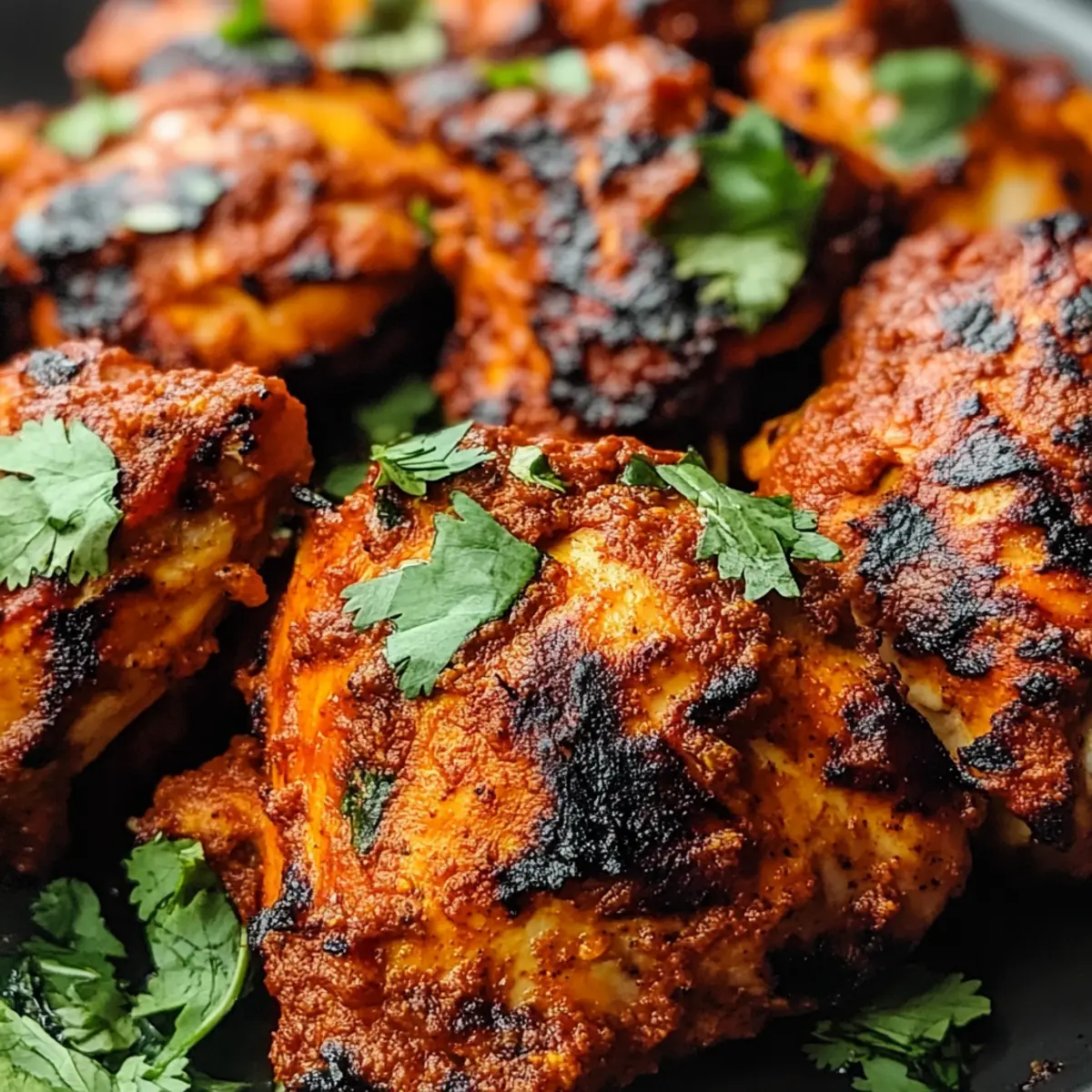 Grille das Tandoori-Hühnchen 15–20 Minuten, bis die Oberfläche leicht verkohlt ist und die Ränder knackig werden. Wende die Hähnchenteile vorsichtig mit der Zange und grille sie für weitere 10 Minuten, sodass sie sicher durchgegart sind und eine Innentemperatur von 74 °C erreichen. Achte darauf, das Hähnchen regelmäßig im Auge zu behalten, um ein Überkochen zu vermeiden.