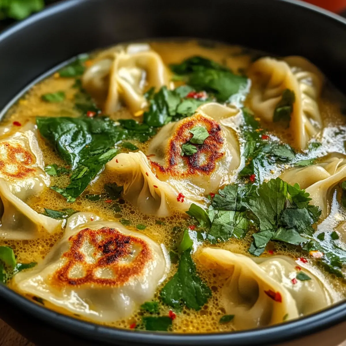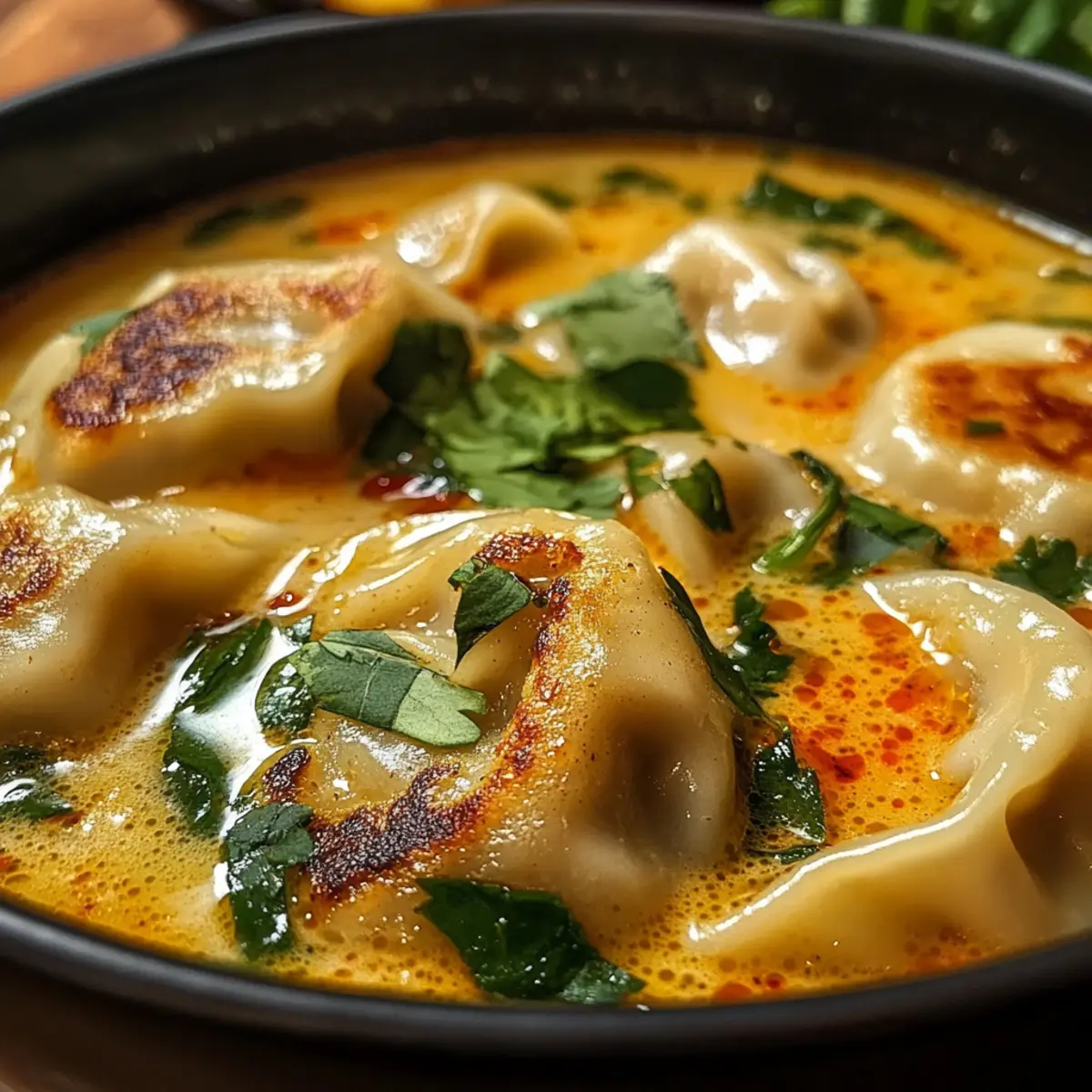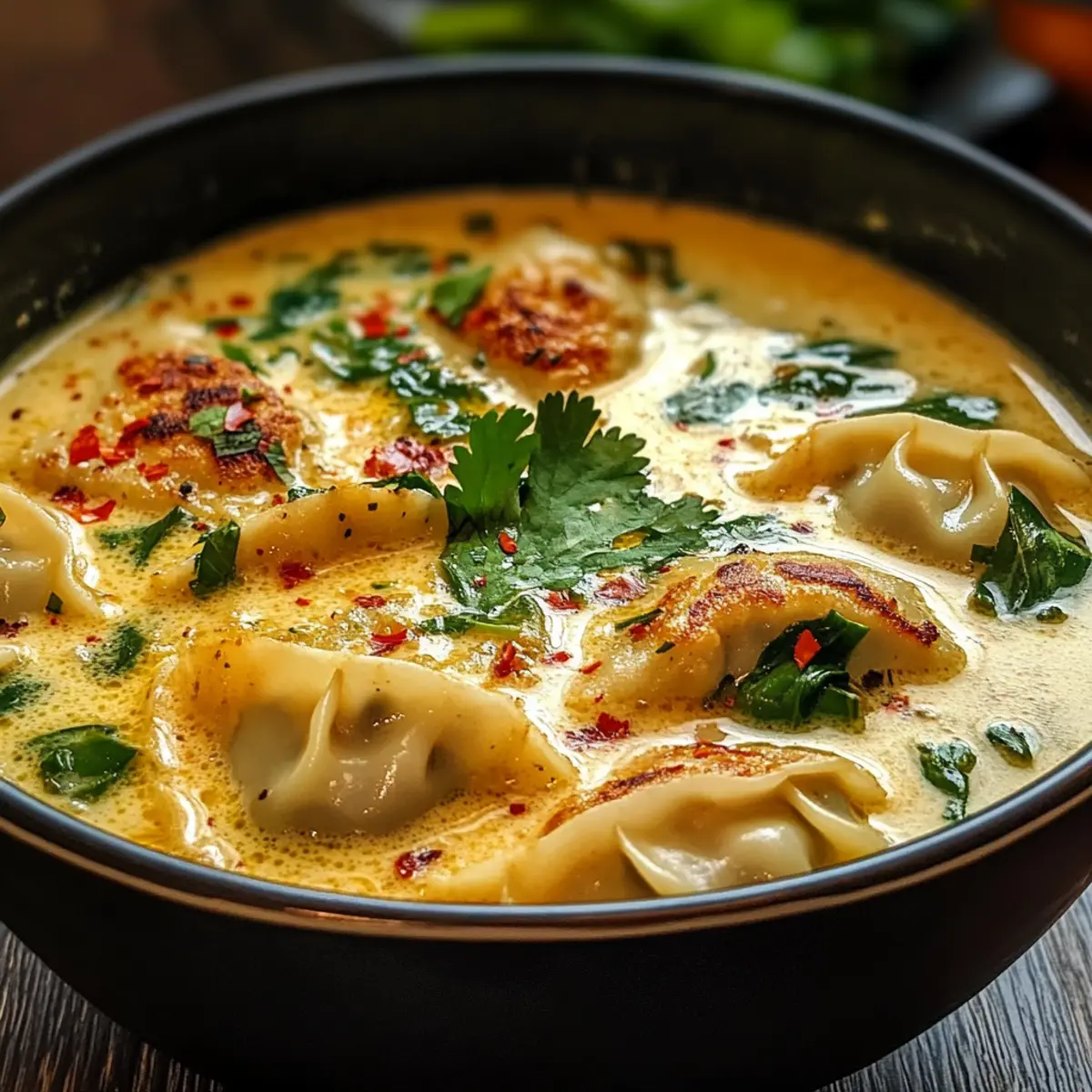„Kann ich das Bild bitte ein wenig schärfer machen?“ hörte ich meinen Freund rufen, während er sich über die dampfende Schüssel voller Thai-Teigtaschen-Kokosnuss-Suppe beugte. Ich musste lächeln, denn ich wusste, dass dieses Gericht nicht nur die Sinne begeistert, sondern auch das Herz wärmt. Die Kombination aus zarten Teigtaschen in einer reichhaltigen Kokosmilchbrühe, aromatisiert mit Rotcurry-Paste, ist einfach unwiderstehlich. Diese Suppe ist ein absoluter Geheimtipp für alle, die auf der Suche nach einem schnellen, gesunden und gleichzeitig tröstenden Abendessen sind. Egal, ob mit einer vegetarischen Variante oder traditionell mit Fleisch gefüllt – jeder Löffel bringt dich an einen Ort, an dem sich die Aromen intensiv vereinen. Bist du bereit, diese köstliche Umarmung aus der Schüssel zu erleben? Lass uns die Töpfe anwerfen! Warum ist diese Suppe so besonders? Einzigartiger Geschmack: Die Kombination aus süßlicher Kokosmilch und würziger Rotcurry-Paste sorgt für eine Geschmacksexplosion in jedem Löffel. Vielfältige Variationen: Egal, ob du Fleischliebhaber bist oder vegetarische Optionen bevorzugst, du kannst die Zutaten nach deinem Geschmack anpassen. Einfache Zubereitung: Mit nur wenigen Zutaten und schnellen Schritten bereitet sich diese köstliche Suppe in nur 30 Minuten zu – perfekt für hektische Abende! Komfortfood pur: Diese Thai-Teigtaschen-Kokosnuss-Suppe ist nicht nur sättigend, sondern auch unglaublich tröstend, ideal für kühle Abende. Und wenn du noch mehr Inspiration suchst, schau dir unsere Rezepte für Vegetarische Suppen an! Thai-Teigtaschen-Kokosnuss-Suppe Zutaten Hinweis: Diese Zutatenliste bietet alles, was du brauchst, um die köstliche Thai-Teigtaschen-Kokosnuss-Suppe zuzubereiten. Für die Brühe Olivenöl – Ideal zum Anbraten von Gemüse; benutze Kokosöl für noch mehr Aroma. Knoblauch (2 Zehen, gehackt) – Verleiht der Suppe eine aromatische Tiefe. Zwiebel (1 mittelgroße, gewürfelt) – Bildet die Grundlage für die Brühe. Rote Paprika (1, gewürfelt) – Sorgt für Süße und einen schönen Crunch. Süßkartoffel (1 mittelgroße, gewürfelt) – Fügt Cremigkeit und natürliche Süße hinzu; ersetze sie durch Kürbis, wenn gewünscht. Rote Curry-Paste (2 Esslöffel) – Essenzieller Geschmacksträger; die Schärfe kann nach Belieben angepasst werden. Ungesüßte Kokosmilch (1 Dose, 400 ml) – Gibt der Brühe eine cremige Textur und ist die Basis des Geschmacks. Gemüsebrühe (4 Tassen) – Bringt zusätzliche Tiefe in die Suppe; verwende Hühnerbrühe, wenn du nicht vegetarisch kochen möchtest. Für die Teigtaschen Teigtaschen (1 Packung, 370 g) – Hauptbestandteil; es können sowohl vegetarische als auch fleischgefüllte Varianten verwendet werden. Für die Garnitur Frischer Spinat (2 große Tassen) – Für Farbe und Nährstoffe; du kannst ihn gegen Babygrün eintauschen. Limettensaft (von 1 Limette) – Bringt die Aromen der Brühe zum Strahlen. Frischer Koriander (zum Garnieren) – Fügt ein frisches Aroma hinzu. Entdecke die Aromen dieser Thai-Teigtaschen-Kokosnuss-Suppe und lass sie deine Küche erhellen! Schritt-für-Schritt-Anleitung für die Thai-Teigtaschen-Kokosnuss-Suppe Step 1: Gemüse anbraten Erhitze in einem großen Topf bei mittlerer bis hoher Temperatur das Olivenöl. Füge den gehackten Knoblauch, die gewürfelte Zwiebel, die rote Paprika und die gewürfelte Süßkartoffel hinzu. Sauté die Mischung für 3-4 Minuten, bis das Gemüse weich ist und die Zwiebel transparent wird, um die Aromen zu entfalten. Step 2: Curry-Paste hinzufügen Rühre die rote Curry-Paste in das angebratene Gemüse ein und lasse sie für 1 Minute kochen, bis sie aromatisch wird. Dies intensiviert die Geschmacksbasis deiner Thai-Teigtaschen-Kokosnuss-Suppe und verleiht ihr eine warme, einladende Note. Step 3: Brühe vorbereiten Gieße die ungesüßte Kokosmilch und die Gemüsebrühe in den Topf. Rühre kräftig um, um sicherzustellen, dass sich alle Zutaten gut vermischen. Lass die Suppe aufkochen, bis sie leicht blubbert, was etwa 2-3 Minuten dauert; dies sorgt für eine reichhaltige und cremige Basis. Step 4: Teigtaschen hinzufügen Sobald die Brühe kocht, füge die Teigtaschen hinzu. Reduziere die Hitze auf ein mittleres Niveau und lasse die Suppe 6-8 Minuten köcheln, bis die Teigtaschen durchgeheizt sind und die Brühe leicht eindickt. Achte darauf, dass die Teigtaschen nicht zerfallen. Step 5: Spinat und Limettensaft integrieren Jetzt ist es Zeit, den frischen Spinat und den Limettensaft in die Suppe zu geben. Rühre alles gut um und koche die Mischung für weitere 1-2 Minuten, bis der Spinat verwelkt und die Farben lebendig sind. Dies gibt deiner Thai-Teigtaschen-Kokosnuss-Suppe zusätzlichen Nährstoffgehalt und eine erfrischende Note. Step 6: Servieren und garnieren Nehme die Suppe vom Herd und serviere sie sofort in Schalen. Garniere jedes Gericht mit frischem Koriander, um ein belebendes Aroma hinzuzufügen. Diese köstliche, warme Thai-Teigtaschen-Kokosnuss-Suppe ist der perfekte Genuss für einen gemütlichen Abend! Tipps für die beste Thai-Teigtaschen-Kokosnuss-Suppe Kulinarische Vielfalt: Achte darauf, die Teigtaschen gut auszuwählen. Nutze glutenfreie Thai-Teigtaschen für eine verträgliche Option und genieße den vollen Geschmack. Aromatischer Twist: Für zusätzlichen Geschmack kannst du frische Kräuter wie Thai-Basilikum oder Minze hinzufügen, die regelmäßig in der thailändischen Küche verwendet werden. Cremiger Genuss: Um eine besonders cremige Konsistenz zu erreichen, stelle sicher, dass du die Kokosmilch gut in die Brühe einrührst, damit sie gleichmäßig integriert wird. Gemüsevariationen: Nutze saisonales Gemüse, das dir zur Verfügung steht. Alternativen wie Karotten oder Zucchini passen ebenfalls hervorragend in die Thai-Teigtaschen-Kokosnuss-Suppe. Reste richtig lagern: Lasse die Suppe vollständig abkühlen, bevor du sie in einem luftdichten Behälter im Kühlschrank aufbewahrst, u