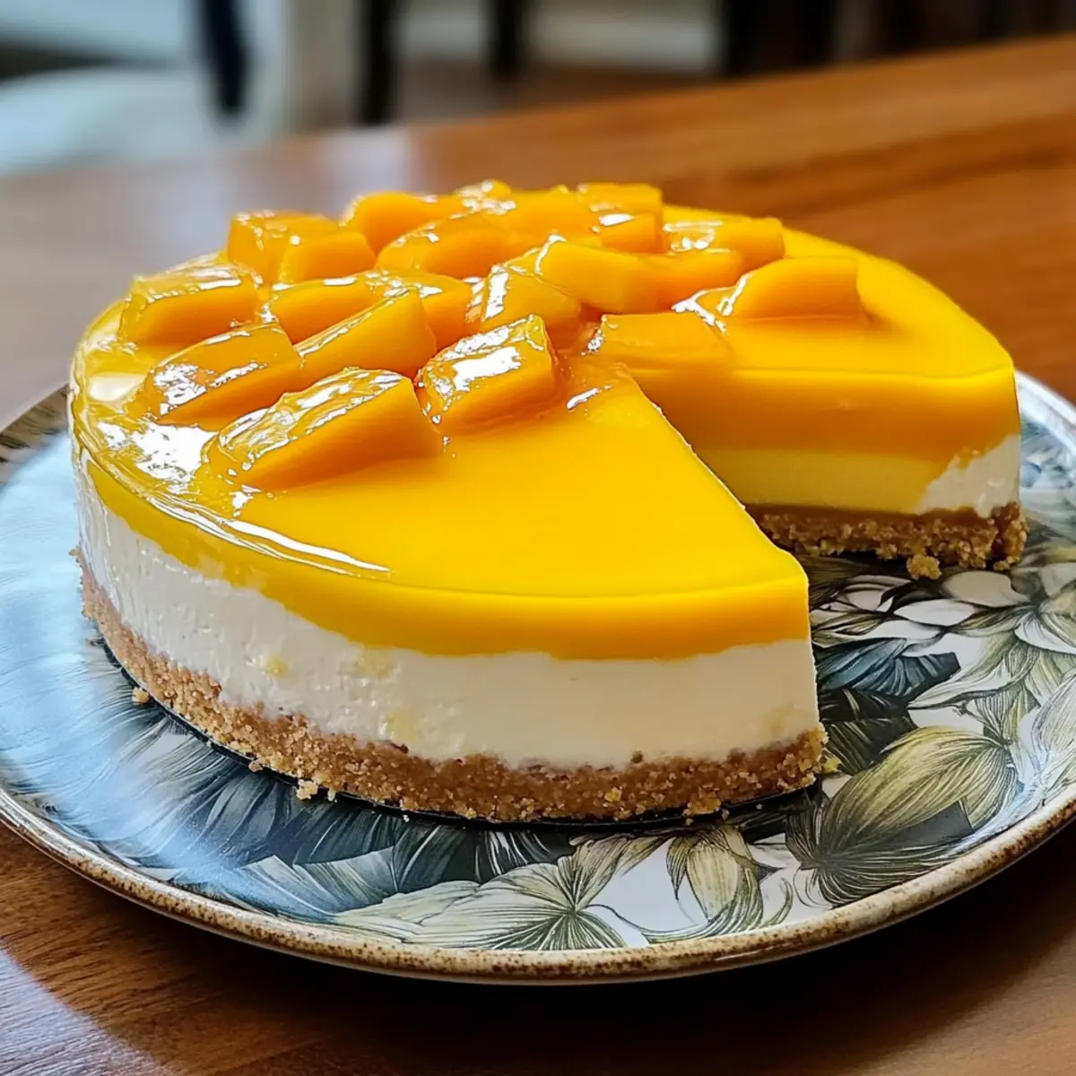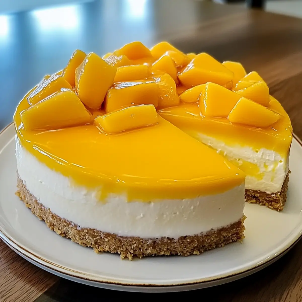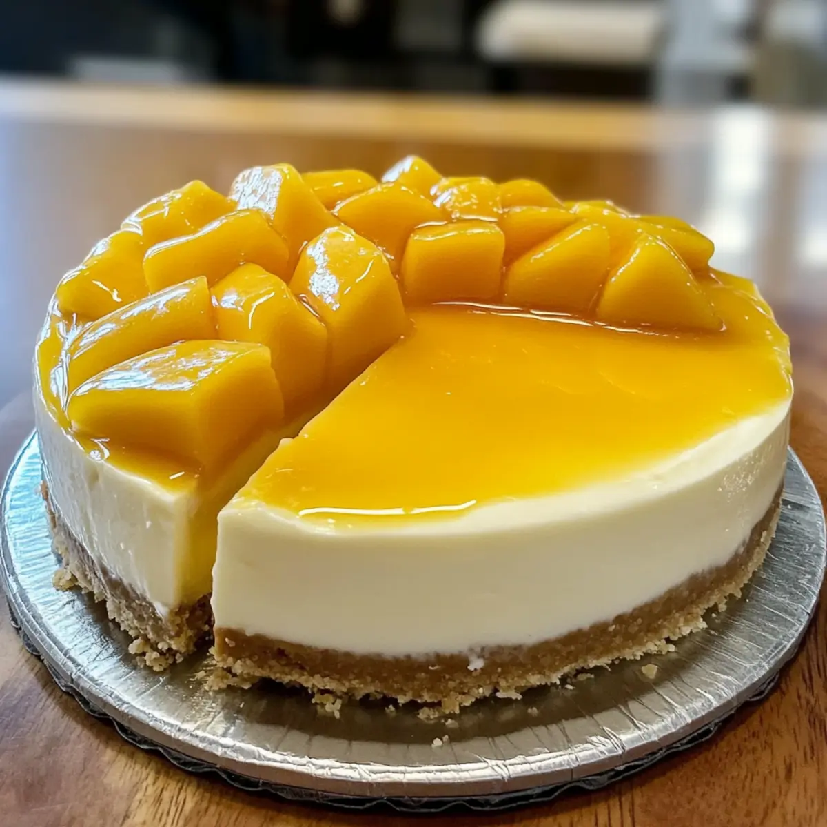 Die Sonne strahlt und der Duft von frischen Mangos erfüllt die Luft, während ich in meiner Küche stehe und an meinem neuesten Dessert arbeite: einem tropischen Mango-Cheesecake. Dieser verrückte Genuss entfaltet in jeder Gabel eineSymphonie aus fruchtiger Süße und cremigen Texturen. Der tropische Mango-Cheesecake ist nicht nur ein echter Hingucker für jede Feier, sondern bietet auch eine einfache Möglichkeit, Gäste oder Familie zu beeindrucken, selbst wenn du in der Küche nicht als Profi gelte. Egal, ob du eine glutenfreie Variante suchst oder es einfach in einer no-bake Version ausprobieren möchtest, diese Leckerei passt perfekt zu warmen Sommertagen. Bist du bereit, dich in die Welt des tropischen Geschmacks zu stürzen? Warum wirst du diesen Cheesecake lieben? Einfachheit: Die Zubereitung ist kinderleicht und benötigt keine speziellen Backfähigkeiten – perfekt für jeden, vom Anfänger bis zum erfahrenen Koch. Fruchtiger Genuss: Der frische Mangogeschmack sorgt für eine aufregende Geschmacksexplosion in jedem Bissen, während die fruchtige Glasur das Ganze abrundet. Vielseitigkeit: Du kannst ihn problemlos abwandeln, indem du andere Früchte wie Ananas oder Passionsfrucht verwendest. Ideal für kreative Köche! Perfekte Präsentation: Mit seinem strahlenden Aussehen zieht dieser Cheesecake garantiert die Blicke auf sich und wäre ein Highlight auf jedem Festtagsbuffet. Zeitersparnis: Vorbereiten kannst du diesen Cheesecake zwei Tage im Voraus, sodass du mehr Zeit für gesellige Momente mit deinen Gästen hast. Entdecke auch unser Rezept für Mango Sago Rezept als erfrischendes Dessert oder probiere unsere Pfirsich Kaesekuchen Rezept für eine weitere köstliche Variante! Zutaten für tropisches Mango-Cheesecake • Um dir das Nachbacken zu erleichtern, hier sind die Hauptzutaten, die du benötigen wirst. Für den Boden Graham-Cracker-Brösel – liefern Struktur und Knusprigkeit für den Boden; glutenfreie Alternativen können verwendet werden. Ungesalzene Butter – fungiert als Bindemittel und verleiht dem Boden einen reichen Geschmack; Kokosöl ist eine gute Option für eine milchfreie Variante. Kristallzucker – sorgt für die notwendige Süße; du kannst die Menge nach Belieben reduzieren. Für die Füllung Frischkäse – das Herzstück für eine cremige Textur; verwende Vollfettversionen für die besten Ergebnisse. Eier – geben der Füllung Struktur und Stabilität; sie helfen, den Cheesecake richtig fest werden zu lassen. Vanilleextrakt – sorgt für zusätzliche Geschmacksnuancen; kann auch durch Mandel-Extrakt ersetzt werden, wenn du eine andere Geschmacksrichtung ausprobieren möchtest. Frisches Mangopüree – die Hauptzutat für den fruchtigen Geschmack; kann durch pürierte Ananas oder Guave ersetzt werden. Maisstärke – unterstützt die Stabilität der Füllung; für eine no-bake Variante kann sie weggelassen werden. Zitronensaft – bringt eine angenehme Säure in die Glasur; Limettensaft bietet eine interessante Alternative. Für die Glasur Frisches Mangopüree – verleiht der Glasur eine fruchtige Frische; wenn du möchtest, kannst du auch andere Früchte verwenden. Kristallzucker – süßt die Glasur und harmoniert perfekt mit dem Mangogeschmack. Maisstärke – hilft, die Glasur zu verdicken und sorgt für eine schöne Konsistenz; kannst du bei der no-bake Variante ebenfalls anpassen. Mach dich bereit, diesen köstlichen tropischen Mango-Cheesecake zuzubereiten – die perfekte Süßigkeit für warme Sommertage! Step-by-Step Instructions für tropisches Mango-Cheesecake Step 1: Boden vorbereiten Heize den Ofen auf 175°C vor. Mische die Graham-Cracker-Brösel mit der geschmolzenen Butter und dem Zucker, bis alles gut kombiniert ist. Drücke diese Mischung gleichmäßig in eine gefettete 23-cm-Springform. Backe den Boden 8-10 Minuten lang, bis er goldbraun ist, und lasse ihn dann auf einem Rost auskühlen. Step 2: Füllung zubereiten Schlage den weich gewordenen Frischkäse in einer großen Schüssel mit einem Handrührgerät, bis er cremig und glatt ist. Füge den Kristallzucker und den Vanilleextrakt schrittweise hinzu und rühre weiter. Integriere die Eier, jeweils eins nach dem anderen, bevor du das frische Mangopüree und die Maisstärke hinzufügst, bis alles gut vermischt ist. Step 3: Cheesecake zusammenstellen und backen Gieße die Füllung gleichmäßig über den abgekühlten Boden in der Springform. Bereite ein Wasserbad vor, indem du die Springform in eine größere Auflaufform stellst, die mit heißem Wasser gefüllt ist. Backe das tropische Mango-Cheesecake 50-60 Minuten lang, bis die Ränder fest und die Mitte leicht wackelt. Step 4: Langsame Abkühlung Schalte den Ofen aus und lasse das Cheesecake bei geöffnetem Ofen mit leicht angelehnter Tür für 1 Stunde abkühlen. Dies hilft, Risse zu verhindern und sorgt für eine gleichmäßige Temperaturverteilung. Nach der Stunde nimmst du den Cheesecake aus dem Ofen und lässt ihn vollständig abkühlen. Step 5: Glasur vorbereiten Erhitze in einem kleinen Topf das frische Mangopüree, den Zucker und den Zitronensaft bei mittlerer Hitze. Rühre die Maisstärke mit einem kleinen Schuss Wasser glatt und füge sie zur Mango-Mischung hinzu. Koche die Mischung unter ständigem Rühren, bis sie eingedickt ist. Lass die Glasur auf Raumtemperatur abkühlen. Step 6: Cheesecake anrichten Gieße die abgekühlte Mango-Glasur gleichmäßig über das kühle Cheesecake. Verwende einen Spatel, um die Glasur gleichmäßig zu verteilen. Stelle das Cheesecake für mindestens 6 Stunden in den Kühlschrank, damit es fest wird und die Aromen durchziehen können. Step 7: Servieren Garnieren das tropische Mango-Cheesecake mit frischen Mangoscheiben, Schlagsahne oder Minzblättern, bevor du es anschneidest. Stelle sicher, dass du es gut gekühlt servierst, um den vollen Geschmack der fruchtigen Füllung zu genießen. Variationen und Alternativen für tropisches Mango-Cheesecake Erlaube dir, mit diesen köstli