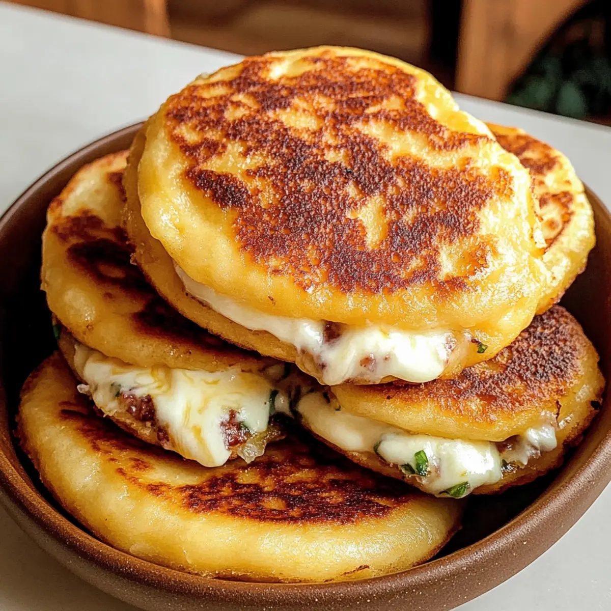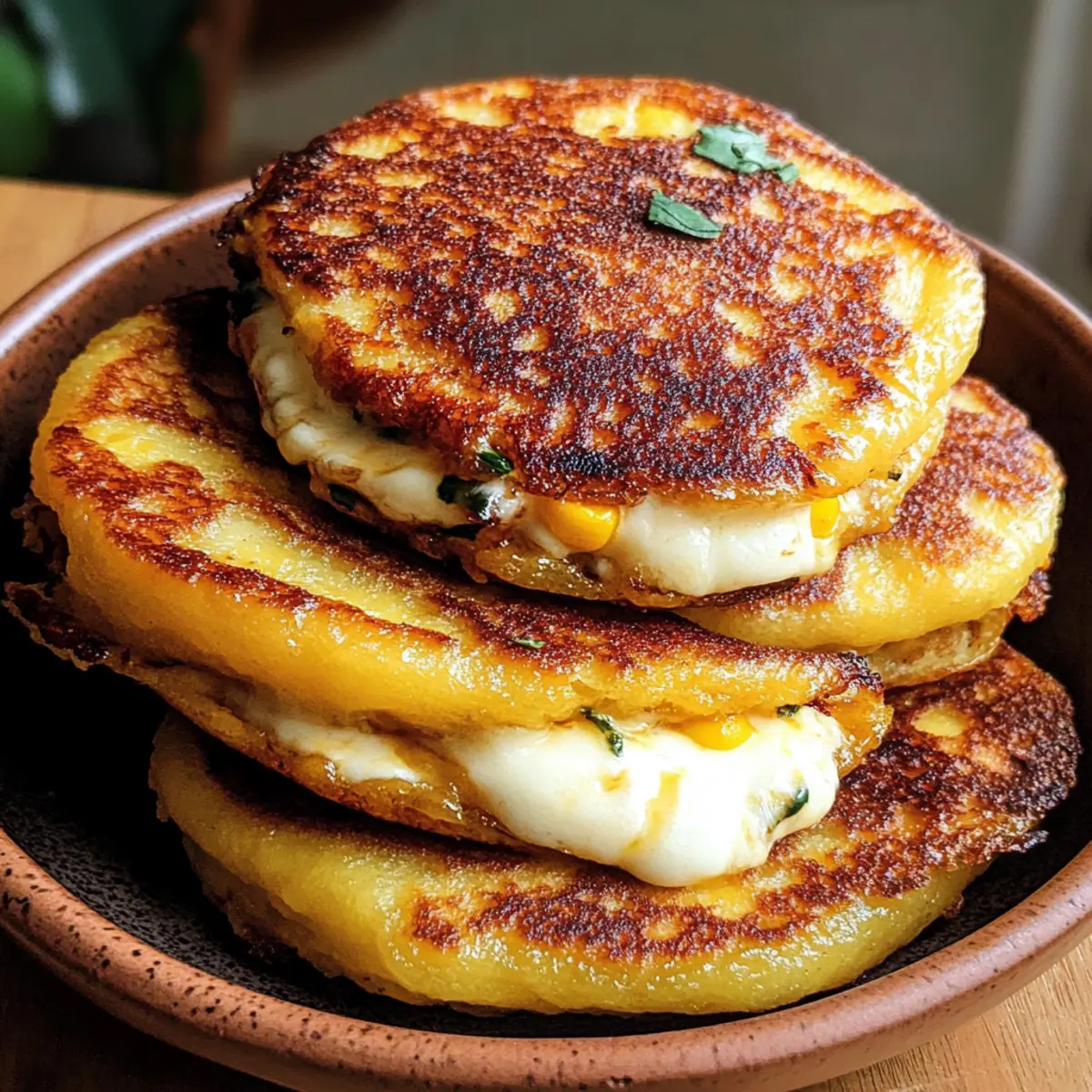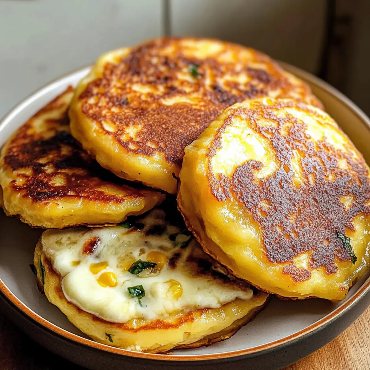 Die Aromen Venezuelas sind wie eine liebevolle Umarmung auf dem Teller und einer meiner absoluten Favoriten, wenn es um schnelles, herzhaftes Kochen geht. Heute entführe ich euch in die Welt der Venezolanischen Süßmais-Cachapas – köstliche, goldene Pfannkuchen aus süßem Mais, die puren Genuss versprechen. Diese kleinen Leckerbissen sind nicht nur einfach zuzubereiten, sondern auch wahre Alleskönner für jeden Anlass, sei es als Frühstück, Snack oder leichte Mahlzeit. Mit schmelzender Mozzarella-Füllung und einem Hauch von Karibik zaubern sie einen warmen, tröstlichen Moment auf euren Tisch. Bereit, eure Geschmacksknospen zu verwöhnen? Lassen wir diese kleinen Meisterwerke aus dem Ofen zaubern! Warum werden Sie diese Cachapas lieben? Einfachheit: Die Zubereitung ist unkompliziert und erfordert nur grundlegende Kochfähigkeiten, perfekt für Anfänger und erfahrene Hobbyköche. Harmonische Aromen: Diese pfannkuchenartigen Leckereien verbinden süßen Mais mit cremiger Mozzarella, für ein unvergleichliches Geschmackserlebnis. Vielseitigkeit: Ob zum Frühstück, als Snack oder leichte Mahlzeit – Cachapas passen zu jedem Moment und lassen sich mit verschiedenen Toppings wie Avocado oder Speck ideal kombinieren. Eine richtige Gaumenfreude! Schnell zubereitet: Mit nur wenigen Zutaten sind sie im Nu fertig – ideal für hektische Tage! Crowd-Pleaser: Egal ob Familie oder Freunde, jeder wird diese köstlichen Cachapas lieben. Probieren Sie auch unsere Spaghetti Kuerbis Auflauf für eine weitere herzhafte Option! Venezolanische Süßmais-Cachapas Zutaten • Für das Pfannkuchenteig: Süßer Mais – sorgt für die Hauptsüße und Struktur. Frischer oder aufgetauter, gefrorener Mais ist ideal; meiden Sie Dosenmais für den besten Geschmack. Ei – wirkt als Bindemittel und verleiht Fülle. Allzweckmehl – sorgt für Struktur und hilft, die gewünschte Pfannkuchen-Textur zu erreichen. Salz – hebt die Geschmacksbalance. Zucker – fügt eine subtile Süße hinzu. Für eine florale Note können Sie auch einen Spritzer Honig verwenden. • Für das Braten: Pflanzenöl – zum Braten; sorgt für eine knusprige Außenseite. • Für die Füllung: Buffalo-Mozzarella – traditionelle Füllung, die wunderschön schmilzt. Alternativen sind queso de mano oder queso fresco. • Zum Servieren: Ungesalzene Butter – fügt beim Servieren Reichtum hinzu. Schritt-für-Schritt-Anleitung für Venezolanische Süßmais-Cachapas Step 1: Teig vorbereiten In einem Mixer oder Küchenmaschine den süßen Mais, das Ei, das Allzweckmehl, das Salz und den Zucker vermengen. Die Zutaten gut mixen, bis die Mischung größtenteils glatt, aber noch mit etwas Struktur vom Mais ist. Dieser Teig sollte eine dickflüssige Konsistenz haben, die leicht vom Löffel fällt. Step 2: Cachapas braten In einer großen Pfanne das Pflanzenöl bei mittlerer Hitze erhitzen. Für jede Cachapa etwa 60 ml Teig in die Pfanne geben und mit einem Löffel gleichmäßig zu einem runden Fladen formen. Die Cachapas für 3-4 Minuten braten, bis die Unterseite goldbraun und knusprig ist, dann vorsichtig wenden und die andere Seite ebenfalls braten. Step 3: Käsefüllung hinzufügen Sobald die Cachapas auf beiden Seiten schön goldbraun sind, die Pfanne vom Herd nehmen. Einige Scheiben Buffalo-Mozzarella in die Mitte jeder warmen Cachapa legen und die Pfannkuchen vorsichtig zusammenklappen. Lassen Sie die Resthitze die Käsescheiben schmelzen, sodass eine köstlich cremige Füllung entsteht. Step 4: Servieren Die leckeren Venezolanischen Süßmais-Cachapas warm auf einem Teller anrichten. Für zusätzlichen Reichtum einen kleinen Klecks ungesalzene Butter auf jede Cachapa geben und sofort servieren. Sie können diese vielseitigen Pfannkuchen pur genießen oder mit einer Dip-Sauce Ihrer Wahl servieren. Expertentipps für Venezolanische Süßmais-Cachapas • Frischer Mais ist der Schlüssel: Verwenden Sie frischen oder aufgetauten gefrorenen Mais für den besten Geschmack und die beste Konsistenz. Dosenmais kann den Genuss mindern. • Achten Sie auf die Pfannentemperatur: Stellen Sie sicher, dass die Pfanne heiß genug ist, bevor Sie den Teig hinzufügen. So erhalten Sie eine schöne, knusprige Außenseite. • Nicht zu viel vermengen: Mischen Sie den Teig nur bis er größtenteils glatt ist. Eine gewisse Textur des Mais sollte erhalten bleiben, um den Cachapas Charakter zu verleihen. • Käse-Variation: Probieren Sie verschiedene Käsesorten, wie queso de mano oder sogar pflanzlichen Käse, wenn Sie eine vegane Variante der Venezolanischen Süßmais-Cachapas möchten. • Warten Sie beim Füllen: Lassen Sie die Fleischstücke einige Minuten ruhen, damit der Käse besser schmelzen kann und sich die Aromen entfalten. Venezolanische Süßmais-Cachapas Abwandlungen Entdecke, wie du diese köstlichen Cachapas auf deine eigene Art anpassen kannst und zaubere noch mehr Geschmack auf den Teller! Vegan: Ersetze die Buffalo-Mozzarella mit pflanzlichem Käse für eine vegane Variante, die genauso köstlich ist. Deftige Füllung: Füge knusprig gebratenen Speck oder ham hinzu, für einen herzhaften Kick, der deine Geschmacksnerven zum Tanzen bringt. Picante: Verleihe deinem Cachapas eine scharfe Note, indem du gehackte Jalapeños in den Teig mischst. So wird es noch aufregender! Süß und herzhaft: Toppe die Cachapas mit einer Karamellsauce oder Honig und mache sie zu einem Dessert, das lieben werden! Fruchtige Frische: Eine Mischung aus Avocado und Limette als Füllung bringt eine erfrischende Komponente, die toll zu den süßen Aromen passt. Käsewechsel: Variiere mit verschiedenen Käsesorten wie Queso Fresco für unterschiedliche Geschmäcker und Texturen – das ist Abwechslung pur! Dipper: Serviere die Cachapas mit einem cremigen Avocado-Dip oder rauchigem Salsa für ein zusätzliches Geschmackserlebnis. Süßigkeiten-Twist: Kakao- oder Kokosraspeln im Teig geben eine unerwartete Süße, die eine verführerische Variante schafft. Wenn du de