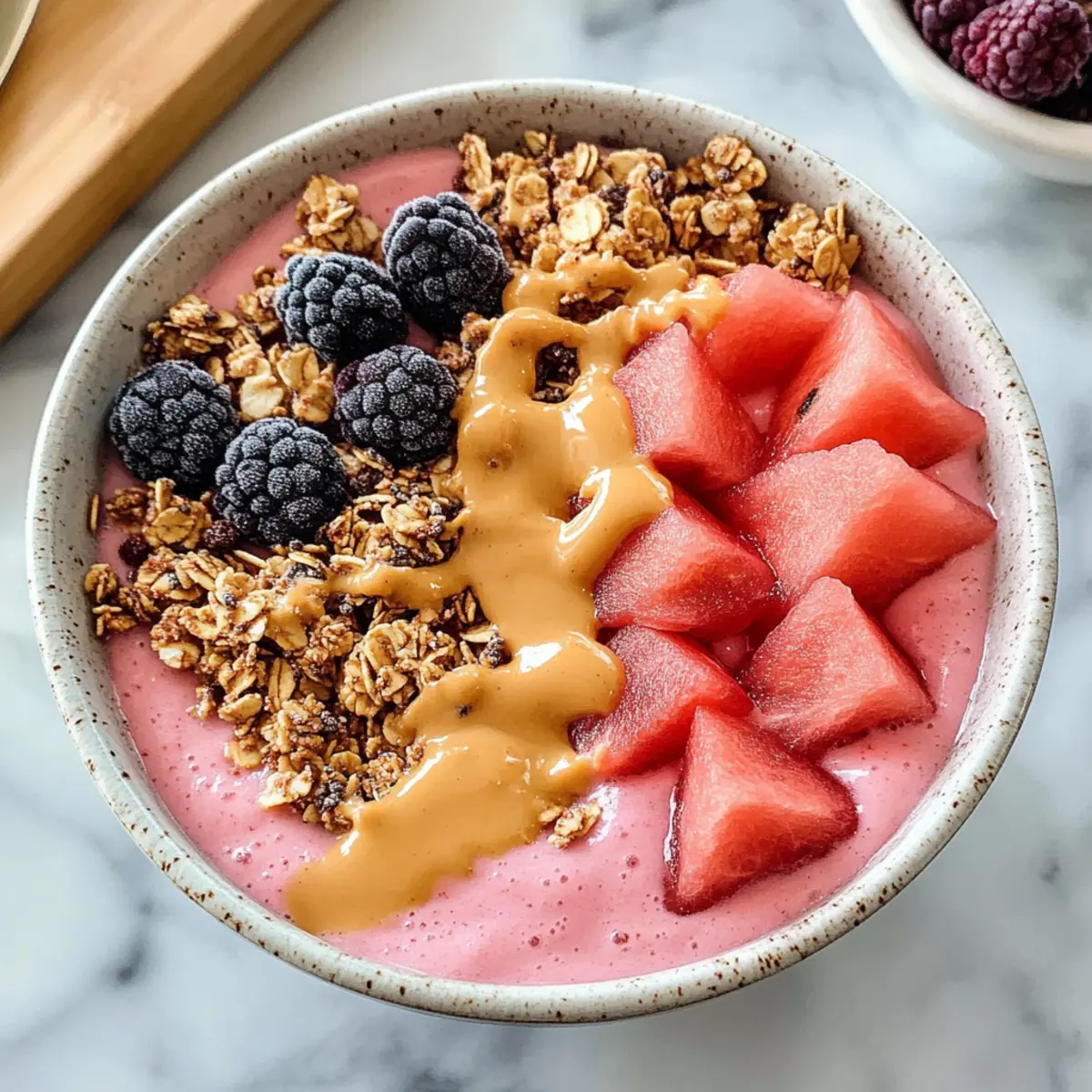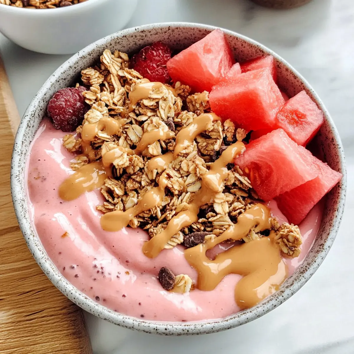 An heißen Sommertagen kann ich nichts Widerstehlicheres vorstellen als eine erfrischende, kühle Wassermelonen-Smoothie-Schüssel. Diese cremige Leckerei erinnert nicht nur an ein angenehm geschmeidiges Eis, sondern ist auch voller gesunder Nährstoffe. Perfekt als schnelles Frühstück, leckerer Snack oder leichtes Dessert, überzeugt sie nicht nur durch ihren Geschmack, sondern auch durch ihre einfache Zubereitung. Mit gefrorenen Wassermelonen und Bananen zauberst du im Handumdrehen eine gehaltvolle, hydrierende Mahlzeit, die glutenfrei und rein pflanzlich ist. Neugierig, wie du dieses köstliche und gesunde Vergnügen selbst zubereiten kannst? Lass uns gleich mit dem Rezept beginnen! Warum wirst du diese Rezept lieben? Einfachheit: Die Zubereitung ist kinderleicht und benötigt nur ein paar grundlegende Zutaten. Erfrischende Textur: Die cremige Konsistenz dieser Wassermelonen-Smoothie-Schüssel ist wie ein Traum an heißen Tagen. Vielseitigkeit: Variiere mit verschiedenen Früchten wie Mangos oder Beeren, um deine eigenen Geschmackskombinationen zu kreieren! Gesundheitlich vorteilhaft: Vollgepackt mit Vitaminen und hydrierenden Inhaltsstoffen ist diese Schüssel nicht nur lecker, sondern auch nahrhaft. Schnell gemacht: In weniger als 10 Minuten hast du ein erfrischendes Gericht, ideal für eilige Momente, in denen du dennoch etwas Gesundes genießen möchtest. Familienfreundlich: Diese Smoothie-Schüssel wird sowohl Kinder als auch Erwachsene begeistern und ist ein großartiger Weg, um heimisches Obst in die Ernährung einzubringen. Wassermelonen-Smoothie-Schüssel Zutaten • Für deine kreative Wassermelonen-Smoothie-Schüssel: Gefrorene Wassermelonen – Hauptzutat, die für eine erfrischende Süße und Hydratation sorgt. Note: Schneide die Wassermelone in Würfel und friere sie ein, um die beste Konsistenz zu erzielen. Gefrorene Bananen – Fügt Cremigkeit und natürliche Süße hinzu. Substitution: Du kannst gefrorene Erdbeeren oder Mangos anstelle der Bananen verwenden. Gefrorener Kokosnuss-Smoothie-Pack (oder Kokosmilch) – Optinal für zusätzliche Cremigkeit. Substitution: Nutze zusätzliche gefrorene Bananen oder Eiswürfel aus Kokosjoghurt. • Für die Toppings: Granola – Fügt einen knusprigen Biss hinzu und macht deine Schüssel noch köstlicher. Frische Früchte – Ob Beeren, Bananenscheiben oder Mangostücke; sie bringen Farbe und zusätzliche Nährstoffe. Saaten (wie Chiasamen oder Hanfsamen) – Perfekt für eine Extraportion pflanzlicher Proteine und gesunder Fette. Nussbutter (z.B. Erdnussbutter oder Mandelbutter) – Voller Geschmack und gesunde Fette, ideal zum Drüberträufeln. Jetzt bist du bereit, deine eigene erfrischende Wassermelonen-Smoothie-Schüssel zuzubereiten! Schritt-für-Schritt-Anleitung für die Wassermelonen-Smoothie-Schüssel Schritt 1: Früchte auftauen Lass die gefrorenen Wassermelonen- und Bananenstücke etwa 5-7 Minuten im Mixer antauen. Dies erleichtert das Mischen und sorgt für eine schön cremige Konsistenz in deiner Wassermelonen-Smoothie-Schüssel. Halte dabei die Maschine bereit, um zügig mit dem nächsten Schritt fortzufahren. Schritt 2: Zutaten kombinieren Gib die aufgetauten Wassermelonen- und Bananenstücke zusammen mit dem gefrorenen Kokosnuss-Smoothie-Pack oder der Kokosmilch in einen Hochgeschwindigkeitsmixer. Achte darauf, dass die Zutaten gleichmäßig verteilt sind, damit sie sich problemlos vermischen können. Bereite den Mixer vor, um die leckere Mischung bald zu genießen! Schritt 3: Mischen bis zur Cremigkeit Püriere die Mischung auf hoher Stufe, bis sie wunderbar glatt ist. Nutze einen Tamper, um die Zutaten näher an die Klingen zu bringen, falls nötig. Wenn die Masse nicht gut vermischt, halte kurz inne, um die Wände des Mixers abzukratzen und alle Fruchtstücke zu erfassen. Die perfekte Konsistenz wird dünnflüssigem Eis ähneln. Schritt 4: Dicke beibehalten Vermeide es, zu viel Flüssigkeit hinzuzufügen, um die dicke Konsistenz der Wassermelonen-Smoothie-Schüssel zu bewahren. Falls es notwendig ist, kannst du einen kleinen Schuss pflanzliche Milch (bis zu ¼ Tasse) hinzufügen. Visuell sollte die Masse zwar dick, aber gut mixbar sein, sodass du sie in deine Schüssel gießen kannst. Schritt 5: Servieren und garnieren Gieße die fertige Smoothie-Mischung in eine Schüssel. Jetzt kommt das Beste: Beginne, die Schüssel mit deinen bevorzugten Toppings zu garnieren. Denk an knuspriges Granola, frische Früchte, nahrhafte Samen oder einen Schuss Nussbutter. Diese zusätzlichen Zutaten verleihen deiner Wassermelonen-Smoothie-Schüssel nicht nur Geschmack, sondern auch texturale Vielfalt. Tipps zur Vorbereitung der Wassermelonen-Smoothie-Schüssel Die Wassermelonen-Smoothie-Schüssel ist ideal für eine unkomplizierte Vorbereitung! Du kannst die gefrorenen Wassermelonenstücke bis zu 24 Stunden im Voraus schneiden und in einem luftdichten Behälter einfrieren, um die beste Textur zu erhalten. Zusätzlich können die Bananen ebenfalls im Voraus zubereitet und gelagert werden. Achte darauf, deine gefrorenen Früchte vor dem Mixen 5-7 Minuten auftauen zu lassen, damit sie sich leichter vermengen und eine cremige Konsistenz erreichen. Wenn du dann bereit bist, die Wassermelonen-Smoothie-Schüssel zu servieren, püriere einfach die aufgetauten Früchte mit der Kokosmilch, garniere sie nach Belieben und genieße ein erfrischendes, zeitsparendes Gericht! Wassermelonen-Smoothie-Schüssel Variationen Du kannst deine Wassermelonen-Smoothie-Schüssel ganz nach deinem Geschmack anpassen und umgestalten! Beeren-Mix: Tausche Wassermelonen gegen gefrorene Erdbeeren oder Himbeeren für einen fruchtigeren Geschmack. Tropische Note: Füge gefrorene Ananas oder Mango hinzu, um das Rezept mit einem Hauch von Tropenfeeling zu verfeinern. Nusscreme: Garniere mit Mandel- oder Erdnussbutter für zusätzliche Cremigkeit und Protein. Superfood-Boost: Streue Chia- oder Leinsamen über die Oberfläche für einen zusätzlichen Nährstoffk