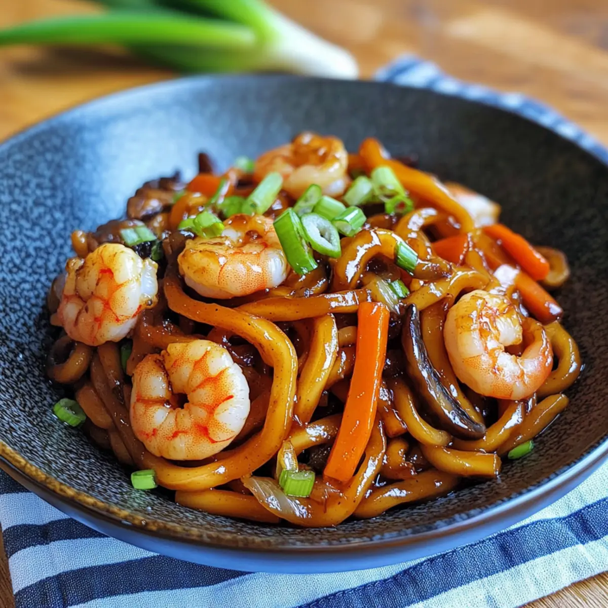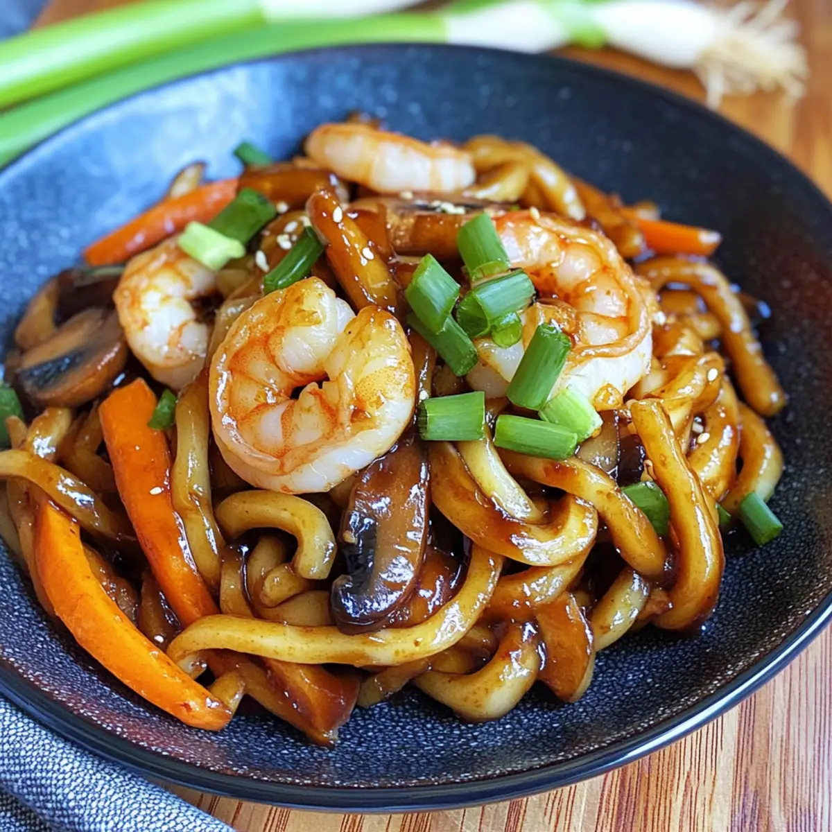 Der Duft von frisch zubereiteten Udon-Nudeln kann einen sofort in die belebten Straßen Japans entführen. Heute möchte ich mit euch mein Rezept für Yaki Udon mit Garnelen teilen – ein schnelles und köstliches Gericht, das sich perfekt für hektische Wochentage eignet. In nur 20 Minuten zaubert ihr eine wahre Geschmacksexplosion aus zarten udon-Nudeln, saftigen Garnelen und buntem Gemüse. Dieses Gericht ist nicht nur ein schneller Genuss, sondern auch eine verwöhnende Umarmung für die Seele, die alle in der Familie begeistern wird. Seid ihr bereit, eure Küchenabenteuer mit mir zu beginnen und in die Welt der asiatischen Küche einzutauchen? Warum wird dieses Rezept dein Favorit? Einfachheit ist Trumpf: Die Zubereitung von Yaki Udon mit Garnelen erfordert lediglich grundlegende Kochfähigkeiten und ist in nur 20 Minuten fertig. Füllende Aromen: Die Kombination von zarten Garnelen, frischem Gemüse und würzigen Saucen sorgt für einen intensiven Geschmack, der die Sinne verführt. Vielfalt in der Küche: Dieses Rezept ist flexibel – wechsle die Garnelen gegen Hühnchen oder Tofu, oder füge dein Lieblingsgemüse hinzu, um neue Geschmäcker zu entdecken. Schnelle Lösung: Ideal für hektische Wochentage, ist dieses Gericht eine einfache und schnelle Möglichkeit, ein gesundes und herzhaftes Essen auf den Tisch zu bringen. Familienfreundlich: Mit seiner ansprechenden Farbe und dem köstlichen Geschmack wird dieses Gericht sicher alle in der Familie begeistern – perfekt für ein gemeinsames Abendessen! Yaki Udon mit Garnelen Zutaten • Hier sind die Zutaten für dein schnelles und köstliches Yaki Udon mit Garnelen: Udon-Nudeln – Die Basis des Gerichts; am besten vakuumverpackt für mehr Bequemlichkeit. Neutrales Öl (2 Esslöffel) – Zum Braten; du kannst Raps- oder Pflanzenöl verwenden. Garnelen (8-10, ca. 100g) – Sie liefern Proteine; sowohl frische als auch gefrorene Garnelen sind geeignet. Knoblauch (1 Zehe, gehackt) – Fügt ein aromatisches Geschmackserlebnis hinzu. Gelbe Zwiebel (1, in Scheiben) – Bringt Süße und Textur ins Gericht. Weiße Champignons (8, ca. 120g, in Scheiben) – Steigern den Umami-Geschmack. Karotte (1, in Stiftchen geschnitten) – Sorgt für Farbe und Knusprigkeit. Frühlingszwiebel (1 Bund, grüne und weiße Teile getrennt gehackt) – Für Garnierung und zusätzliche Frische. Sojasauce (1 Esslöffel) – Gibt eine salzige und umami-reiche Tiefe; verwende reguläre Sojasauce. Salz und Pfeffer (nach Geschmack) – Für die nötige Würze. Austernsauce (1 Esslöffel) – Verstärkt den Reichtum des Gerichts. Dunkle Sojasauce (1 Teelöffel, NICHT die reguläre) – Fügt Farbe und zusätzliche Geschmacksdimensionen hinzu. Reisessig (1 Teelöffel) – Bringt einen Hauch von Säure zur Geschmacksbalance. Brauner Zucker (1 Teelöffel) – Für einen Hauch von Süße. Frisch gemahlener schwarzer Pfeffer (⅓ Teelöffel) – Fügt Wärme und Komplexität hinzu. Geröstetes Sesamöl (2 Teelöffel) – Der finale Geschmacksträger, der Nussigkeit verleiht. Jetzt hast du alle Zutaten parat, um mit der Zubereitung deines Yaki Udon mit Garnelen zu beginnen! Schritt-für-Schritt-Anleitung für Yaki Udon mit Garnelen Step 1: Udon-Nudeln vorbereiten Bringe einen großen Topf mit Wasser zum Kochen und koche die Udon-Nudeln gemäß den Anweisungen auf der Verpackung für etwa 8–10 Minuten. Sobald sie fertig sind, gieße sie ab, spüle sie unter kaltem Wasser ab, und gib einen Esslöffel Öl hinzu, um ein Verkleben zu verhindern. Stelle die Nudeln beiseite. Step 2: Gemüse anbraten Erhitze in einer großen Pfanne oder einem Wok 1 Esslöffel neutrales Öl bei mittlerer Hitze. Füge den gehackten Knoblauch hinzu und brate ihn für etwa 1 Minute, bis er aromatisch ist. Gib die geschnittenen Champignons in die Pfanne und brate sie weiter für 3–4 Minuten, bis sie weich sind und Flüssigkeit abgeben. Step 3: Zwiebeln und Karotten hinzufügen Jetzt kommen die Zwiebelringe und die Karottenstifte in die Pfanne. Brate alles zusammen für 2–3 Minuten an, bis die Zwiebeln glasig und die Karotten leicht weich sind. Würze das Gemüse mit Salz und Pfeffer nach Geschmack und rühre gut um, um die Aromen miteinander zu verbinden. Step 4: Garnelen zubereiten Schiebe das Gemüse an den Rand der Pfanne und erhitze zusätzlich 2 Esslöffel Öl in der Mitte. Füge die Garnelen hinzu und brate sie für 2–3 Minuten, bis sie rosa und durchgegart sind. Während des Bratens kannst du die Sojasauce und etwas Salz über die Garnelen geben, um sie zusätzlich zu würzen. Step 5: Udon-Nudeln und Gemüse kombinieren Gib nun die vorbereiteten Udon-Nudeln in die Pfanne zu den Garnelen und dem Gemüse. Brate alles zusammen auf hoher Hitze für 2–3 Minuten, damit die Nudeln leicht knusprig werden und alles gut vermischt ist. Rühre kontinuierlich um, um ein Anhaften zu vermeiden. Step 6: Sauce hinzufügen Bereite die Sauce vor, indem du Austernsauce, dunkle Sojasauce, Reisessig, braunen Zucker und frisch gemahlenen schwarzen Pfeffer in einer Schüssel vermischst. Gieße diese Mischung über die Nudeln in der Pfanne und mische alles gründlich, bis die Nudeln gleichmäßig mit der Sauce bedeckt sind. Step 7: Anrichten und servieren Sobald alles gut vermengt ist, nimm die Pfanne vom Herd. Garniere dein Yaki Udon mit Garnelen großzügig mit den gehackten Frühlingszwiebelspitzen. Serviere das Gericht heiß und genieße die köstlichen Aromen! Lagerungstipps für Yaki Udon mit Garnelen Kühlschrank: Bewahre übrig gebliebenes Yaki Udon mit Garnelen in einem luftdichten Behälter auf. Es bleibt im Kühlschrank bis zu 2–3 Tage frisch, aber genieße es am besten sofort. Gefrierschrank: Du kannst das Gericht auch bis zu 1 Monat im Gefrierschrank lagern. Achte darauf, es luftdicht zu verpacken, um Gefrierbrand zu vermeiden. Aufwärmen: Um das Yaki Udon wieder herzhaft zu machen, erwärme es in einer Pfanne mit etwas Wasser oder Öl, bis es durchgehend heiß ist. So bleibt die Textur 