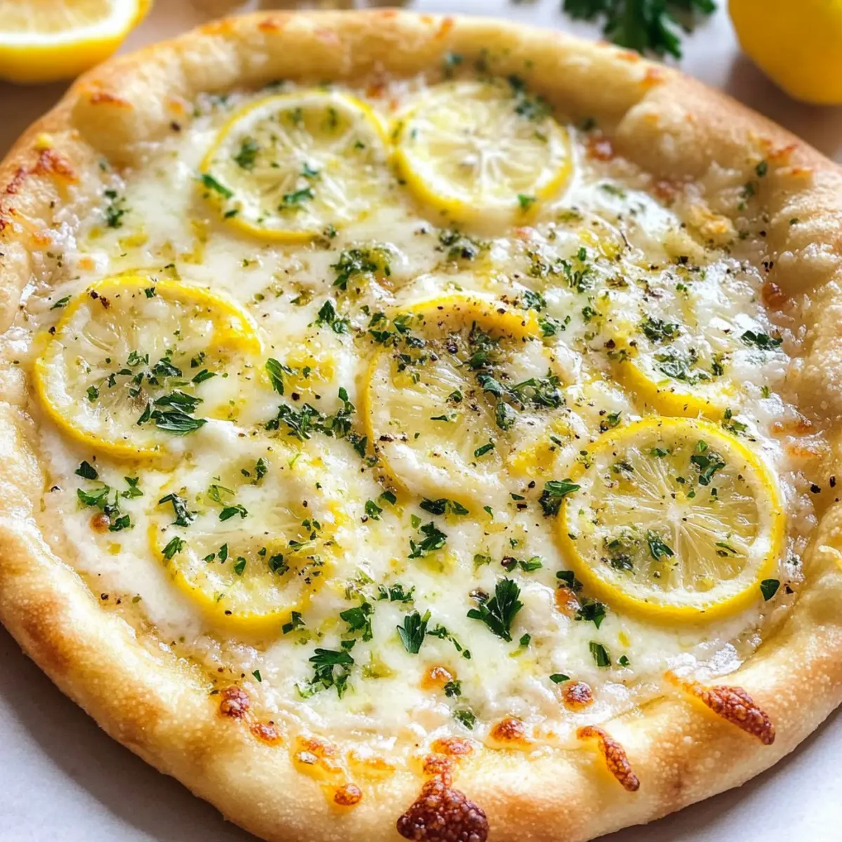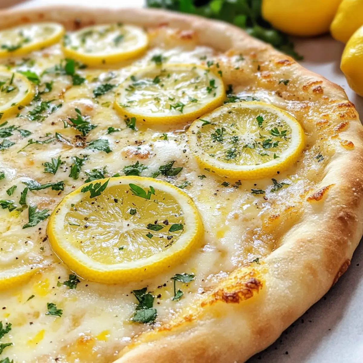„Hast du schon einmal darüber nachgedacht, wie die frische Brise am Sommermorgen den perfekten Biss ausmachen kann? Diese Zitronenpizza ist genau das – eine harmonische Verbindung von cremigem Mozzarella und der spritzigen Frische der Zitrone, die dein Geschmackserlebnis auf ein neues Level hebt. Ideal für warme Tage, bietet sie nicht nur eine schnelle Zubereitung, sondern spricht sowohl Vegetarier als auch Fleischliebhaber an. Mit aromatischem Knoblauch und frischen Kräutern zauberst du in kürzester Zeit ein einzigartiges Gericht, das die Sinne belebt und deine Gäste begeistert. Bist du bereit, in die Welt dieser erfrischenden Sommerpizza einzutauchen?“ Warum ist diese Zitronenpizza so besonders? Einzigartiger Geschmack: Die Kombination aus cremigem Mozzarella und spritziger Zitrone verleiht deiner Pizza ein unverwechselbares Aroma. Schnell und einfach: Diese Zitronenpizza lässt sich mit wenigen Handgriffen und ohne viel Aufwand zubereiten. Ideal für spontane Kochabende! Vielseitigkeit: Du kannst sie nach Belieben anpassen, sei es mit gebratenem Gemüse oder einem Schuss Chili – deiner Kreativität sind keine Grenzen gesetzt. Perfekt für den Sommer: Diese erfrischende Pizza eignet sich hervorragend für warme Tage und sorgt für den perfekten Genuss bei Grillpartys oder Picknicks. Geselliges Kochen: Gemeinsam die Pizza belegen und im Ofen backen macht nicht nur Spaß, sondern schafft auch schöne Erinnerungen mit Freunden und Familie. Probiere sie als leckere Ergänzung zu einem einfachen arugula salad oder genieße sie einfach pur! Zitronenpizza Zutaten • Diese Liste hilft dir bei der Zubereitung der perfekten Zitronenpizza! Für den Pizzateig Pizzateig – Die Grundlage für deine Pizza; wähle zwischen einem einfachen Rezept oder fertigem Teig für mehr Bequemlichkeit. Für die Brine Olivenöl extra vergine – Sorgt für fruchtigen Geschmack; bei Bedarf kannst du auch einfaches Olivenöl verwenden. Wasser – Hydriert die Brine; nutze gefiltertes Wasser für die besten Ergebnisse. Frische Petersilie – Verleiht eine herzhafte Note; Basilikum oder Rucola sind tolle Alternativen. Knoblauch – Infundiert die Brine mit Geschmack; frischer, geriebener Knoblauch ist am besten. Zitronenschale – Verstärkt das Zitronenaroma; verwende frische Zitronen für Zesten und Saft. Zitronensaft – Fügt Säure und Frische hinzu; nach Geschmack variieren. Feines Salz – Hebt den Gesamtgeschmack hervor; nach Belieben anpassen. Schwarzer Pfeffer – Für die Würze; frisch gemahlener Pfeffer hat ein intensiveres Aroma. Für den Belag Frische Mozzarella – Sorgt für Cremigkeit; als Ersatz kann geriebener Mozzarella eingesetzt werden. Geriebener Parmesan – Ergänzt den nussigen Geschmack; bei einer veganen Variante einfach weglassen. Frisch gemahlener schwarzer Pfeffer nach Geschmack – Für einen zusätzlichen Kick in deinem Gericht. Genieße das Zubereiten dieser köstlichen Zitronenpizza, die nicht nur erfrischend ist, sondern auch deine Gäste begeistern wird! Schritt-für-Schritt-Anleitung für Zitronenpizza Schritt 1: Pizzateig vorbereiten Bereite den Pizzateig vor, indem du das einfache Rezept ohne Kneten bis Schritt 5 befolgst. Lass den Teig an einem warmen Ort für etwa 1 Stunde gehen, bis er sich verdoppelt hat und luftig aussieht. Dies ist die perfekte Grundlage für deine köstliche Zitronenpizza. Schritt 2: Käse vorbereiten Wenn du frische Mozzarella verwendest, nimm die Kugeln aus der Verpackung und lasse sie etwas abtropfen. Schneide die Mozzarella in dünne Scheiben und lege sie auf ein Küchenpapier, damit die überschüssige Feuchtigkeit aufgesogen wird. Dies sorgt dafür, dass die Zitronenpizza nicht zu wässrig wird. Schritt 3: Teig ausrollen Lege ein Blatt Backpapier auf eine Arbeitsfläche und rolle den Pizzateig auf etwa 23×33 cm aus. Achte darauf, dass der Teig gleichmäßig dick ist und an den Rändern leicht ansteigt, damit er später gut backt und die Füllung hält. Schritt 4: Brine zubereiten Mische in einem Glas Olivenöl, Wasser, gehackte Petersilie, geriebenen Knoblauch, Zitronenschale, Zitronensaft, Salz und schwarzen Pfeffer. Veschließe das Glas und schüttle kräftig, bis die Mischung gut emulgiert ist. Diese Brine wird deinen Zitronenpizza-Geschmack intensivieren. Schritt 5: Pizza zusammenstellen Mache mit deinem Finger oder einem Löffel kleine Dellen im ausgerollten Teig. Gieße die Brine gleichmäßig über den Teig, sodass sie in die Dellen eindringen kann. Verteile die geschnittene Mozzarella großzügig auf der Pizzabasis, um sie gleichmäßig zu beschichten. Schritt 6: Pizza backen Heize deinen Ofen auf 230 °C vor und stelle einen Pizzastein hinein, damit er heiß wird. Übertrage die Zitronenpizza vorsichtig mit dem Backpapier auf den heißen Pizzastein und backe sie für ca. 8–10 Minuten, bis der Rand goldbraun und der Käse schön blubbernd ist. Schritt 7: Servieren Nimm die Zitronenpizza aus dem Ofen und beträufle sie mit zusätzlichem Zitronensaft. Bestreue die Pizza mit geriebenem Parmesan, frischer Petersilie und frisch gemahlenem schwarzem Pfeffer. Schneide die Pizza in Stücke und genieße sie sofort, während sie noch warm und frisch ist. Was passt gut zur Zitronenpizza? Entdecke, wie du mit einfachen Beilagen ein köstliches Sommermenü kreierst, das alle Sinne anspricht. Rucola-Salat: Dieser frische Salat mit einem Spritzer Zitronenvinaigrette ergänzt die Aromen der Pizza perfekt und sorgt für einen leichten, knackigen Kontrast. Die Bitterkeit des Rucolas harmoniert exquisit mit der Cremigkeit der Mozzarella. Grünes Pesto: Das nussige Aroma des Pestos unterstreicht die Zitrusnoten der Pizza. Einfach als Dip oder als Auflage verwenden, um die geschmackliche Tiefe zu erhöhen. Es gibt dem Gericht eine italienische Note. Gegrillte Zucchini: Zarte, gegrillte Zucchinischeiben fügen eine angenehm rauchige Textur hinzu. Ihre Süße balanciert die spritzige Frische der Zitronenpizza perfekt. Einfach mit Olivenöl und et