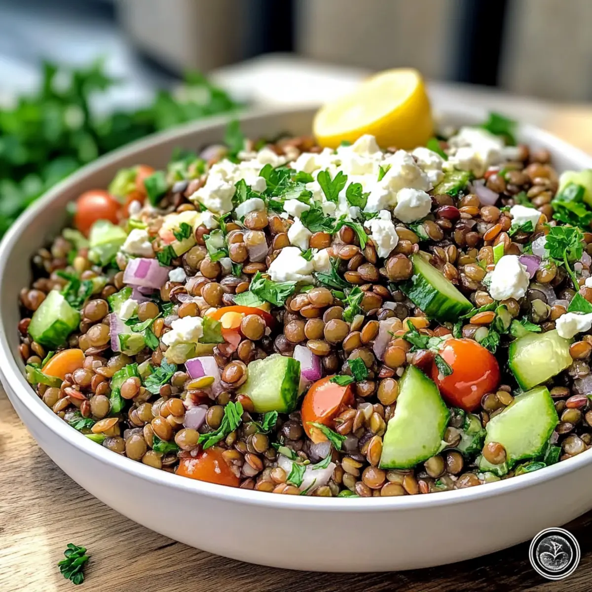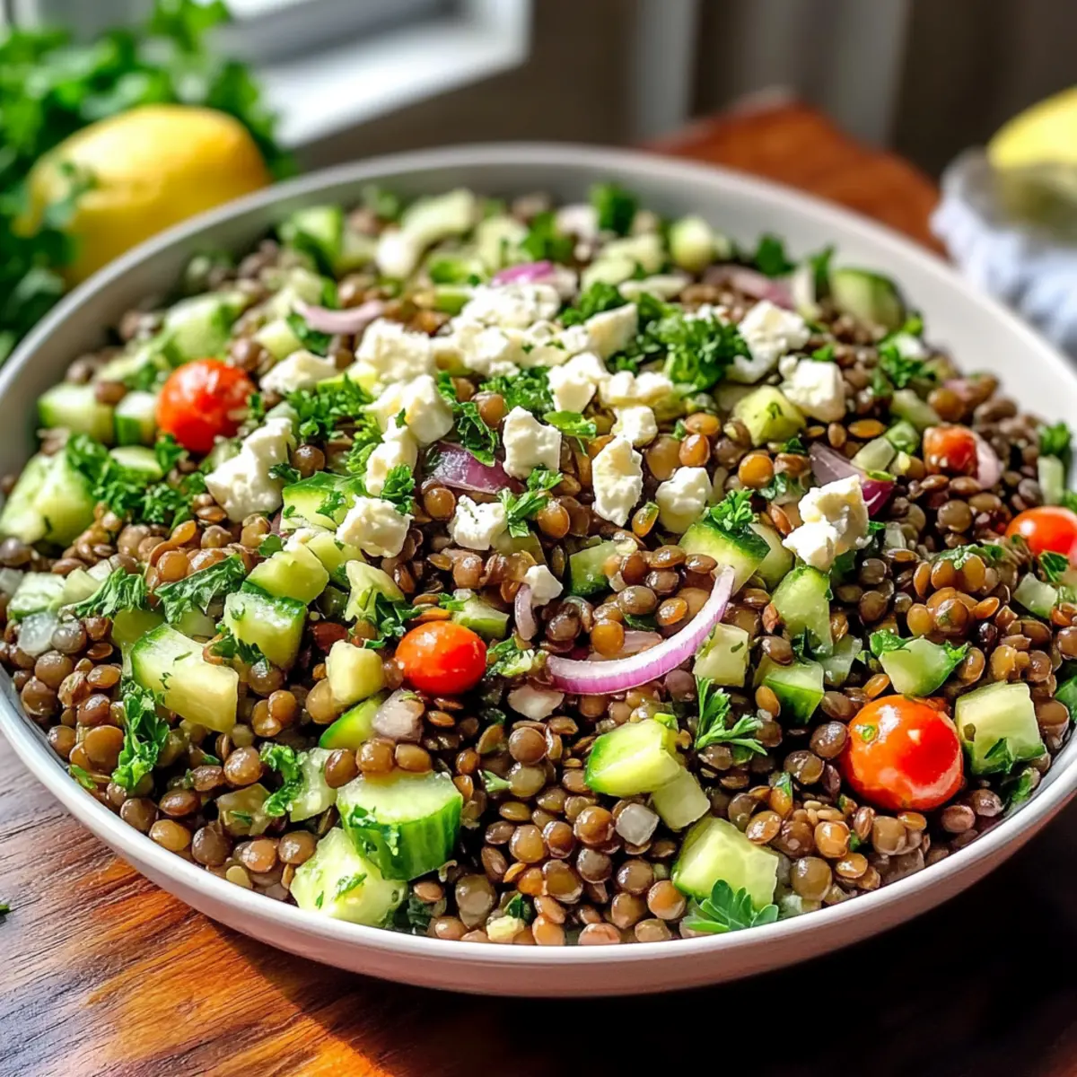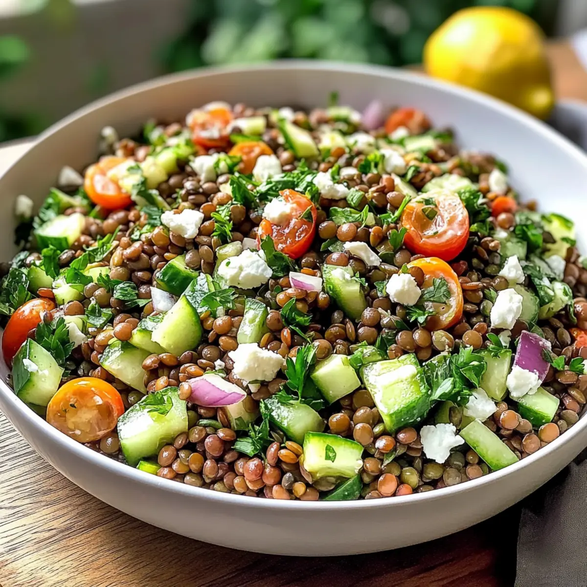 Ein geschäftiger Markt, die Sonne strahlt auf die bunten Stände – während ich durch die Gassen schlendere, bleibt ein unverwechselbarer Duft in der Luft hängen: frische Kräuter, sonnengereifte Tomaten und der verlockende Hauch von Zitrone. Diese Aromen haben mich direkt zu meinem heutigen Rezept für den Zitronigen Libanesischen Linsensalat inspiriert. Nicht nur bringt dieser salat eine erfrischende Abwechslung in die Welt der traditionellen Salate, er ist zudem gesund und proteinreich – perfekt für alle, die ihre Mahlzeiten ohne schweres Gefühl genießen möchten. Ob als Hauptgericht oder als Beilage zu gegrilltem Fleisch, dieser Salat ist ein köstlicher Weg, um frische Zutaten und mediterrane Aromen zu vereinen. Bist du bereit, deine Küche mit einem Hauch des Libanon zu bereichern? Lass uns gemeinsam die Zubereitung angehen! Warum wirst du diesen Salat lieben? Frische Aromen: Der Zitronige Libanesische Linsensalat vereint die zarten Aromen von frischen Kräutern und knackigem Gemüse zu einem Genuss, der das Gefühl von Sommer vermittelt. Nährstoffreich: Sein hoher Proteingehalt macht ihn ideal für eine gesunde Ernährung, perfekt für alle, die leicht und nährstoffreich speisen möchten. Einfach zuzubereiten: Mit nur wenigen Schritten und Zutaten ist dieser Salat ein wahrer Zeit-sparer in der Küche. Vielfältige Variationen: Du kannst ihn ganz nach deinem Geschmack anpassen, indem du beispielsweise geröstetes Gemüse oder saisonale Zutaten hinzufügst. Perfekt für Meal Prep: Bereite ihn im Voraus vor – er schmeckt sogar nach ein paar Stunden im Kühlschrank noch besser! Wenn du nach weiteren leckeren Rezepten suchst, probiere auch unsere Koreanischen BBQ Fleischbällchen oder genieße erfrischende BBQ Hühnchen Slider. Zutaten für Zitronigen Libanesischen Linsensalat • Für einen erfrischenden und gesunden Genuss, der sich perfekt für deine nächste Mahlzeit eignet, findest du hier die Zutaten. Für die Linsen Linsen – Verwende braune oder französische grüne Linsen, um die beste Textur zu erzielen. Rote oder gelbe Linsen werden schnell matschig. Salz – Ein unverzichtbares Gewürz für die richtige Würze; achte darauf, die Menge an deinen persönlichen Geschmack anzupassen. Für das Gemüse Petersilie – Für frischen Geschmack; hacke sie fein in 1/4-Zoll-Stücke, um eine gleichmäßige Verteilung zu gewährleisten. Rote Zwiebel – Sorgt für Süße und einen knackigen Biss; würfele sie fein, um die Aromen im Salat auszubalancieren. Cherrytomaten – Fügen Saftigkeit und Süße hinzu; halbiere sie längs für eine ansprechende Präsentation. Gurke – Bringt eine knackige Textur; schneide sie in 1/2-Zoll große Würfel, um den Biss zu erhalten. Für das Dressing Olivenöl – Verleiht dem Salat eine cremige Textur; extra natives Öl ist am besten für Aroma und gesundheitliche Vorteile. Zitronensaft – Sorgt für Frische; frisch gepresst ist optimal für den besten Geschmack. Gemahlener Kreuzkümmel – Gibt eine warme, erdige Note; passe die Menge nach deinem Geschmack an. Pfeffer – Ergänzt die Würze; sollte ebenfalls nach Belieben hinzugefügt werden. Getrocknete Minze – Fügt eine frische, kräuterige Note hinzu. Für den besonderen Kick Feta-Käse – Sorgt für Cremigkeit und einen salzigen Kontrast; chunkierter Feta von Präsident eignet sich hervorragend für die Textur. Dieser Zitronige Libanesische Linsensalat ist eine wahre Freude für Liebhaber gesunder und köstlicher Speisen! Schritt-für-Schritt-Anleitung für Zitronigen Libanesischen Linsensalat Step 1: Linsen kochen Spüle die Linsen gründlich unter kaltem Wasser ab und koche sie mit 4 Tassen Wasser in einem großen Topf. Lass sie etwa 20-25 Minuten lang auf mittlerer Hitze köcheln, bis sie zart, aber fest sind. Gieße die Linsen in ein Sieb ab und lass sie auf Raumtemperatur abkühlen. Step 2: Gemüse vorbereiten Während die Linsen kochen, schneide die rote Zwiebel und die Gurke in kleine Würfel. Halbiere die Cherrytomaten längs und hacke die Petersilie fein in 1/4-Zoll-Stücke. Halte die verschiedenen Gemüsesorten getrennt, damit du sie später gleichmäßig im Zitronigen Libanesischen Linsensalat kombinieren kannst. Step 3: Dressing zubereiten In einer kleinen Schüssel vermischst du 1/3 Tasse Olivenöl, 1/4 Tasse frisch gepressten Zitronensaft, 1 Teelöffel gemahlenen Kreuzkümmel sowie Salz und Pfeffer nach Geschmack. Schlage alles mit einem kleinen Schneebesen gründlich durch, bis sich die Zutaten emulgieren und eine cremige Konsistenz entsteht. Step 4: Alles kombinieren Sobald die Linsen vollständig abgekühlt sind, gib sie in eine große Schüssel. Füge das vorbereitete Gemüse hinzu und gieße das Dressing darüber. Vermische alles sanft, bis die Linsen und das Gemüse gleichmäßig mit dem Dressing überzogen sind und der Zitronige Libanesische Linsensalat einladend aussieht. Step 5: Kühlen Decke die Schüssel mit Frischhaltefolie ab und stelle den Salat für mindestens 30 Minuten in den Kühlschrank. Dies ermöglicht, dass die Aromen sich entfalten und intensivieren. Der kühle, frische Geschmack wird den Zitronigen Libanesischen Linsensalat noch köstlicher machen, wenn du ihn servierst. Meal Prep für deinen Zitronigen Libanesischen Linsensalat Das Zubereiten des Zitronigen Libanesischen Linsensalats im Voraus ist nicht nur zeitsparend, sondern auch eine tolle Möglichkeit, gesunde Mahlzeiten für die Woche vorzubereiten. Du kannst die Linsen bis zu 3 Tage im Voraus kochen und dann im Kühlschrank aufbewahren, sodass sie frisch bleiben und nicht matschig werden. Auch das Gemüse wie rote Zwiebel, Gurke und Cherrytomaten kannst du bis zu 24 Stunden vorher schneiden und in separaten Behältern aufbewahren, um Knackigkeit zu garantieren. Sobald du bereit bist, den Salat zu servieren, mische die abgekühlten Linsen mit dem vorbereiteten Gemüse und dem Dressing – so bleibt der Salat genau so frisch und lecker wie am ersten Tag! Tipps für den besten Zitroni